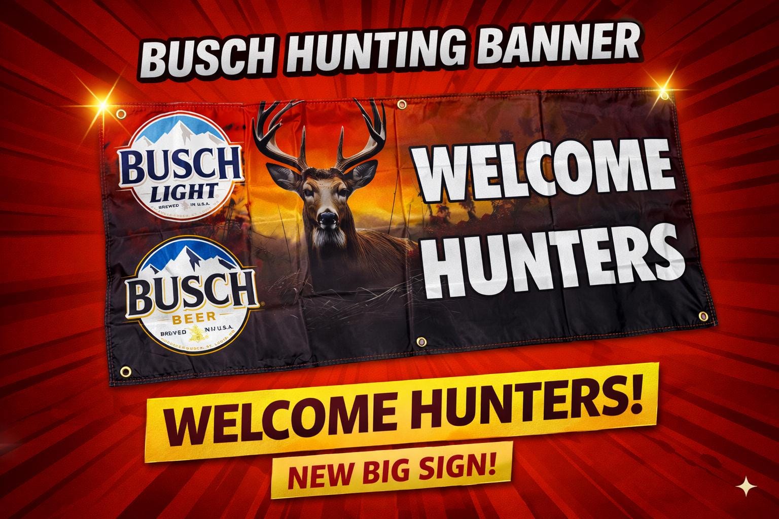 Welcome hunting season in classic outdoor style with this Busch / Busch Light “Welcome Hunters” banner. Designed for hunting camps, cabins, garages, man caves, and bars, this large 2x6 ft polyester banner delivers bold visibility and rugged lodge vibes.