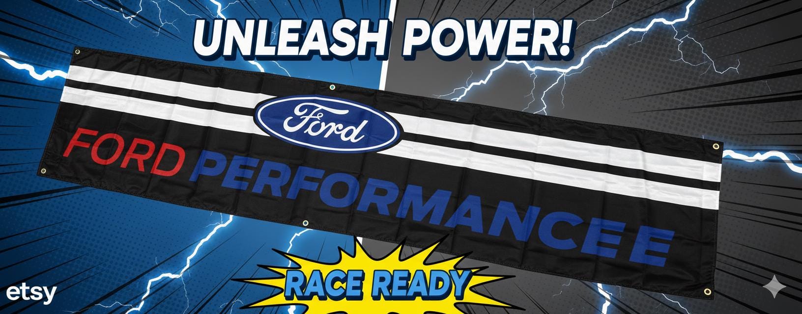 Upgrade your garage, shop, or mancavedecor with this bold Ford Performance Racing Banner printed on durable polyester fabric. This large 2ft x 8ft banner is the perfect statement piece for automotive enthusiasts, Ford collectors, and racing-themed spaces.