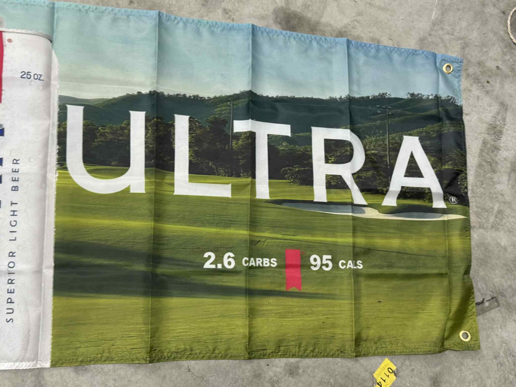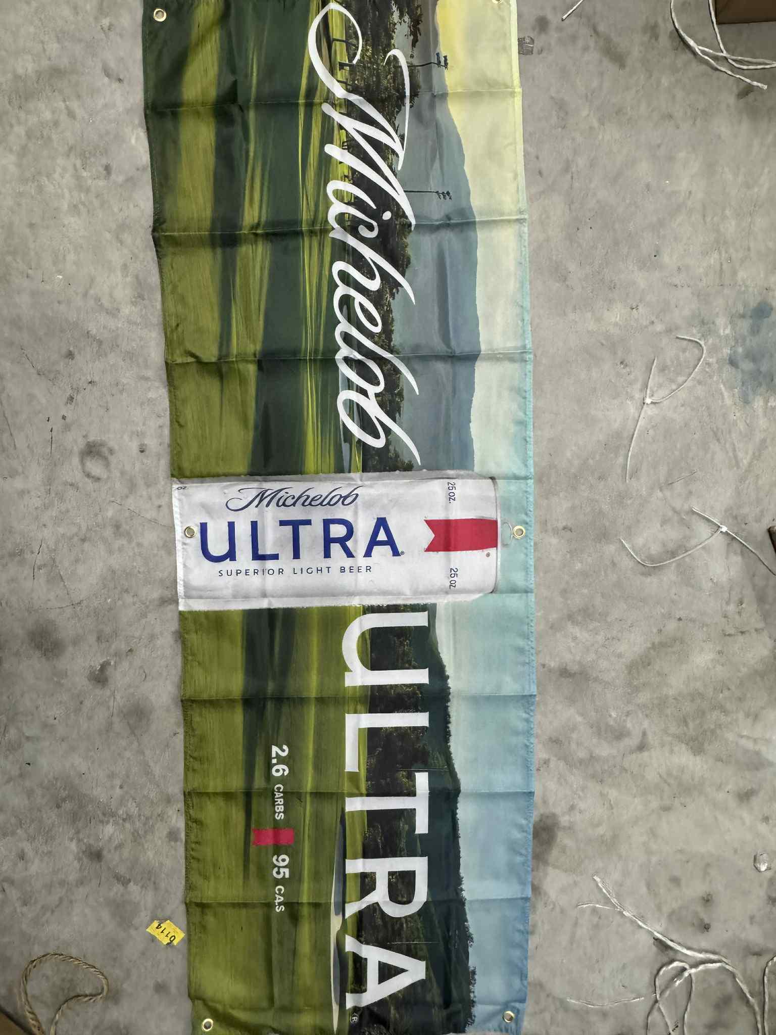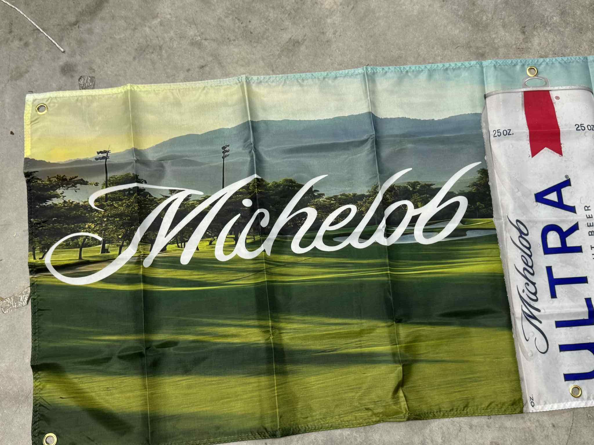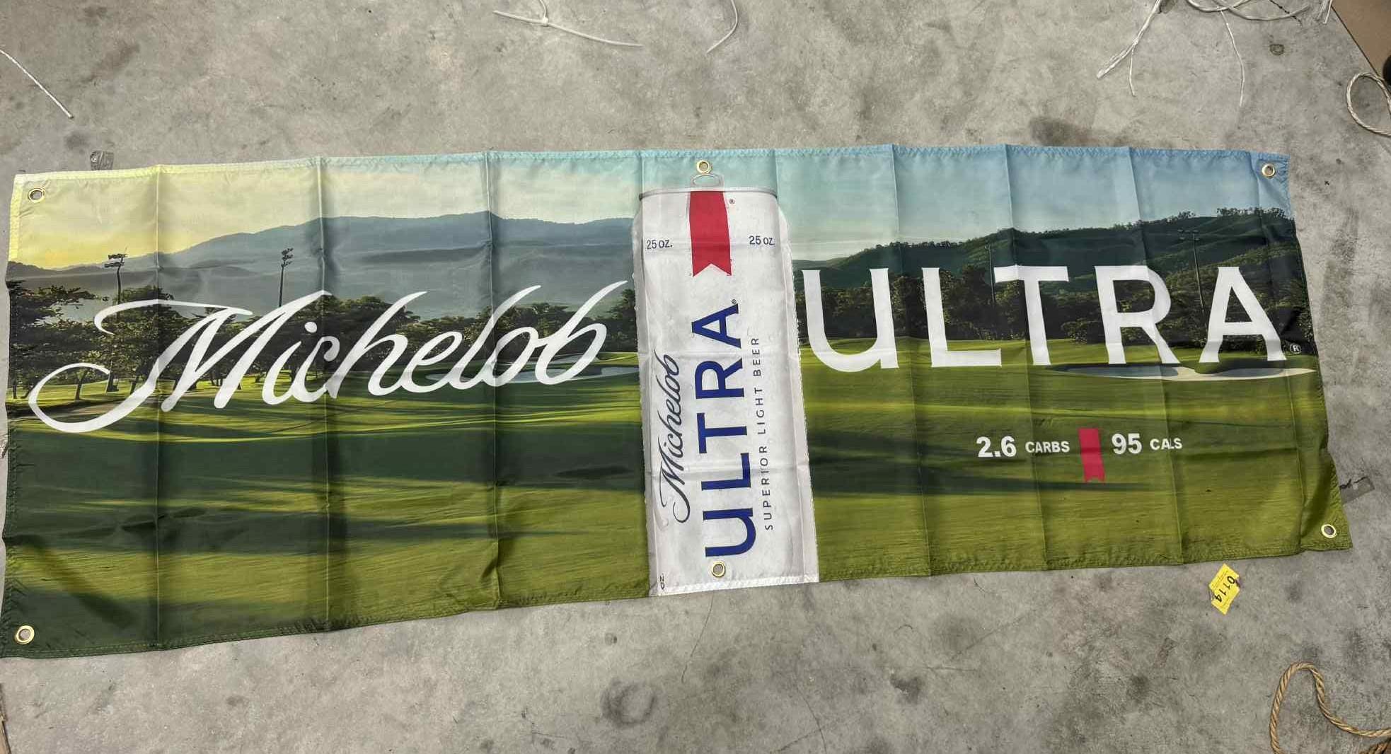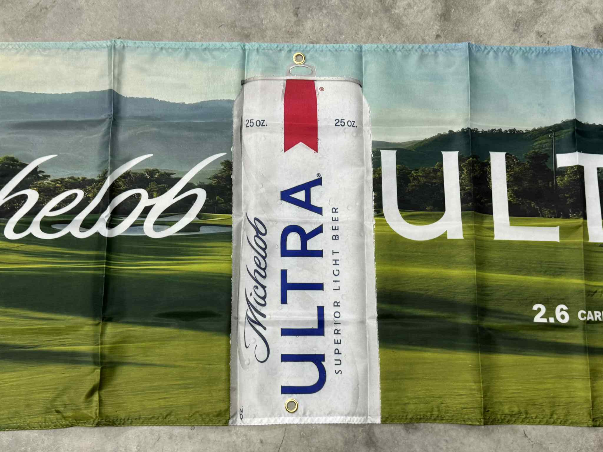 Bring premium golf-course vibes to your space with this Michelob Ultra 2x6 FT fabric banner. Lightweight and vibrant, this polyester display features a full golf-course scene with a large Michelob Ultra can and bold branding. Perfect for home bars, mancaves, garages, gyms, beer collectors, and golf lovers.
