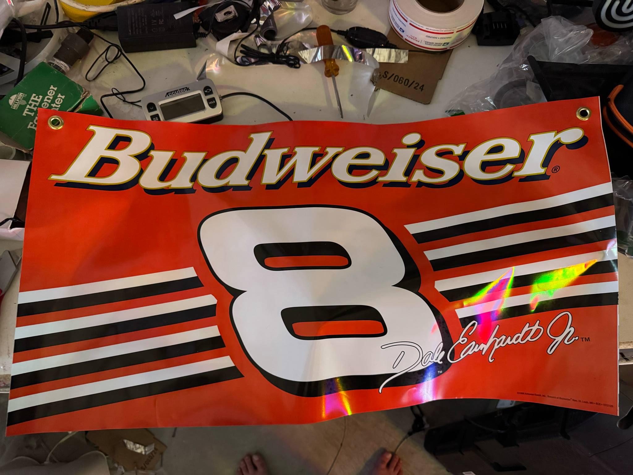 Celebrate NASCAR history with this vintage Budweiser #8 banner featuring Dale Earnhardt Jr. Bold red design with the iconic number 8 and Jr.'s printed signature—this banner is a standout piece for any racing enthusiast.