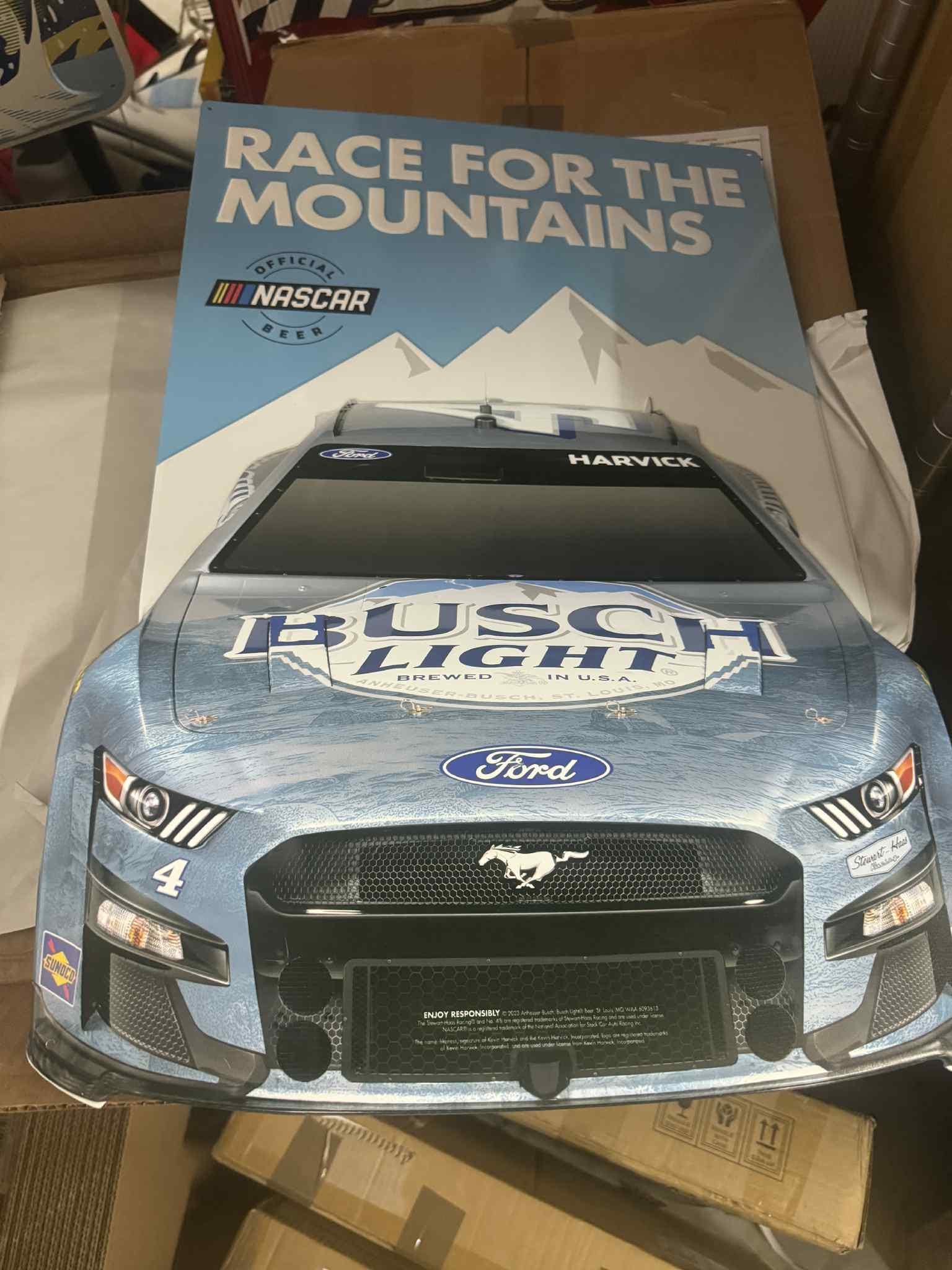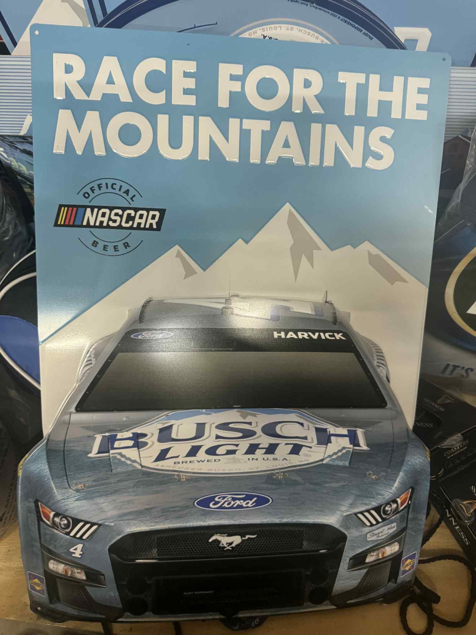 Show your racing pride with this Busch Light NASCAR tin sign featuring Kevin Harvick’s #4 Ford Mustang. With the bold slogan “Race for the Mountains”, this sign was officially licensed as a promotional piece for NASCAR and Busch Light.