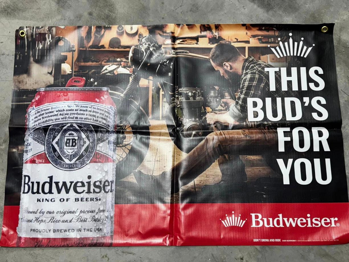 Bring garage style and beer culture together with this Budweiser motorcycle banner featuring the iconic slogan “This Bud’s For You.” Perfect for bar walls, workshops, or mancaves, this piece celebrates craftsmanship, cold beer, and classic American grit.