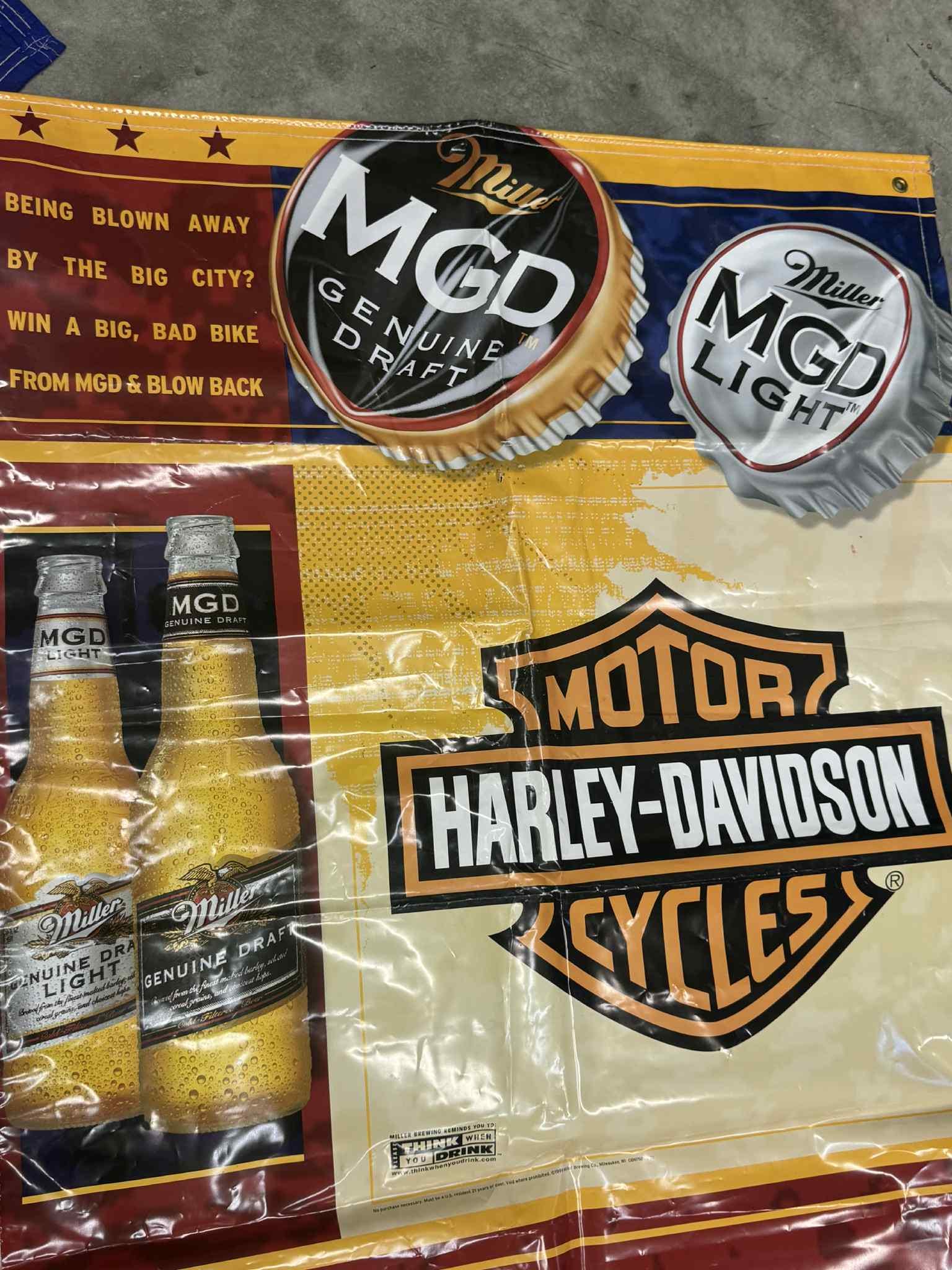 Made of heavy plastic PVC with corner holes, this large 3x6 ft banner showcases MGD bottles, the Harley-Davidson shield, and bold retro graphics.