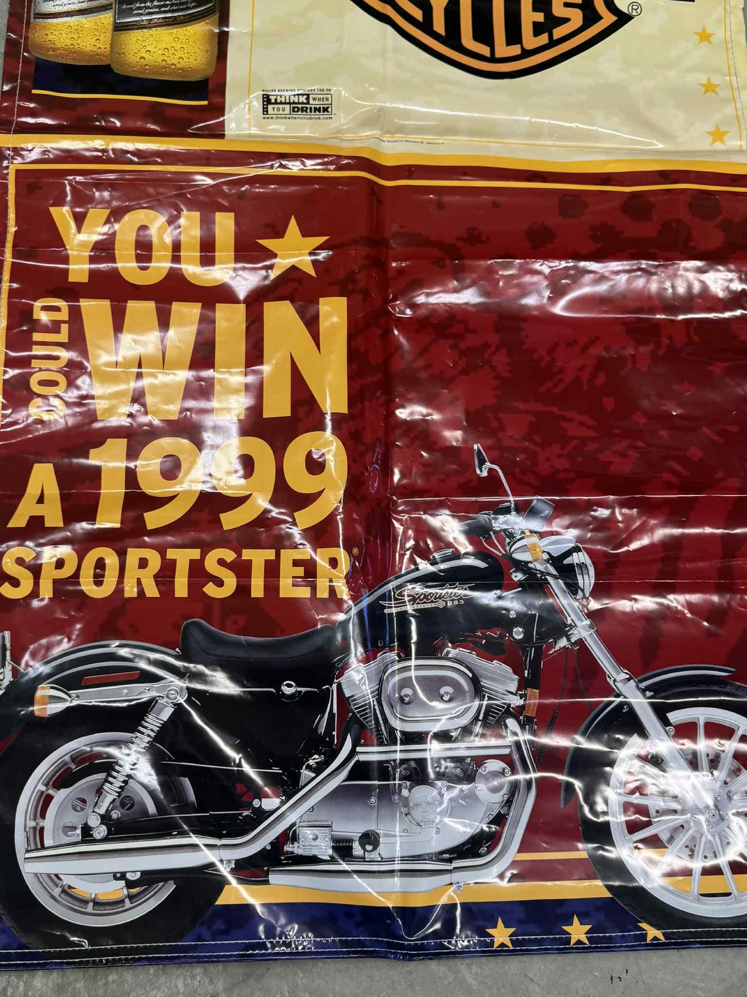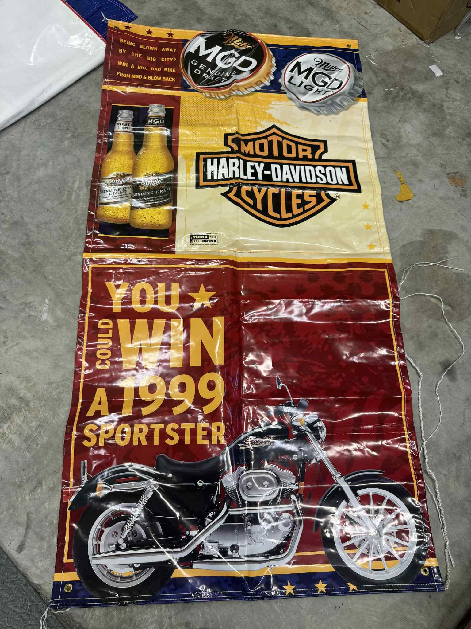 Authentic Miller Genuine Draft x Harley-Davidson promotional banner, featuring the iconic 1999 Sportster giveaway design!