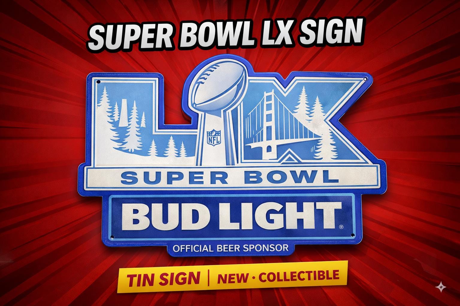Celebrate the Super Bowl LX with this officially licensed Bud Light Beer metal sign — the 2026 NFL edition featuring the Golden Gate Bridge and Bud Light’s bold blue-and-silver colorway.