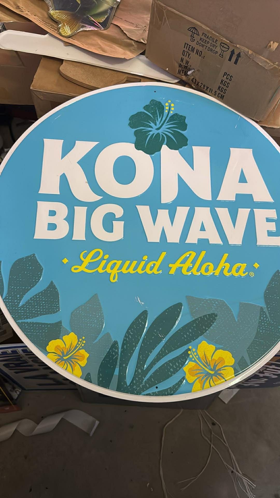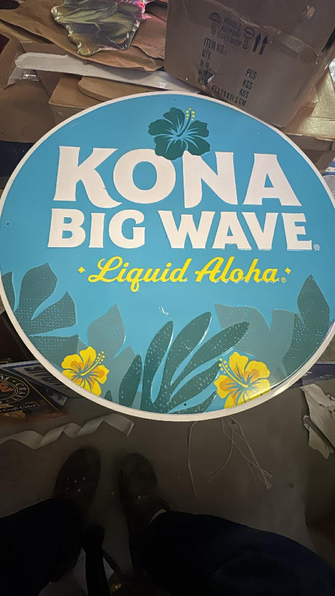 Bring a wave of island vibes to your home bar or beachside decor with this Kona Big Wave “Liquid Aloha” 24-inch round metal sign.