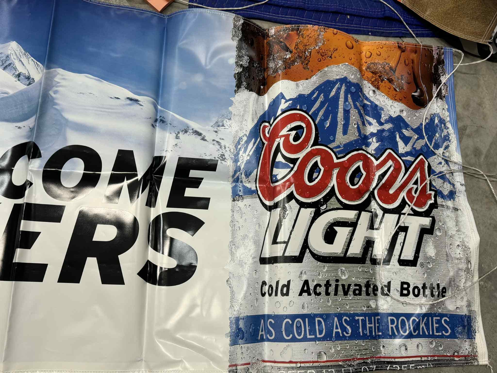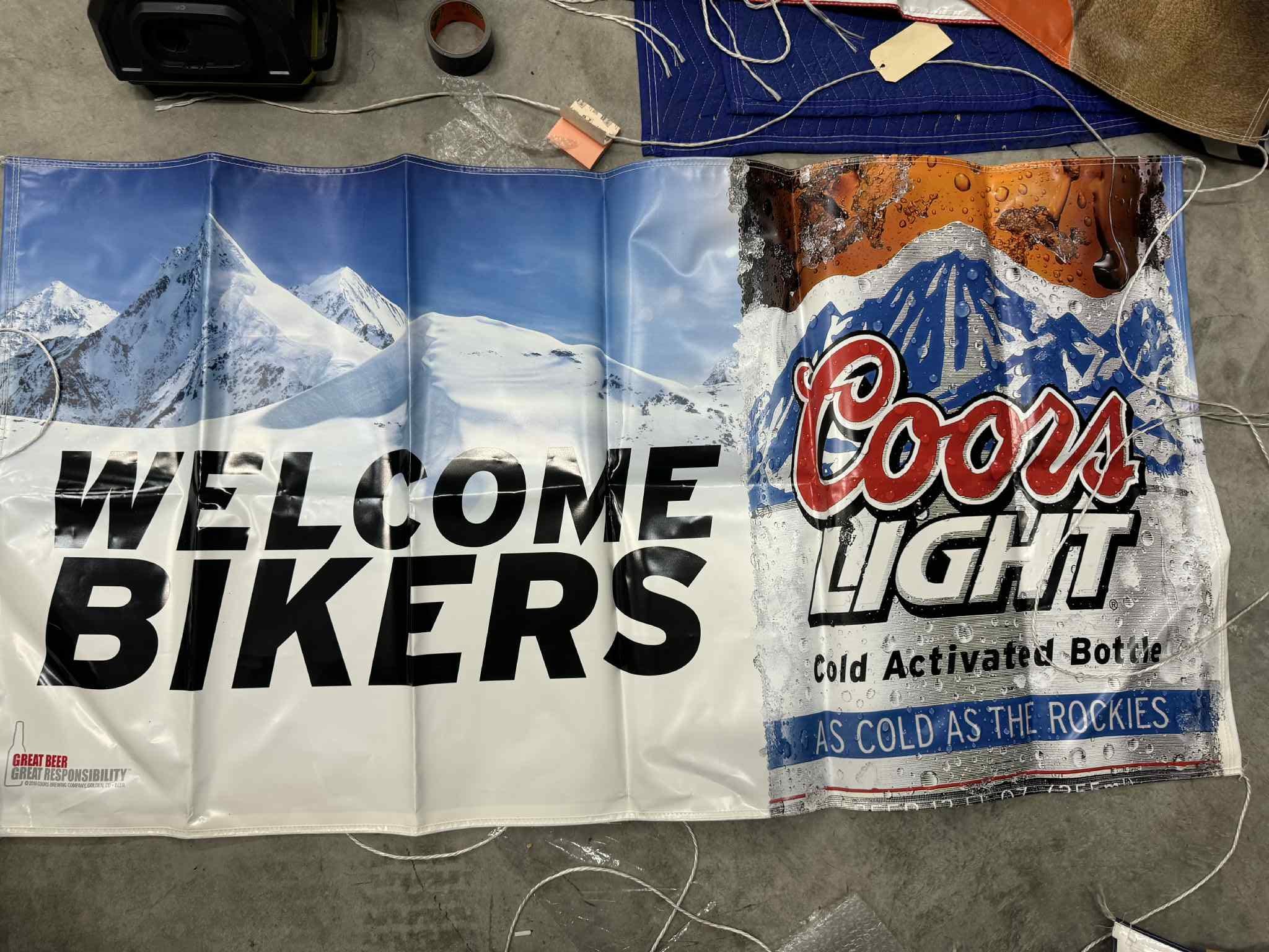 This 3x5 ft promotional banner was issued to bars and distributors for biker rally season (Daytona, Sturgis, and regional Coors Light events). Made of heavy PVC with stitched edges and built-in hanging strings — designed to last outdoors or in high-traffic bars.