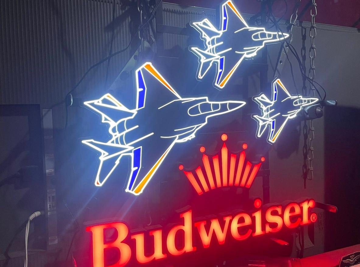 Bring some high-flying energy into your bar or mancavedecor setup with this Budweiser Fighter Jets LED Neon Sign. Featuring three fighter jets soaring above the bold red Budweiser logo, this sign lights up in vivid red, white, and blue—perfect for any American-themed bar, garage, or collector display.