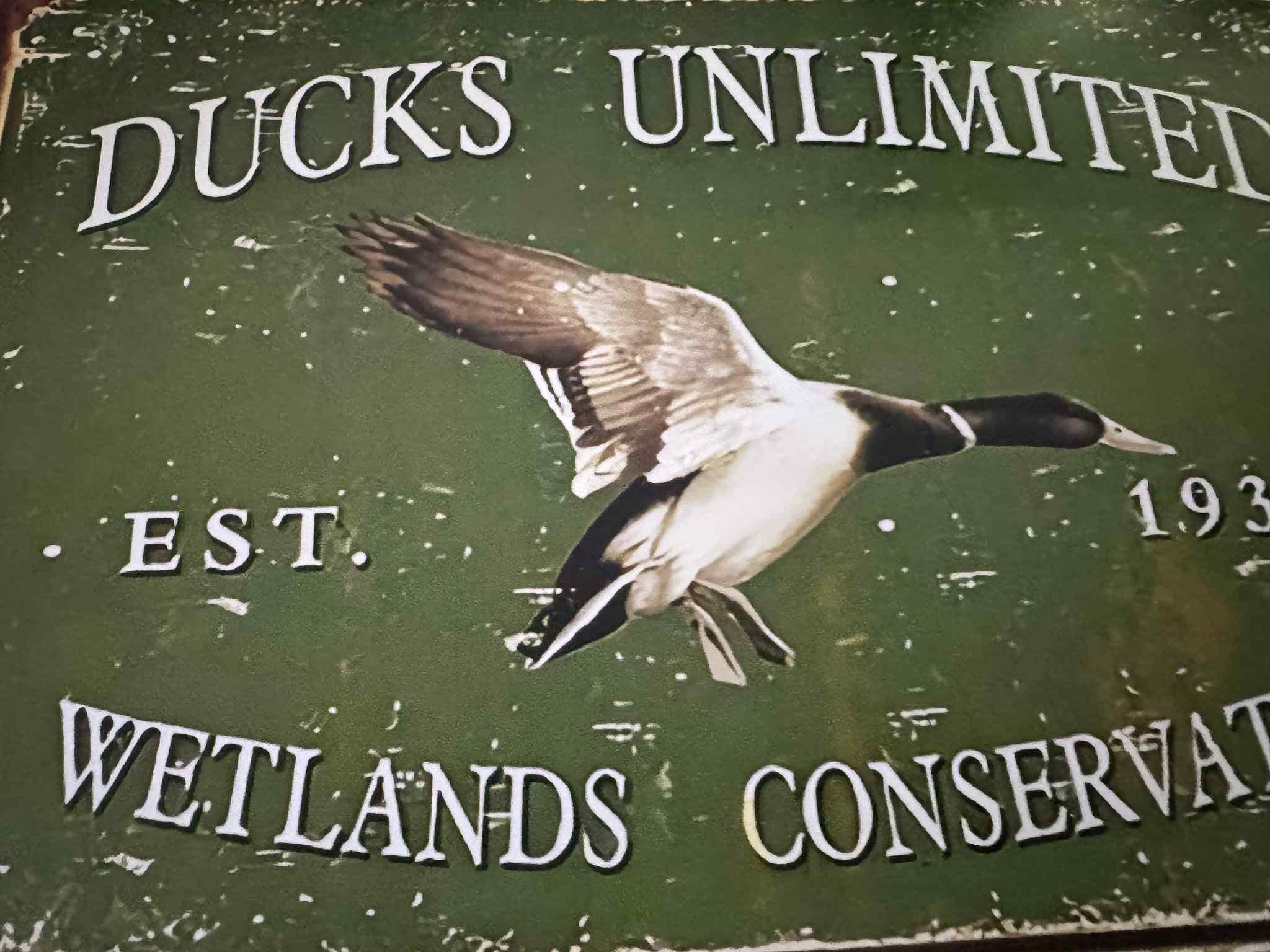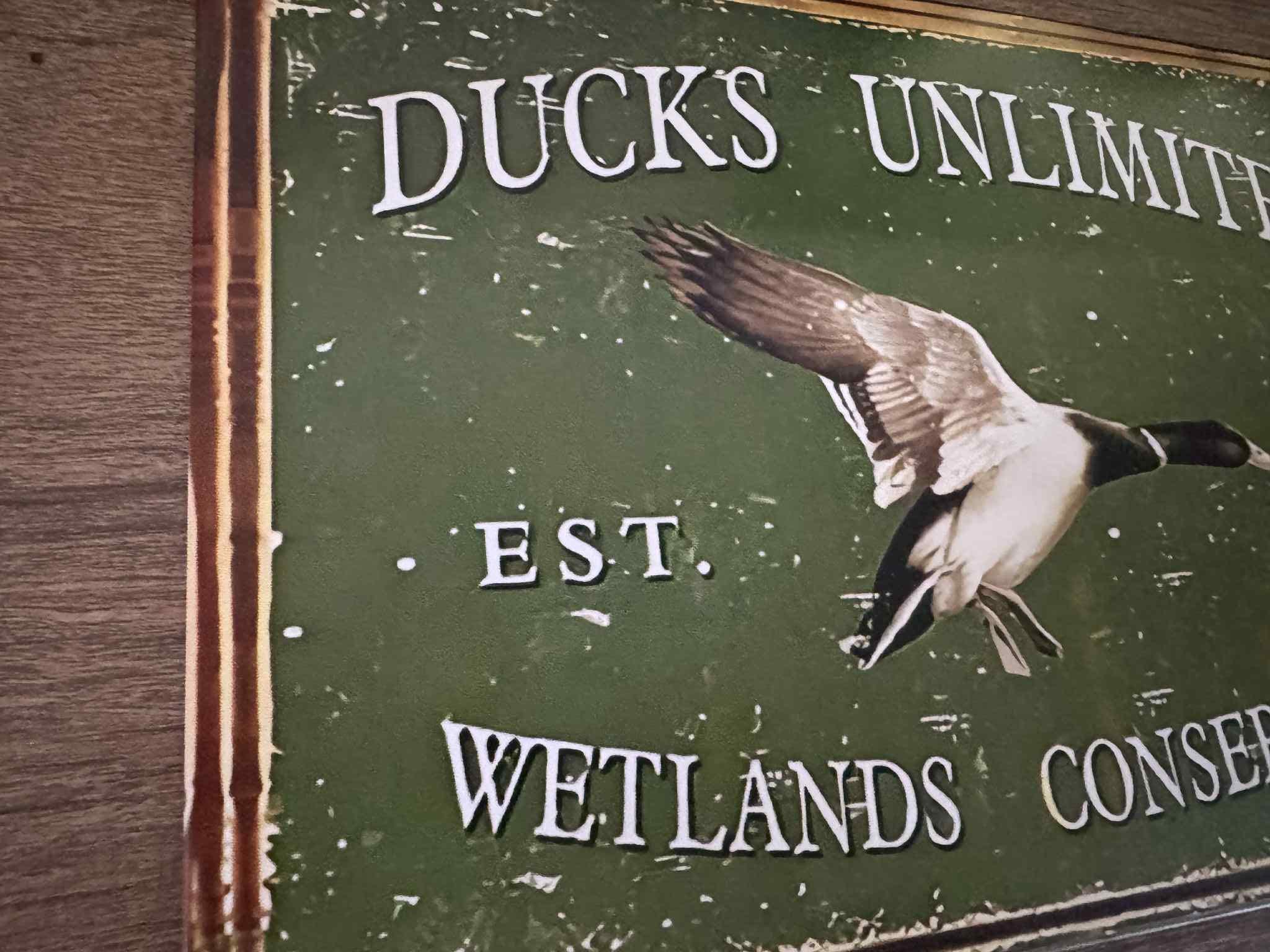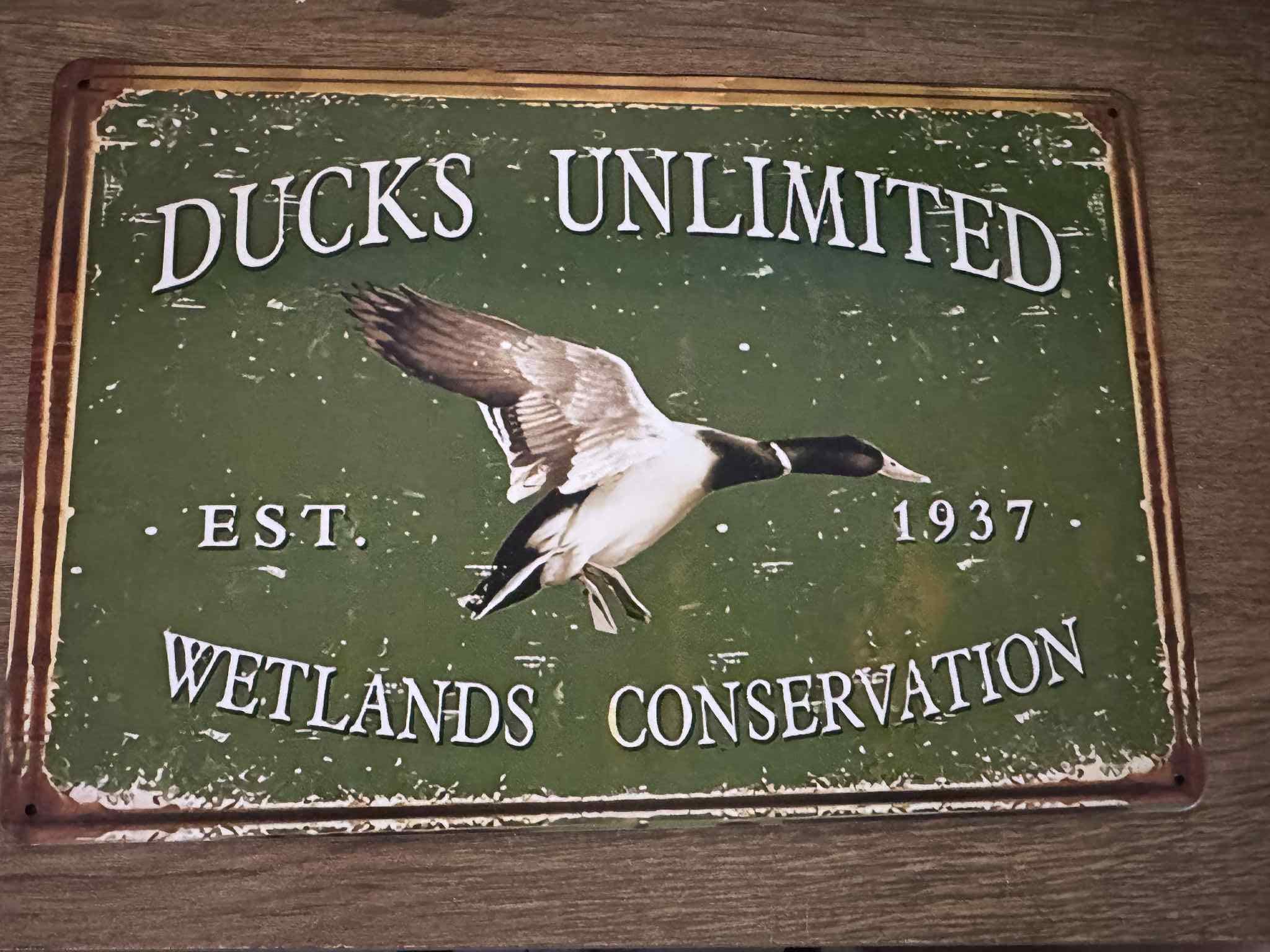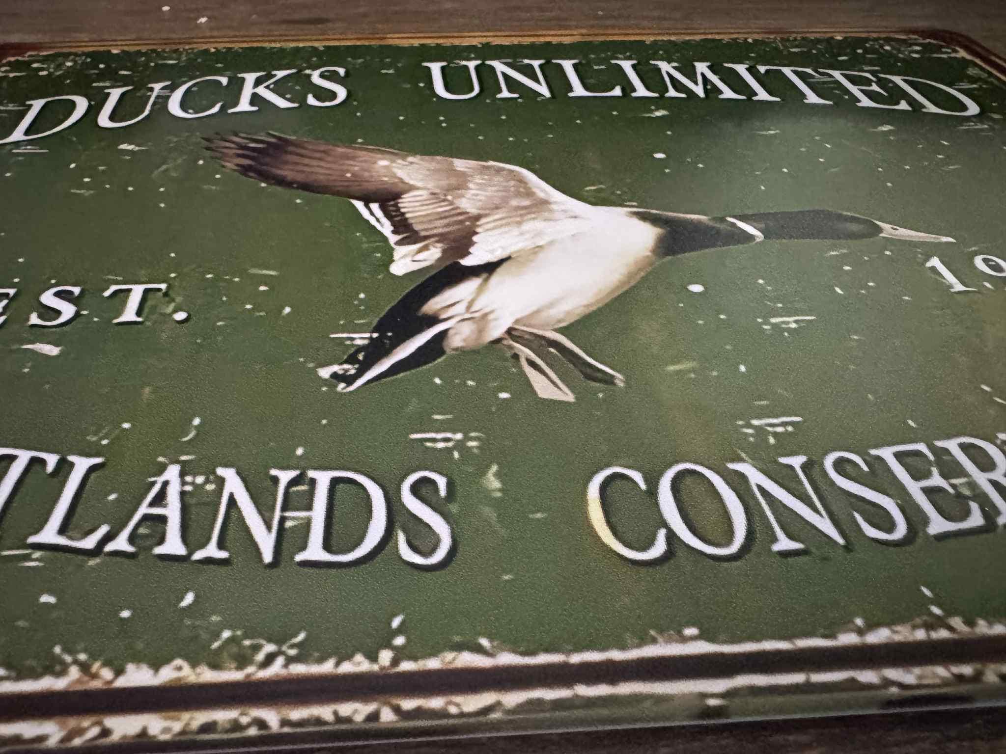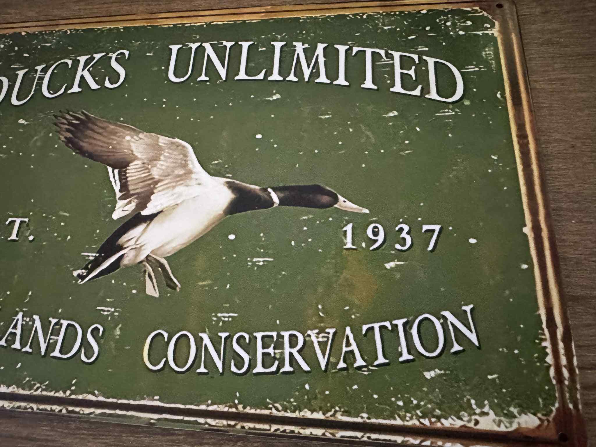 Celebrate the spirit of wetland conservation with this new Ducks Unlimited reproduction metal sign, inspired by the classic 1937 design.