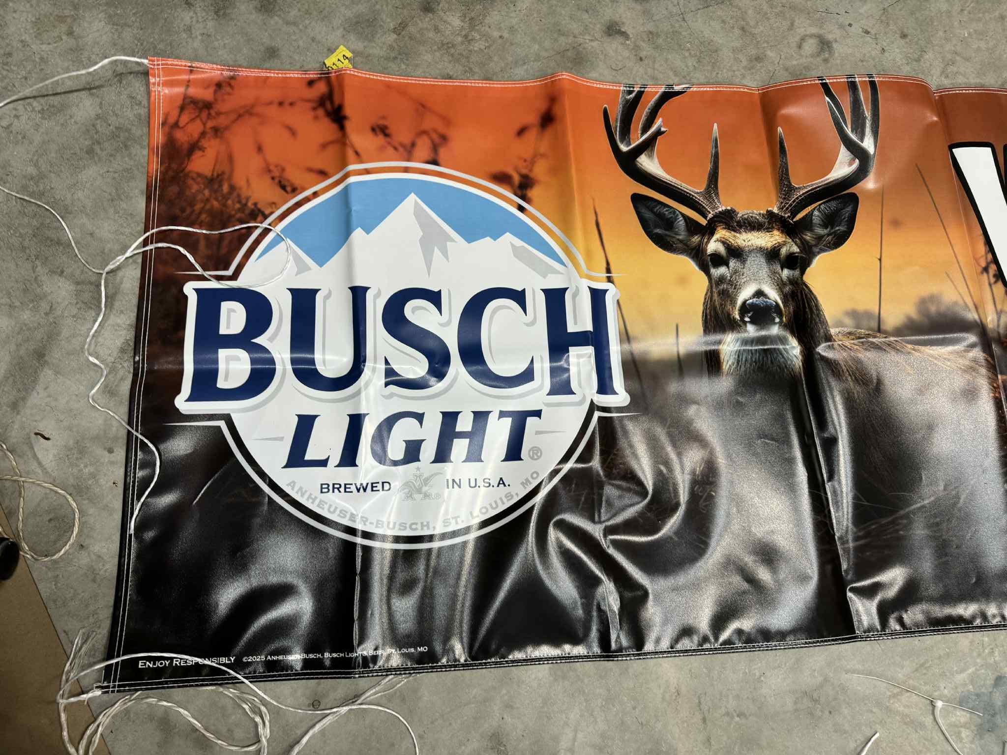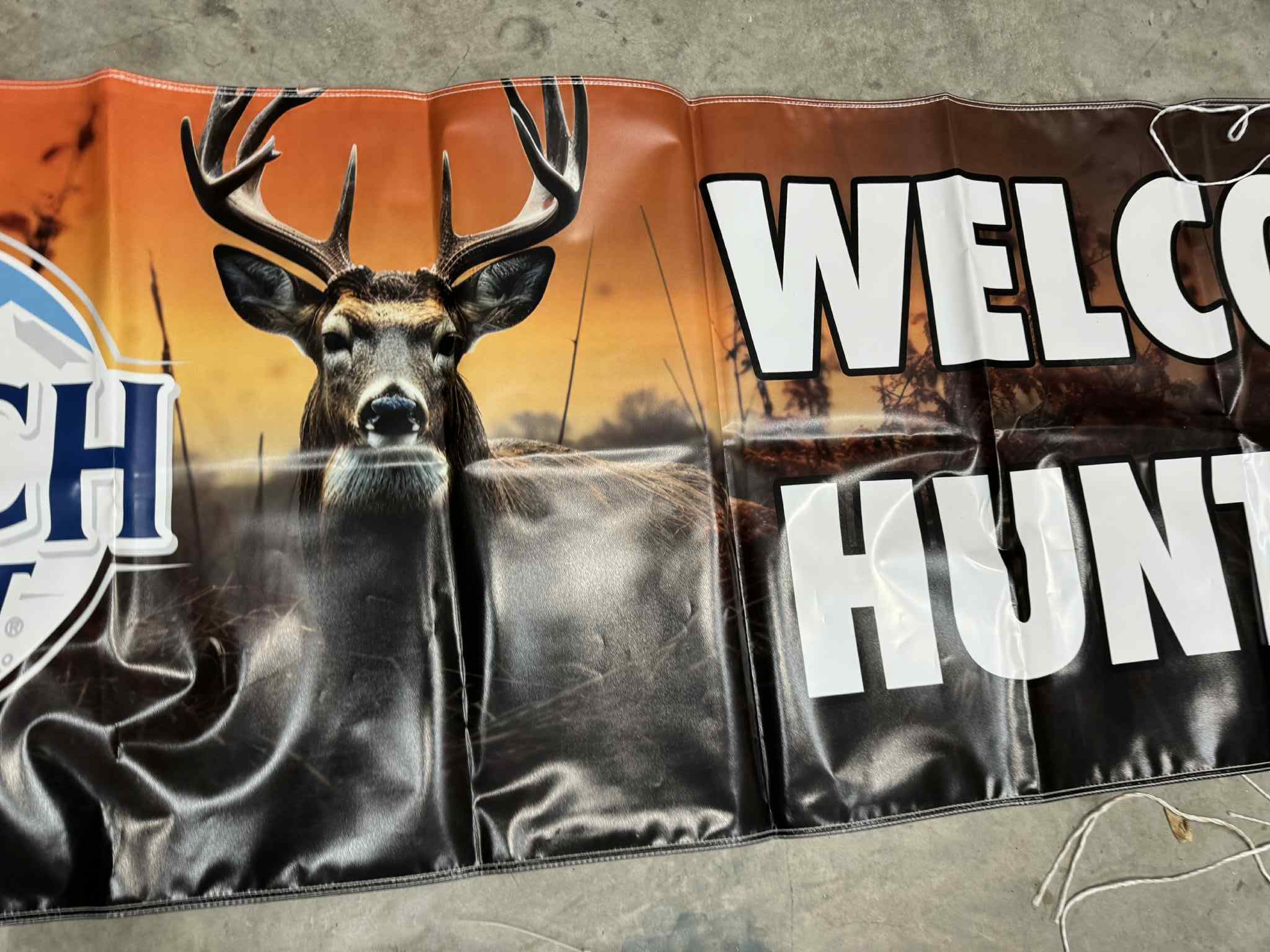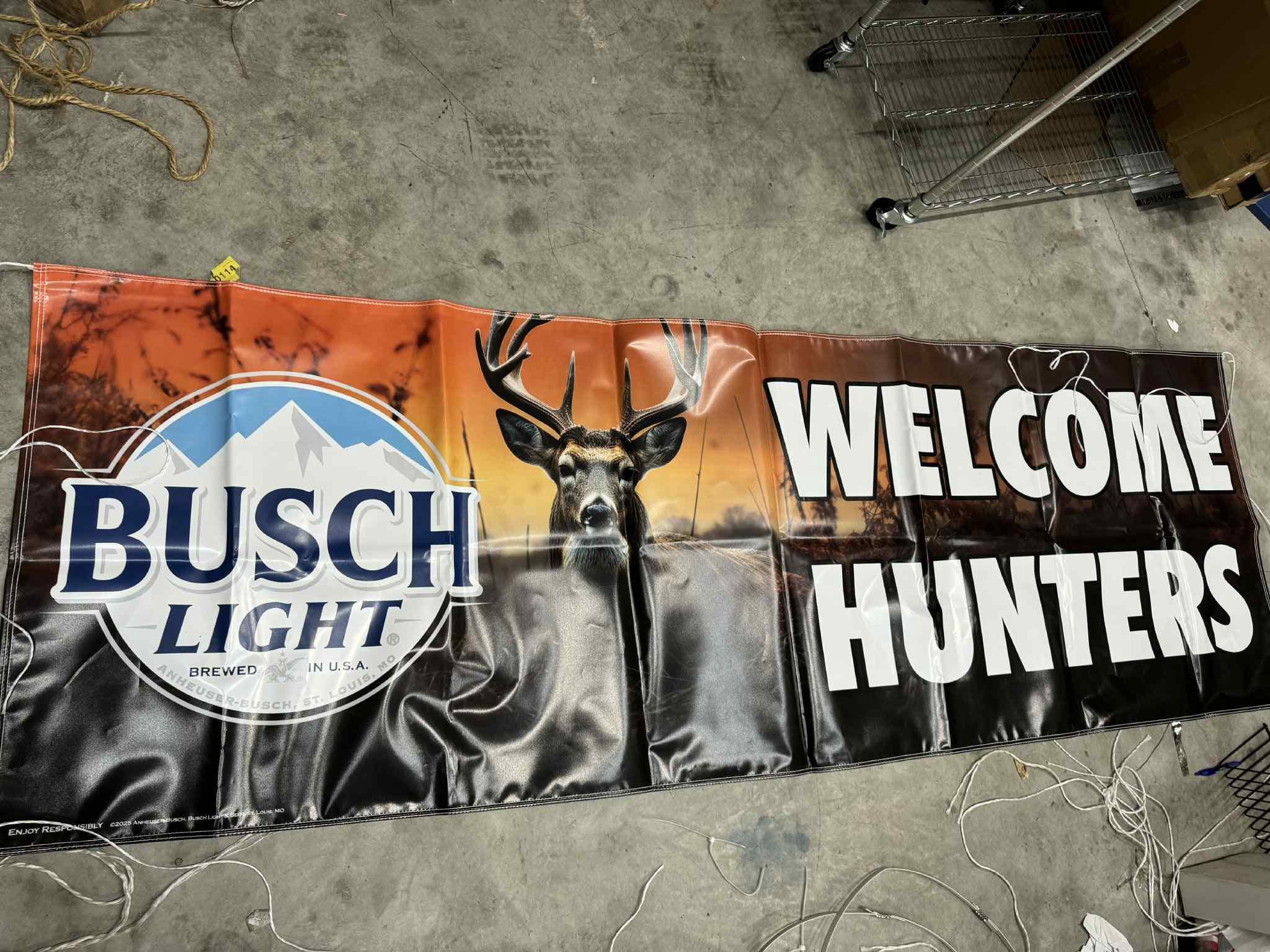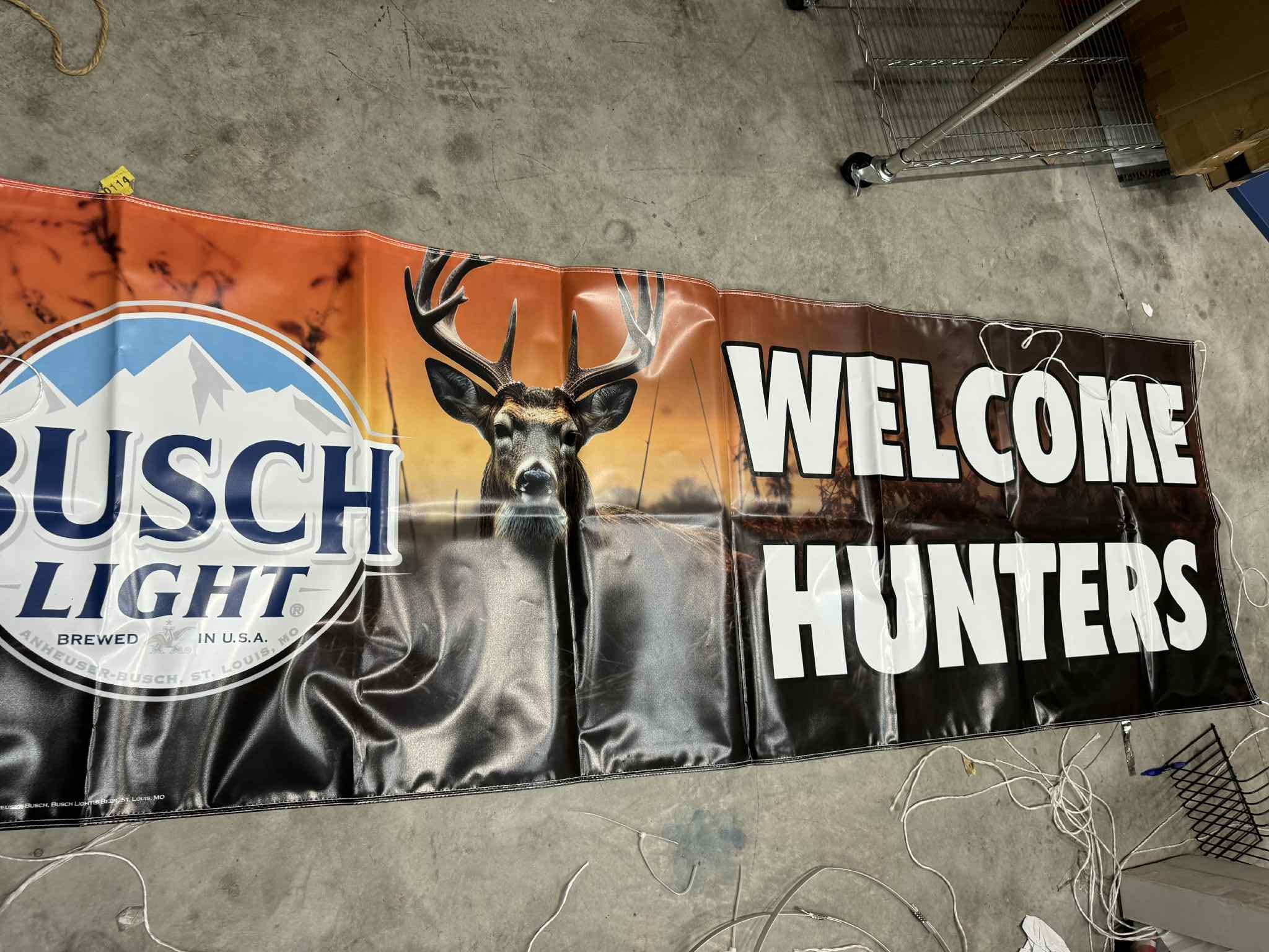 This outdoor banner is perfect for all the hunting enthusiasts out there! It features a "Welcome Hunters" message and the Busch Lite logo, making it a great addition to any hunting lodge or cabin. Measuring 3x8ft, this banner is large enough to catch the attention of your guests, while still being easy to hang and display.