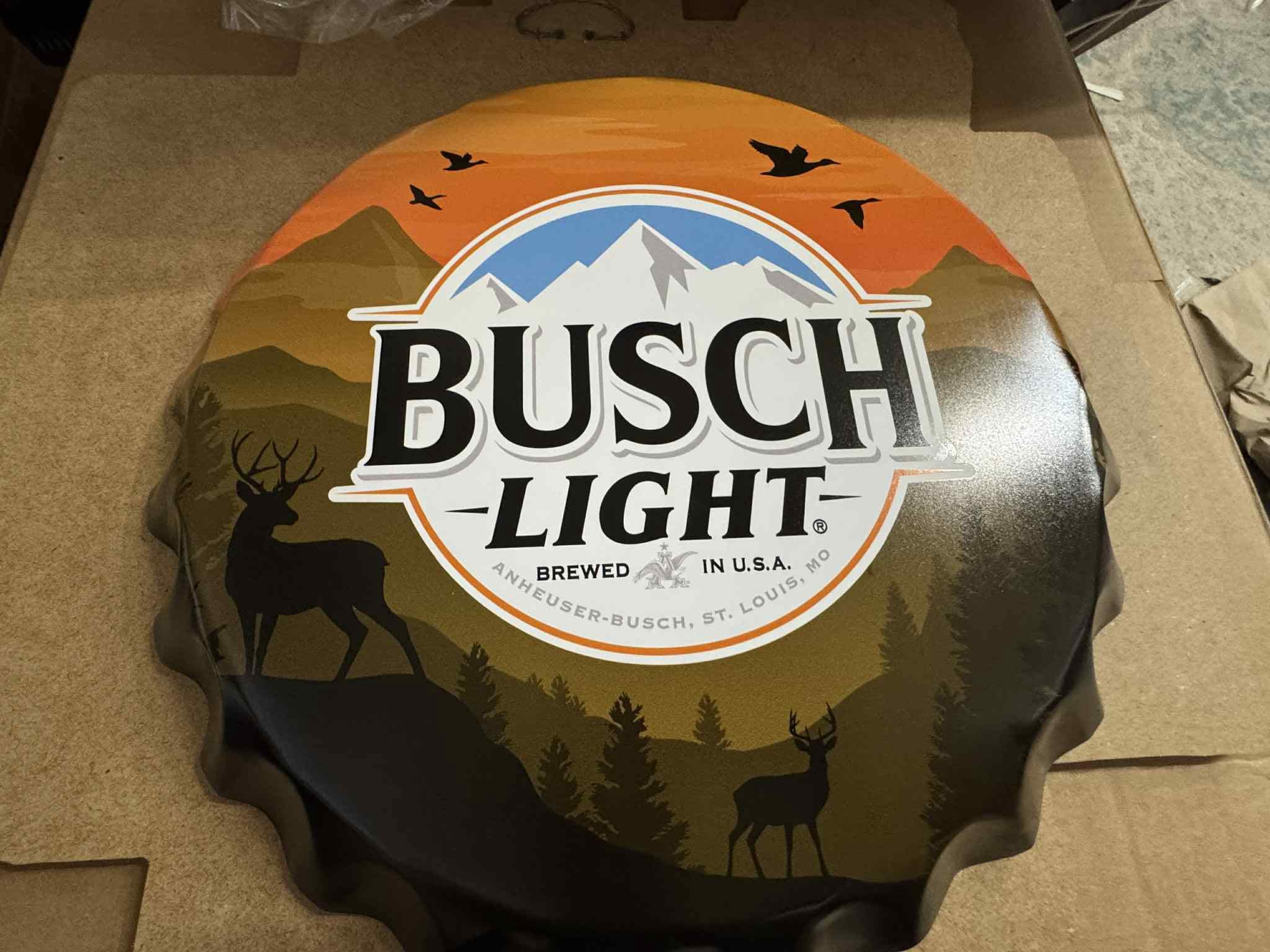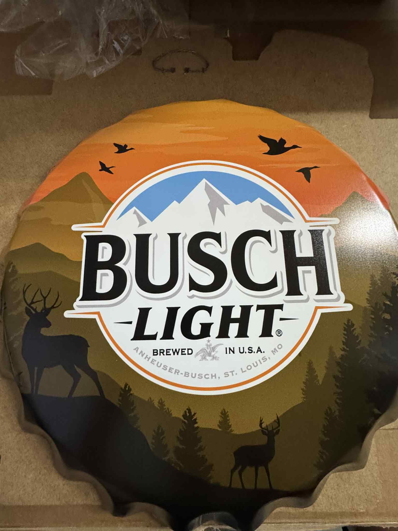Add a bold dose of outdoorsman style to your mancavedecor with this Busch Light 18-inch Bottle Cap Tin Sign, featuring a hunting-inspired silhouette design with deer, trees, birds, and a sunset mountain backdrop.