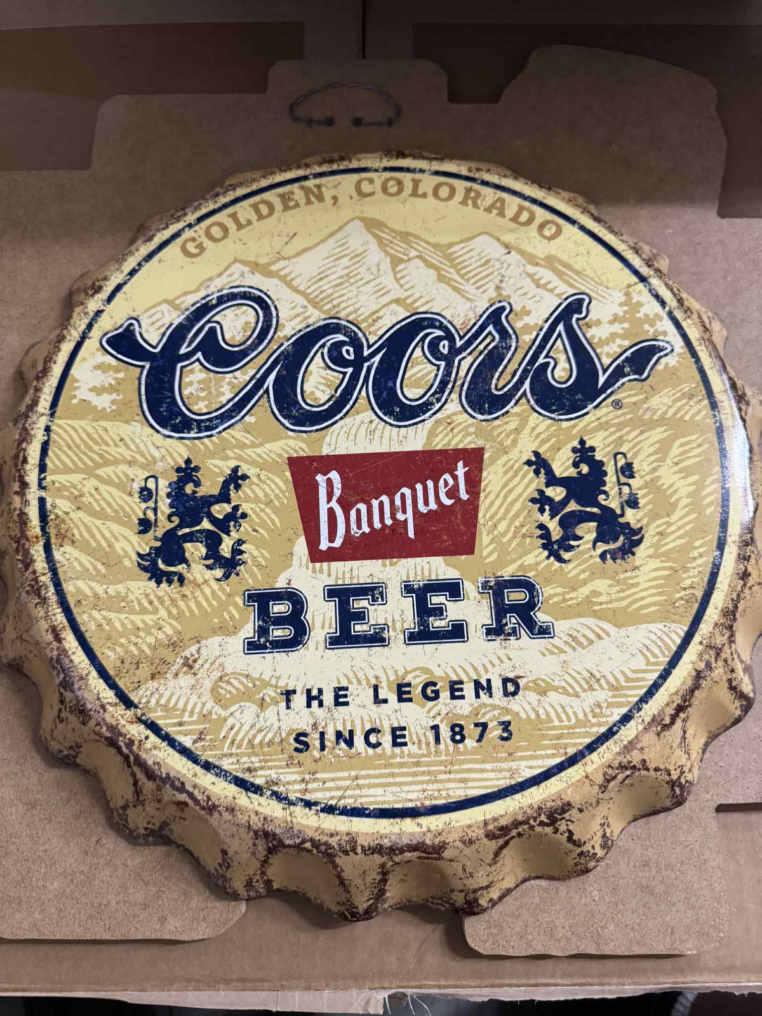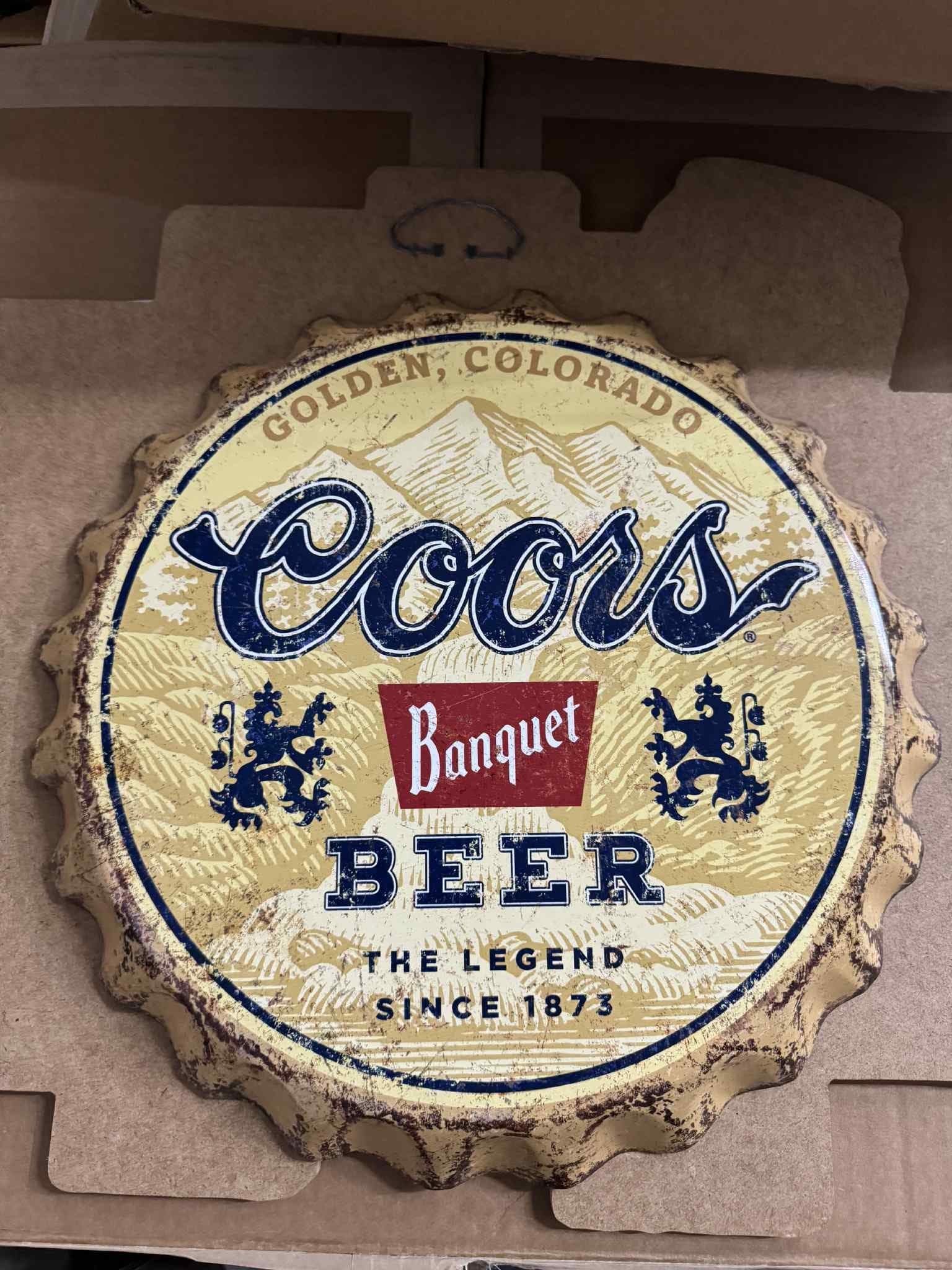 Bring classic Western beer history into your home bar or mancavedecor with this 18-inch Coors Banquet Bottle Cap Tin Sign, styled after the original Golden, Colorado brewery artwork. This piece features the iconic Coors script, Banquet shield, mountain scene, and distressed edges for a vintage look.