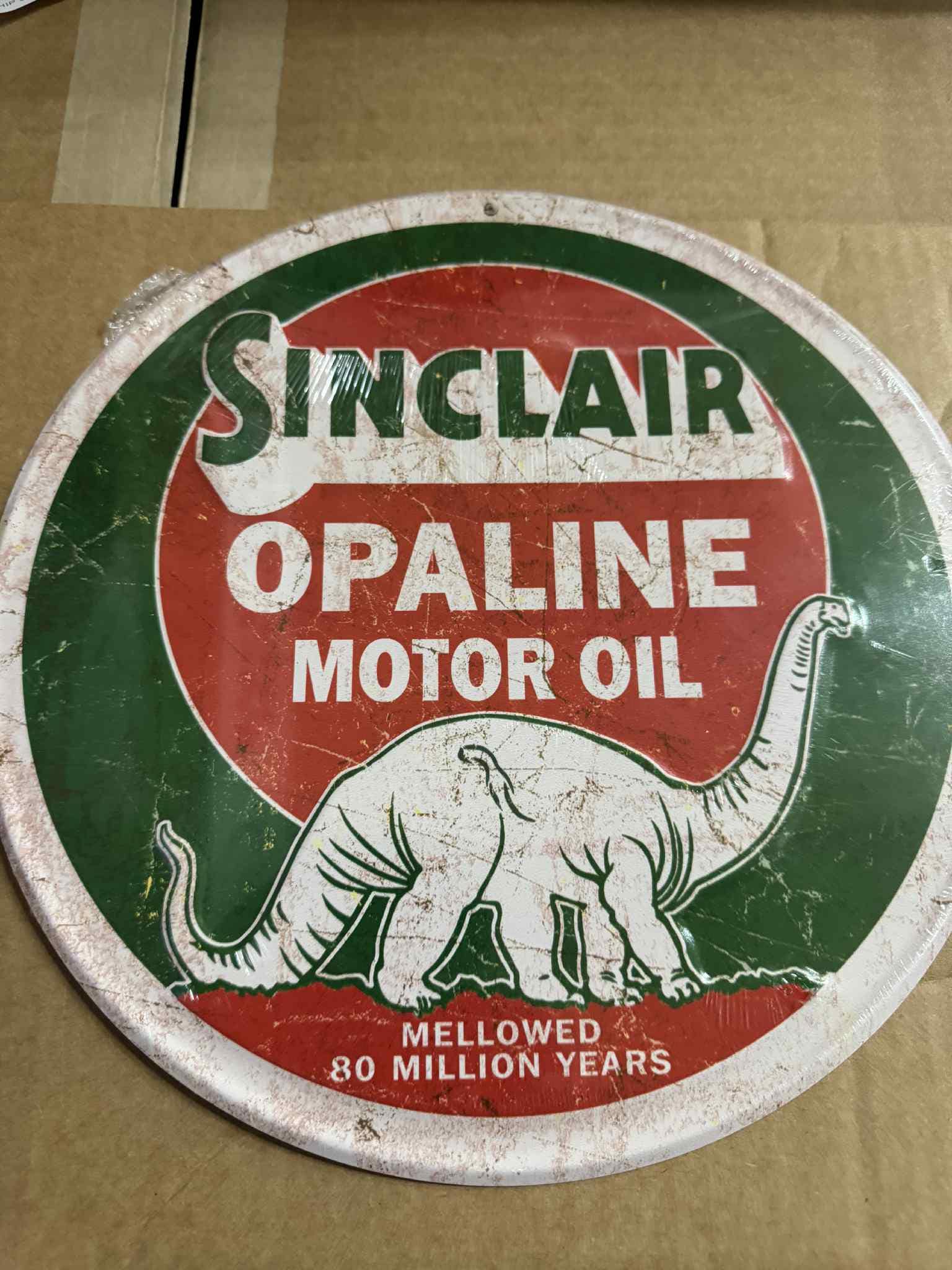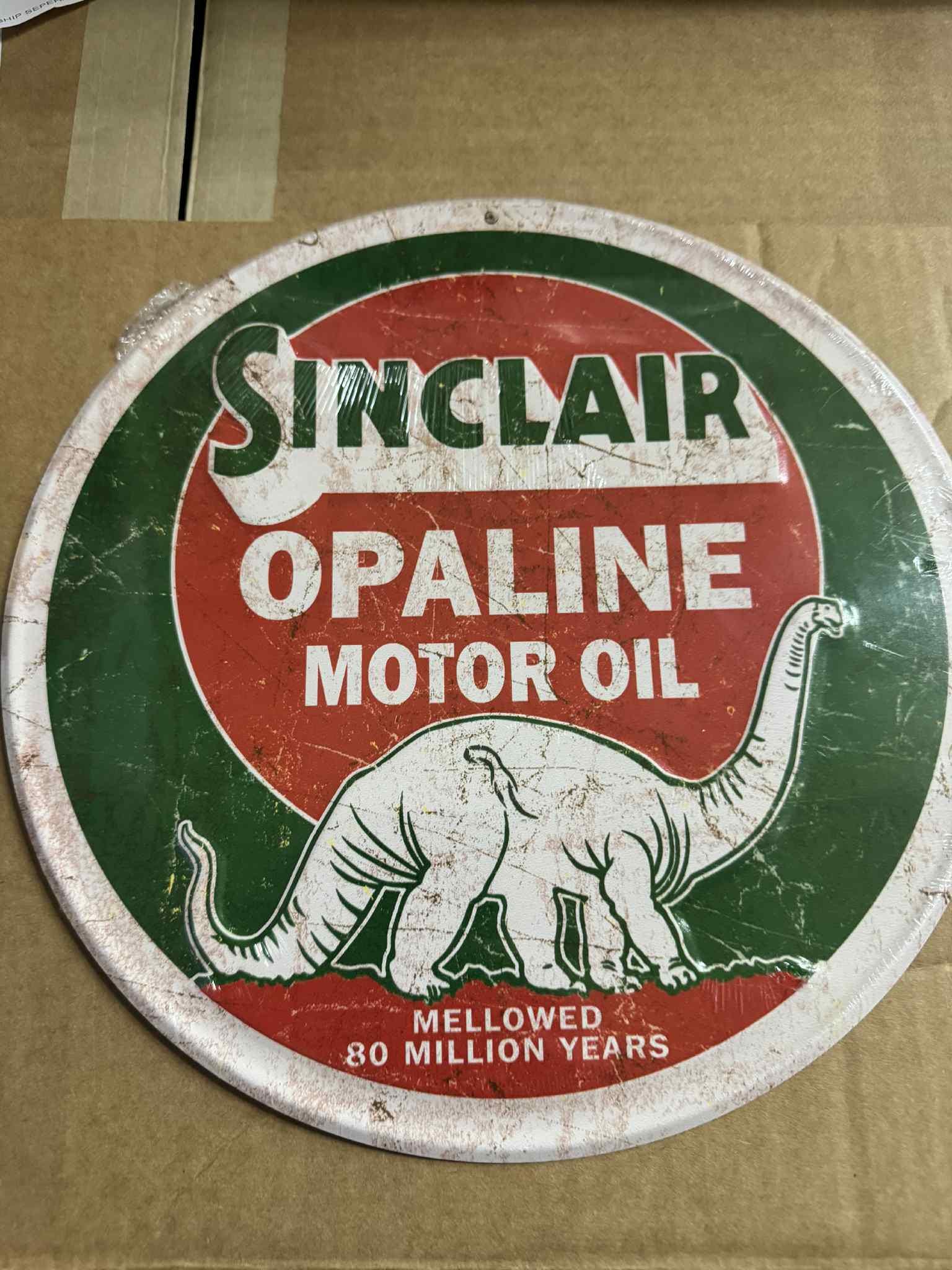 Add a classic gas & oil vibe to your space with this Sinclair Opaline Motor Oil Round Metal Sign.