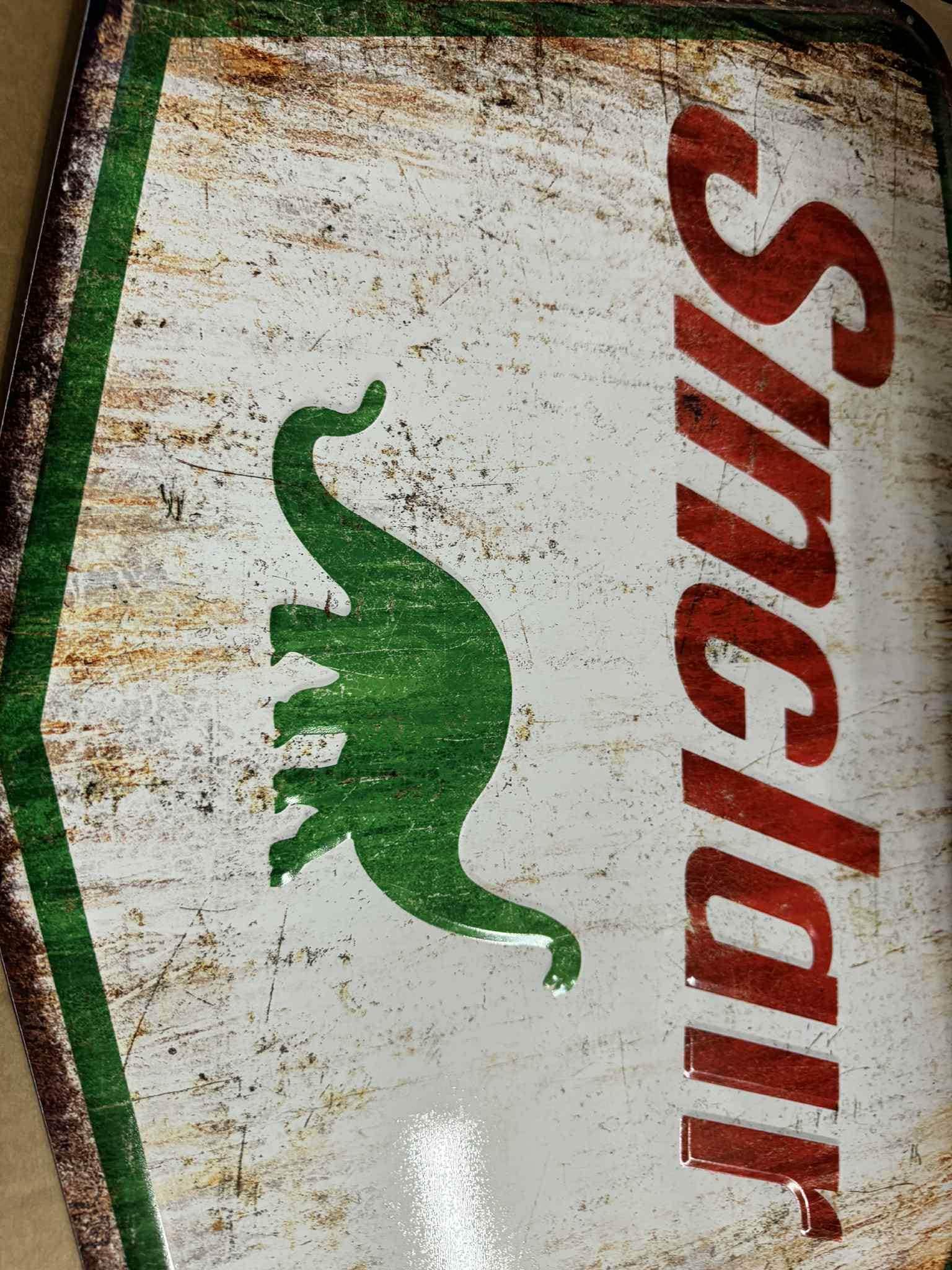 This piece features a distressed, vintage-inspired finish with the iconic green dinosaur and shield-shape design — perfect for collectors of retro automotive memorabilia.