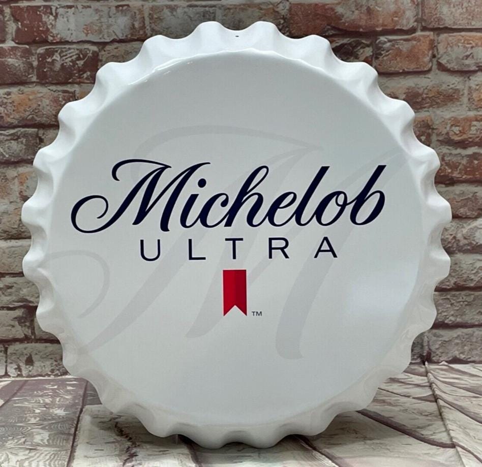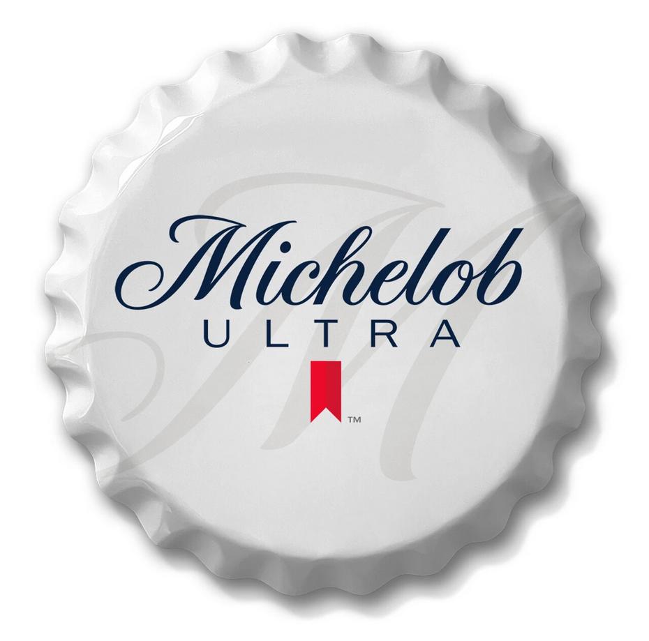 This officially licensed Michelob Ultra 18-inch bottle cap sign is a clean, bold statement piece for any bar, patio, home bar, game room, or mancavedecor space. The crisp white cap paired with the iconic red ribbon and blue script creates a premium look that stands out on any wall.