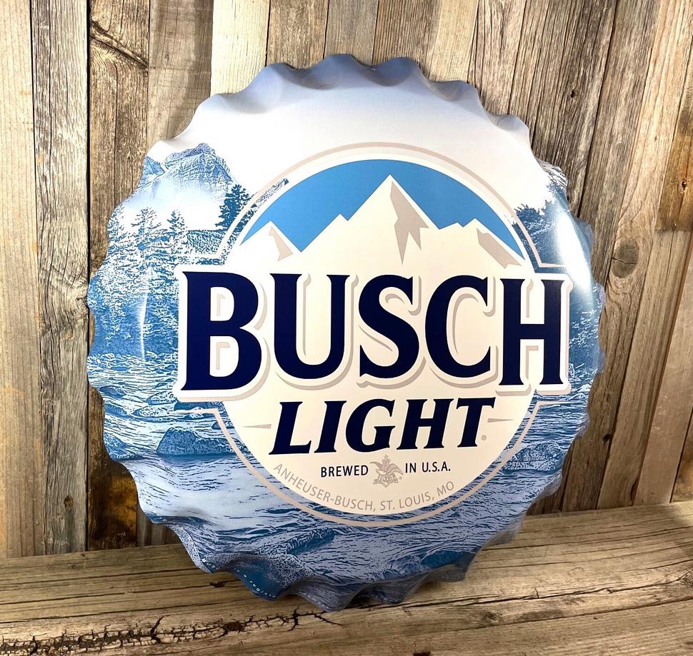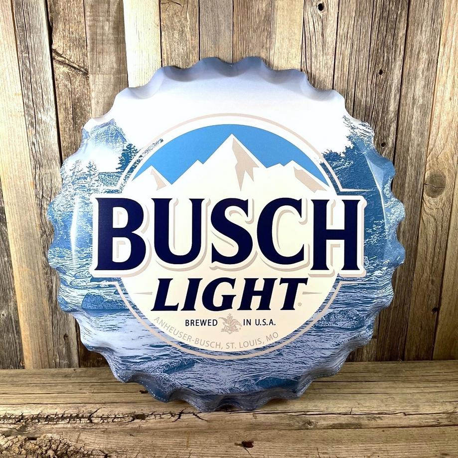 This 18-inch Busch Light bottle cap sign features the classic mountain design and bold Busch Light branding—perfect for bar areas, garage walls, mancavedecor setups, hunting cabins, lodges, or beer collection displays.
