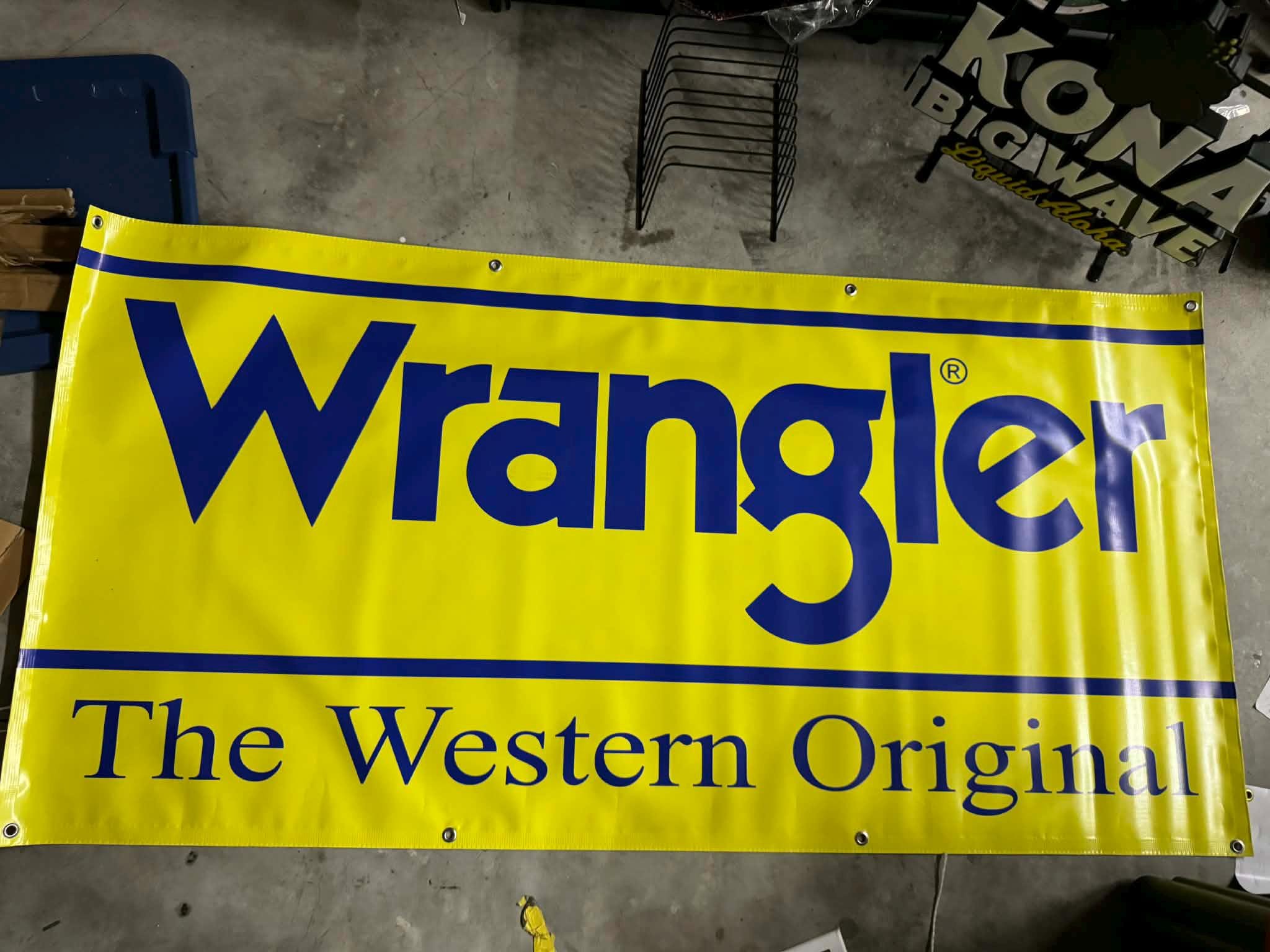 Add bold western style to your space with this Wrangler “The Western Original” 3x6 ft heavy-vinyl banner. Bright yellow with deep blue lettering, this large-format display piece is perfect for barns, garages, shops, man caves, rodeo arenas, vendor booths, or western-themed décor.