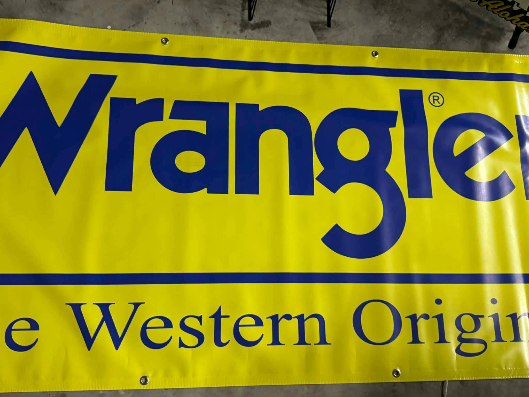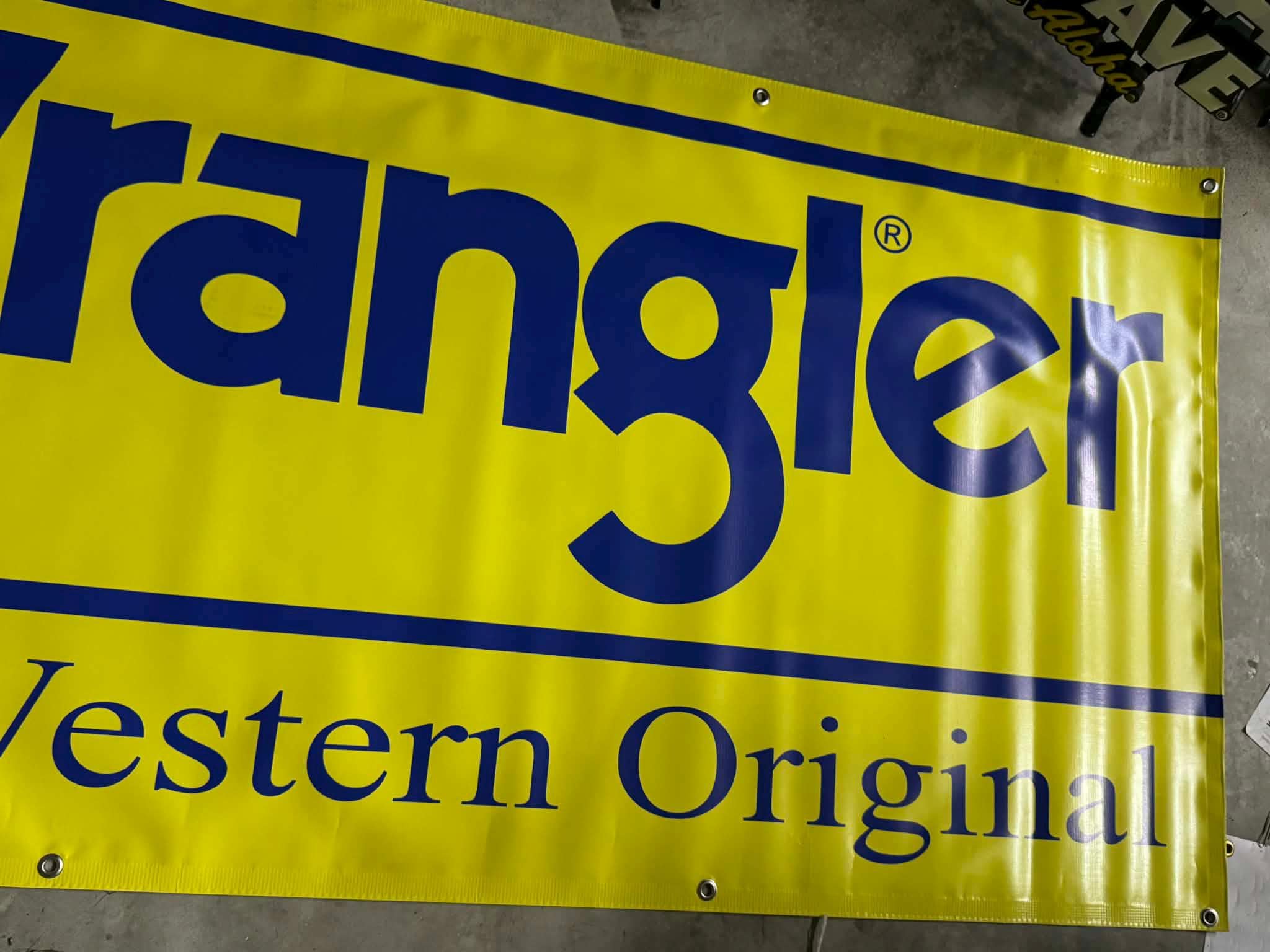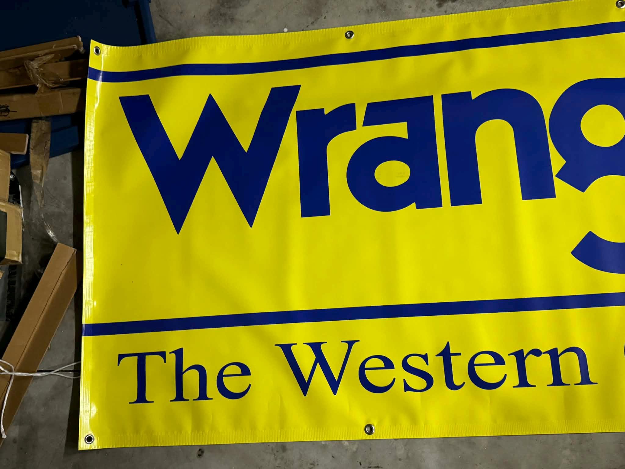 This banner is made of thick heavy-duty vinyl, built to last indoors or outdoors, and includes metal grommets for easy hanging. Clean, crisp print with that classic Wrangler look.