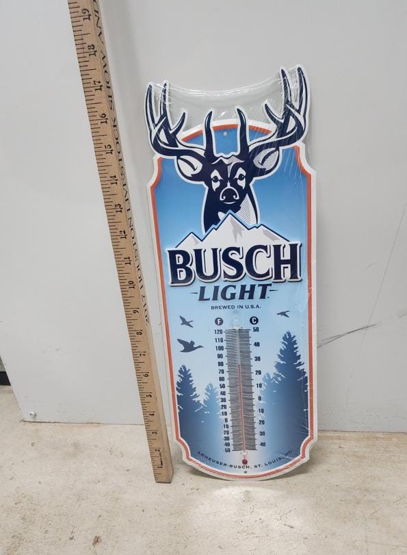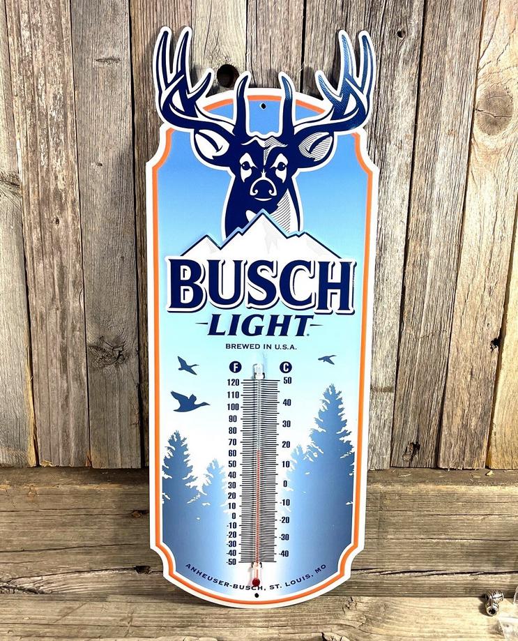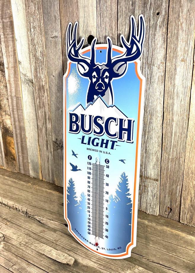 This 17.5" x 6.6" embossed metal thermometer features the iconic Busch Light deer, frosty mountain artwork, and a classic matte finish. It’s brand new, factory-fresh, and built from high-grade aluminum with pre-drilled holes for quick, easy hanging anywhere indoors or outdoors.