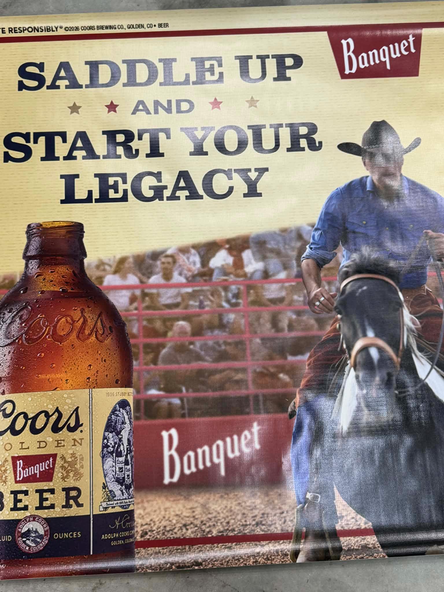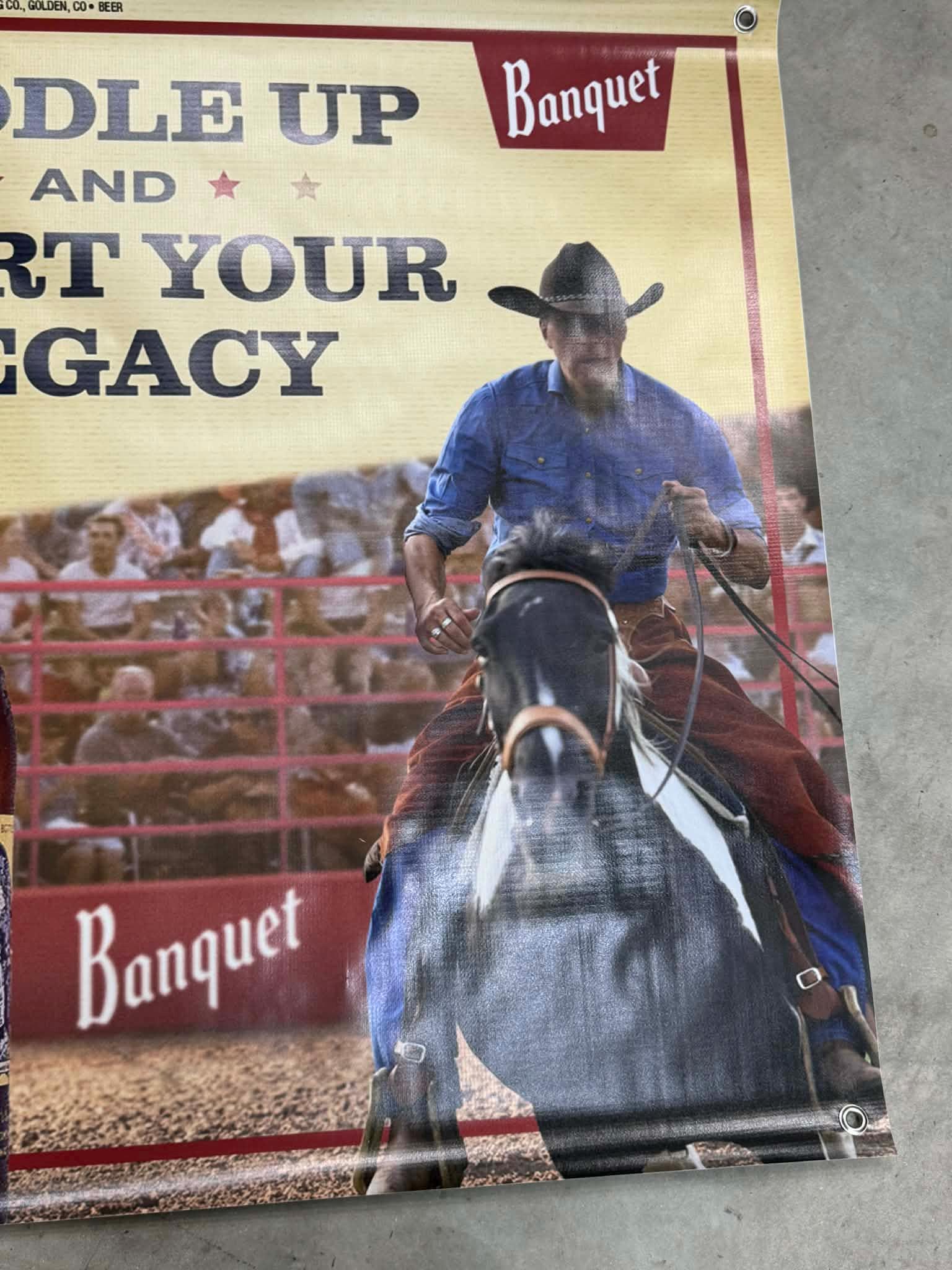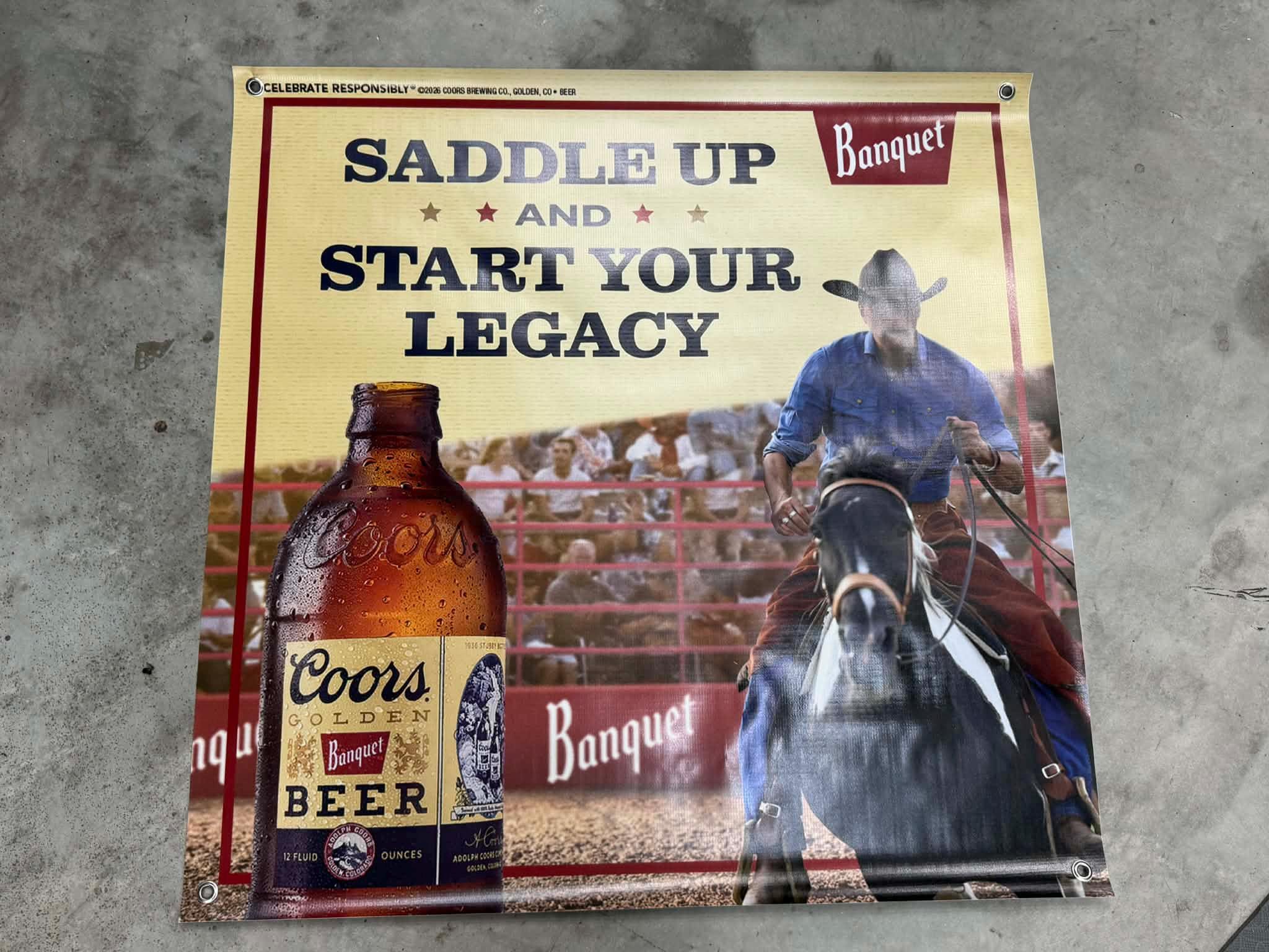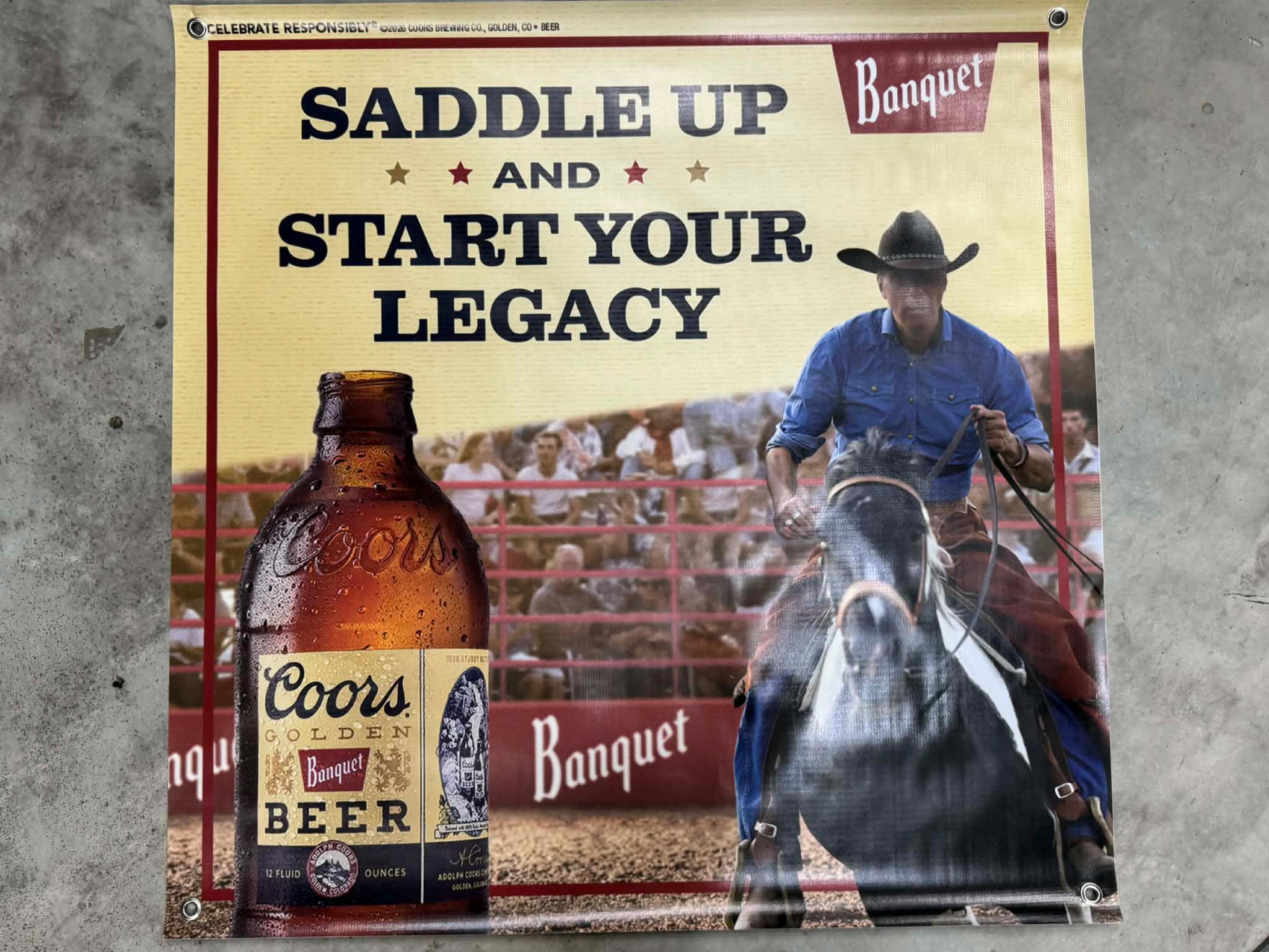Turn any wall into a full-blown Western bar scene with this 36” x 36” Coors Banquet heavy vinyl banner — featuring the iconic Banquet stubby bottle, rodeo rider, and bold “Saddle Up & Start Your Legacy” slogan.