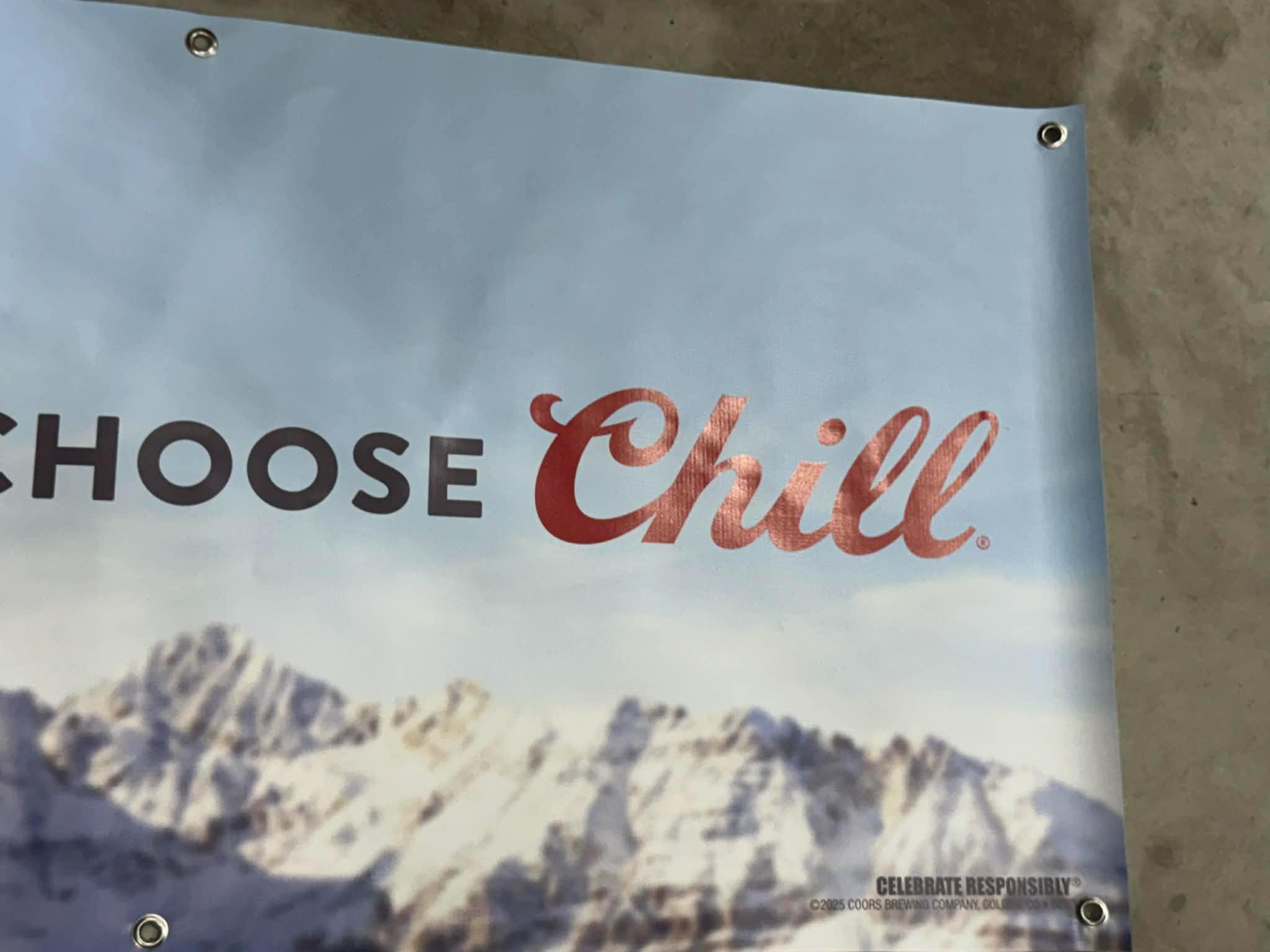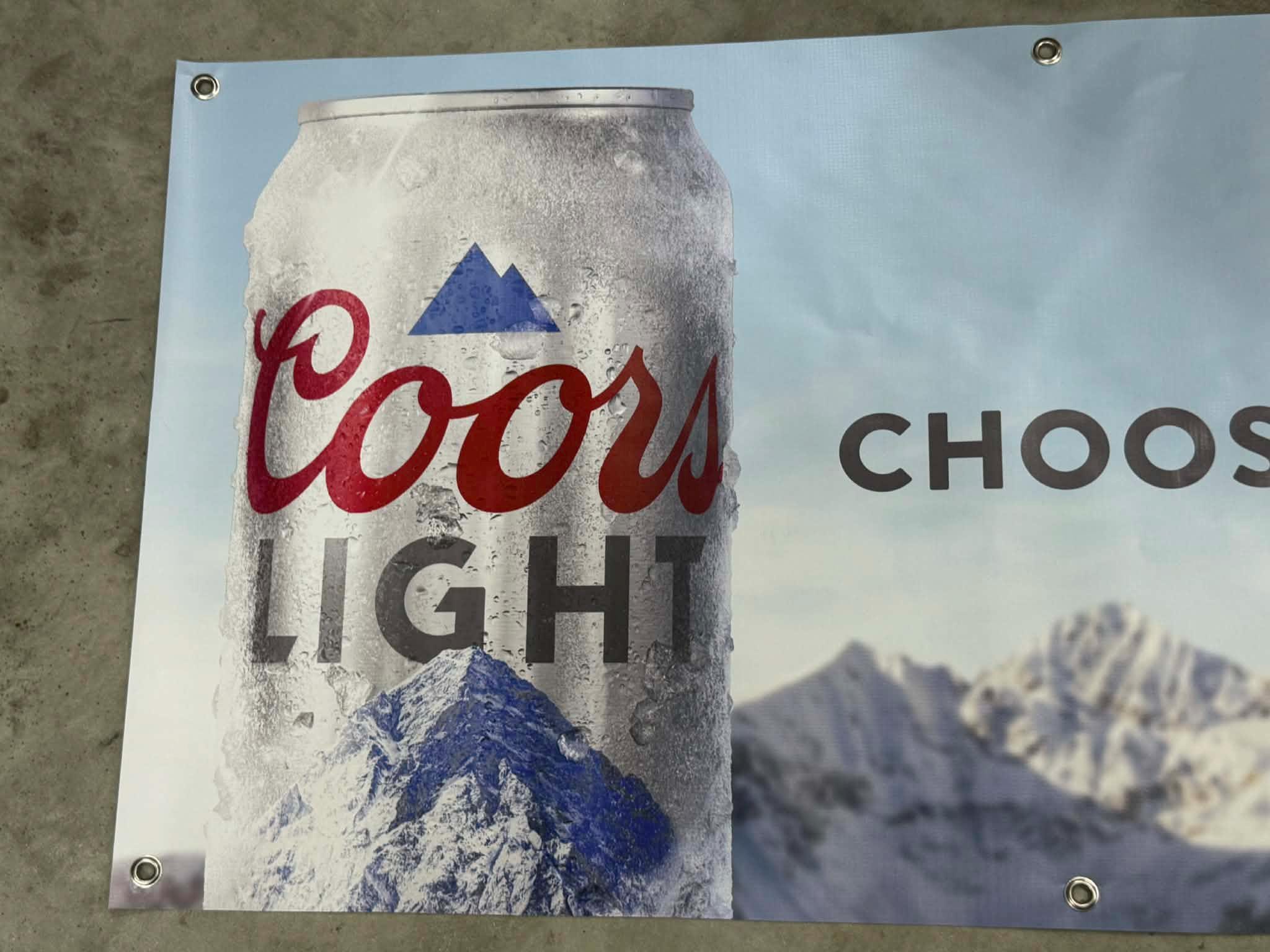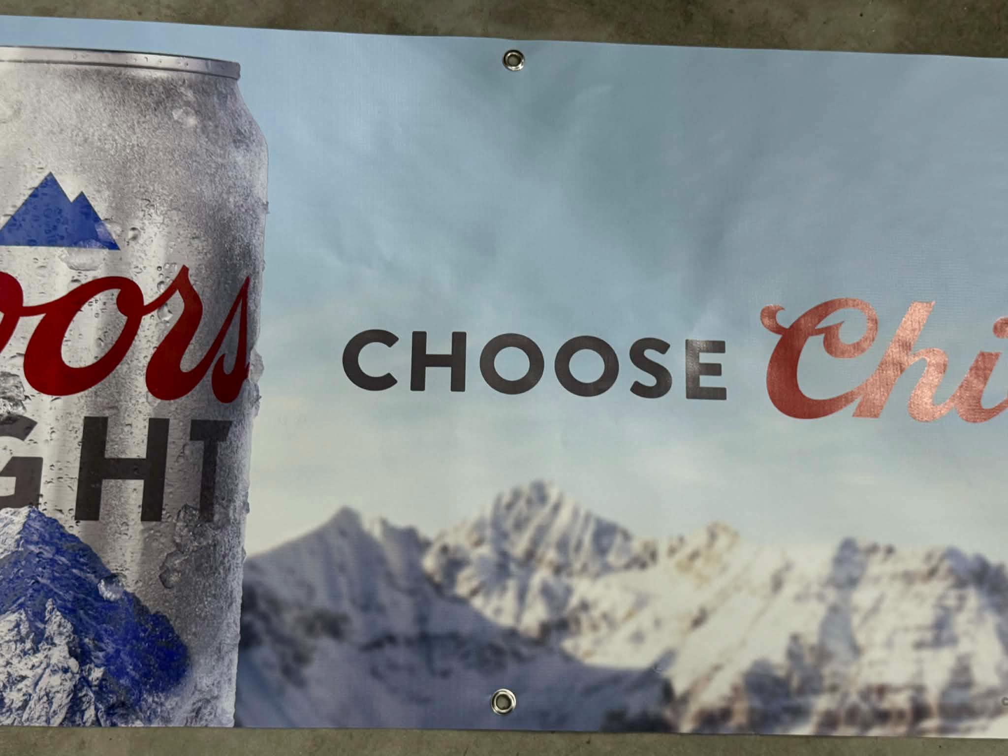 Bring the mountains indoors with this 24” x 50” Coors Light “Choose Chill” heavy vinyl banner — featuring the iconic frost-covered Silver Bullet can and snowy ridge background. Thick, commercial-grade vinyl with reinforced edges and grommets, perfect for mancavedecor lovers, garages, bars, and holiday gift giving.