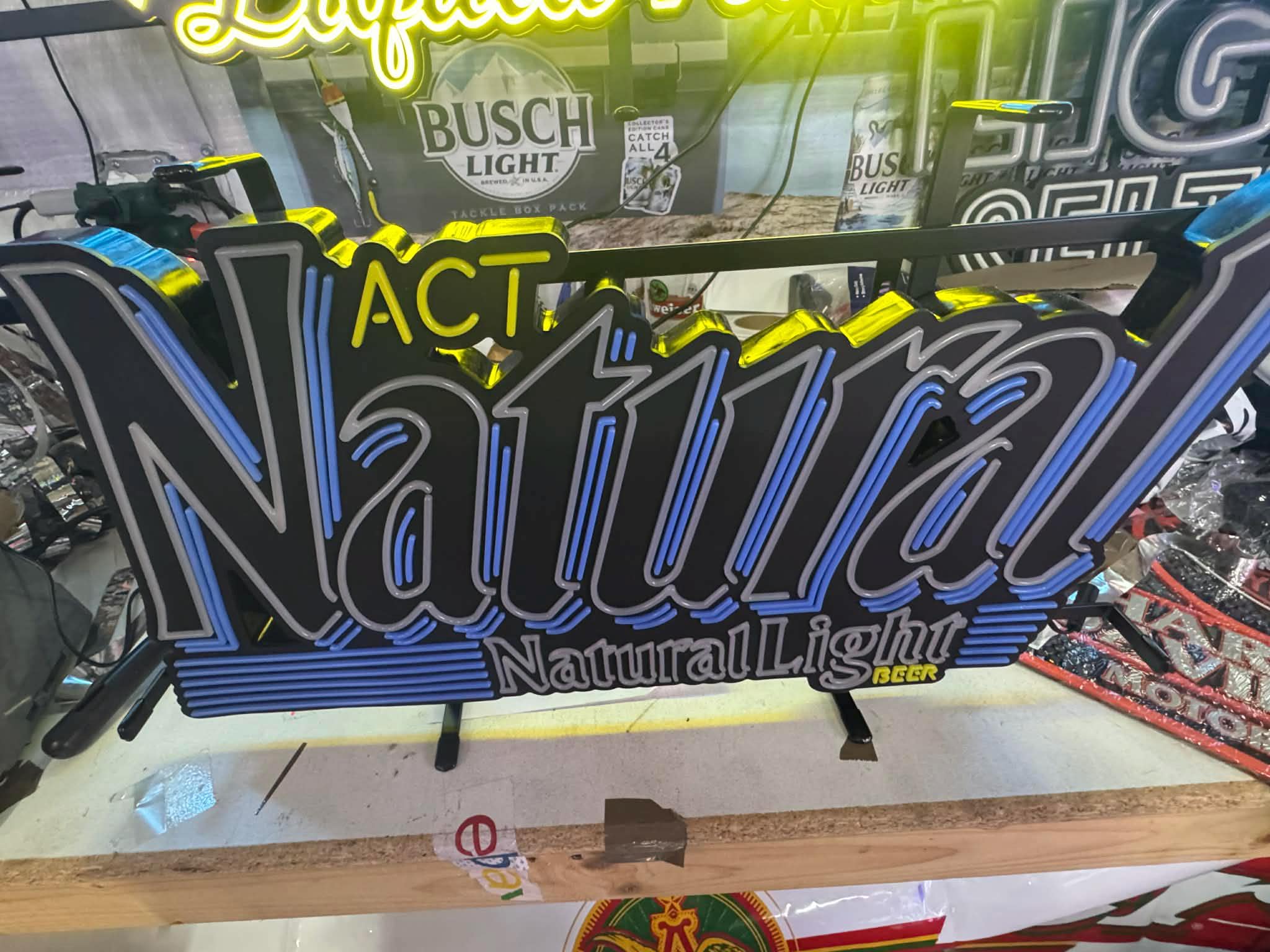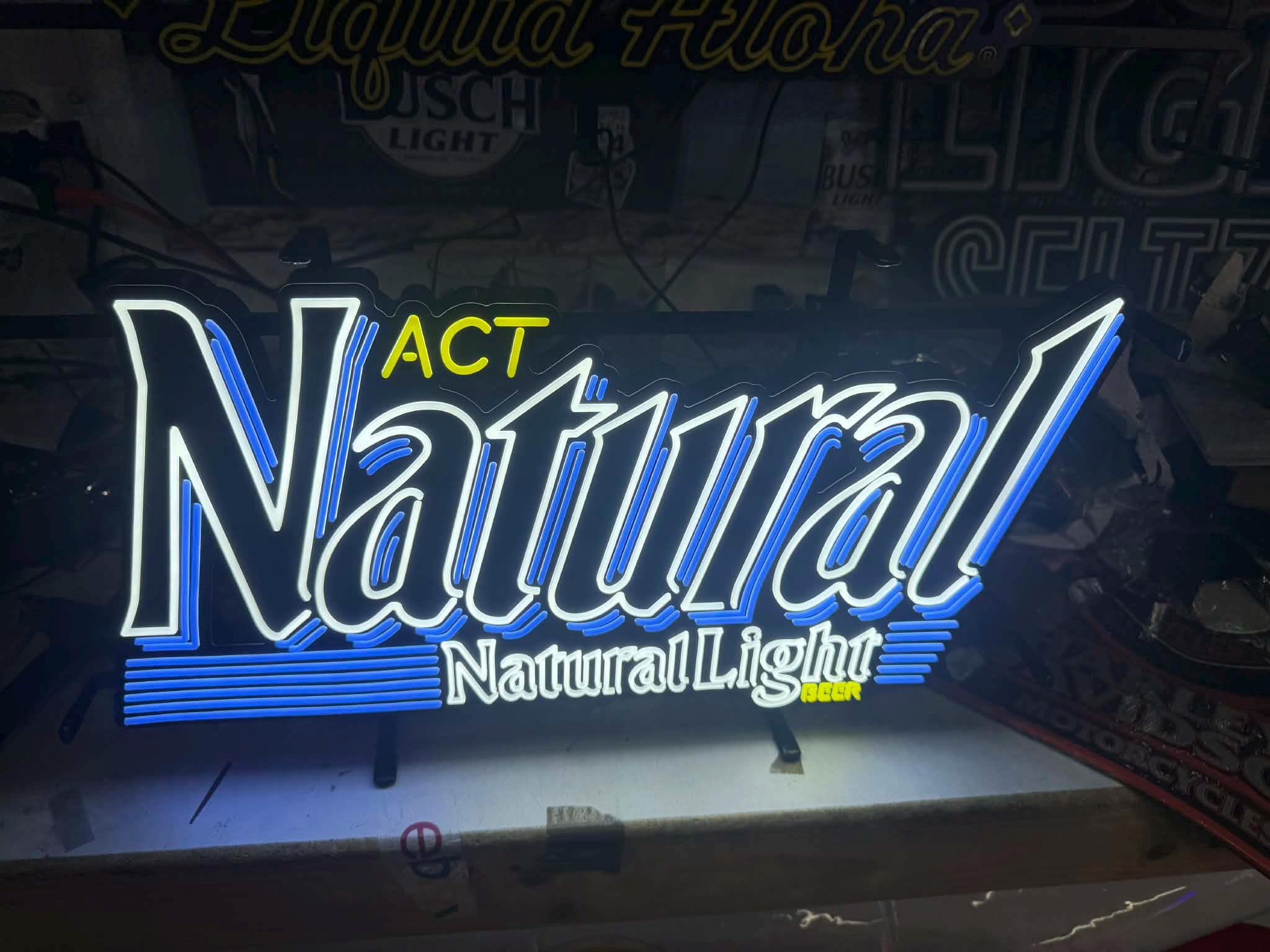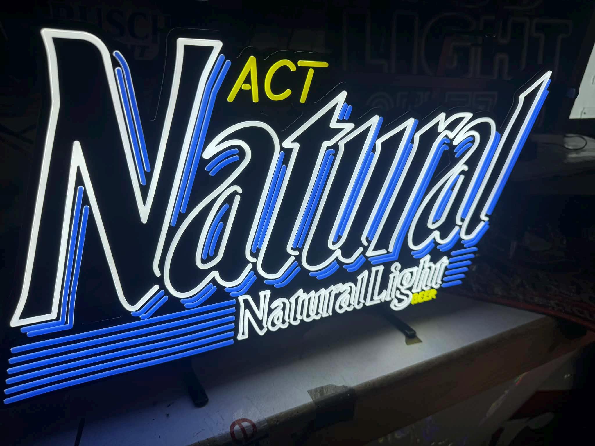 Light up your bar with this Natural Light “Act Natural” LED Sign, featuring crisp white + blue illumination and the classic Natty Light branding.