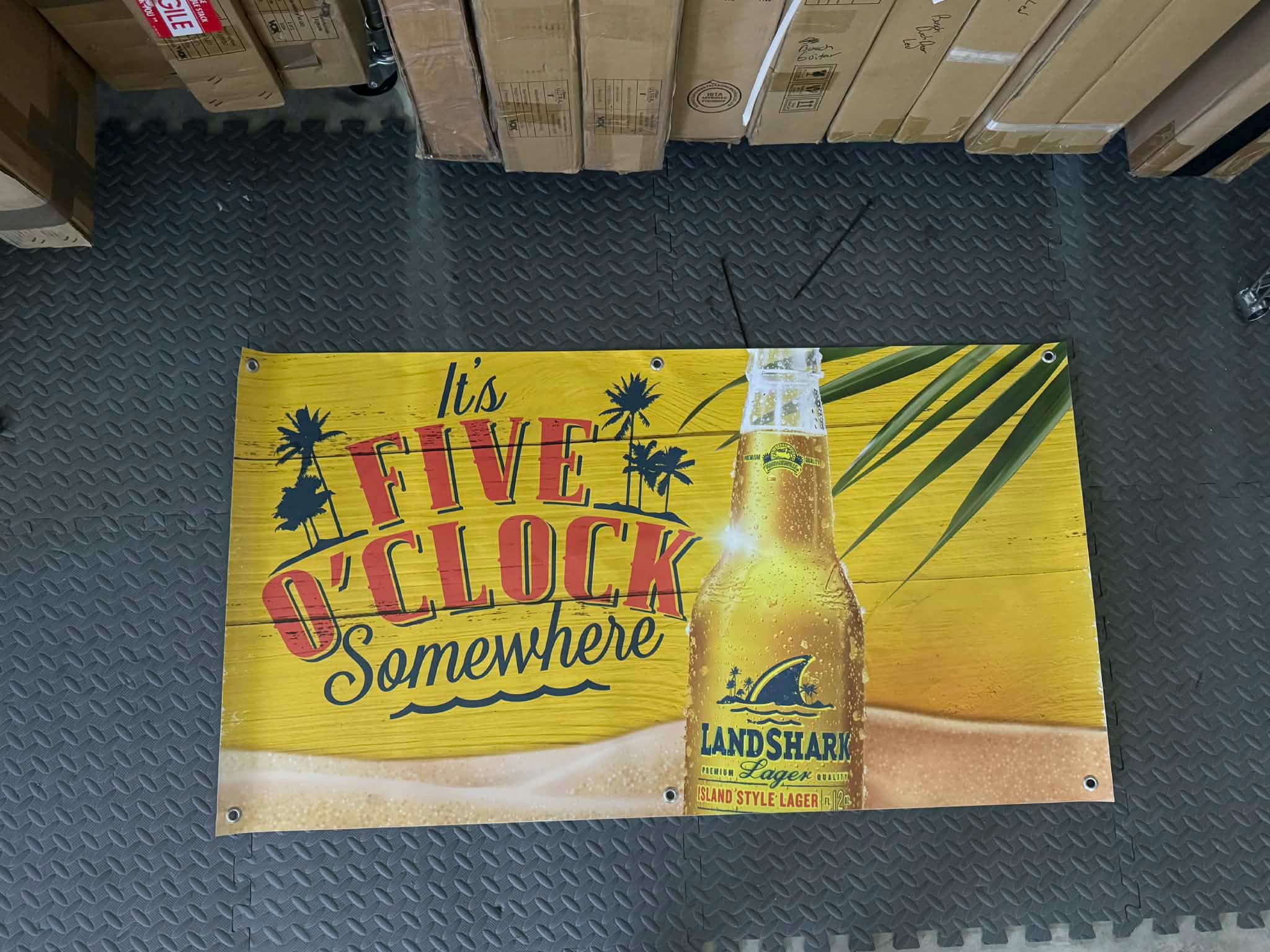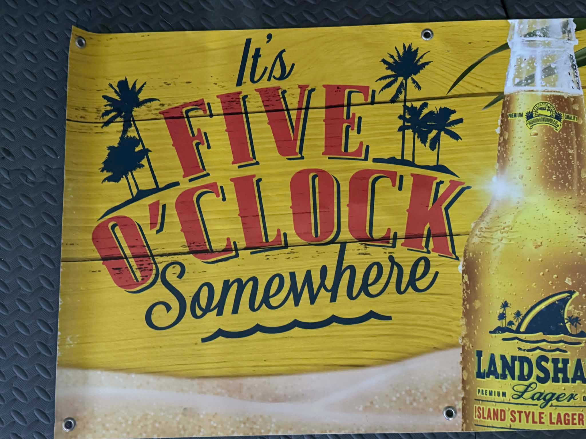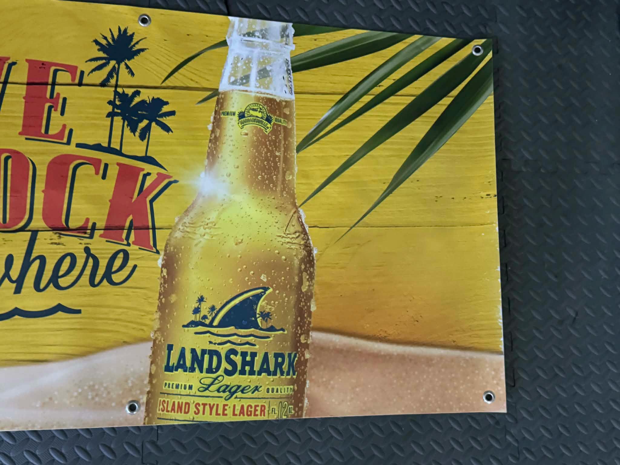 Bring beach-bar vibes to your space with this 48" x 26" LandShark Lager banner featuring the iconic It’s Five O’Clock Somewhere design.
