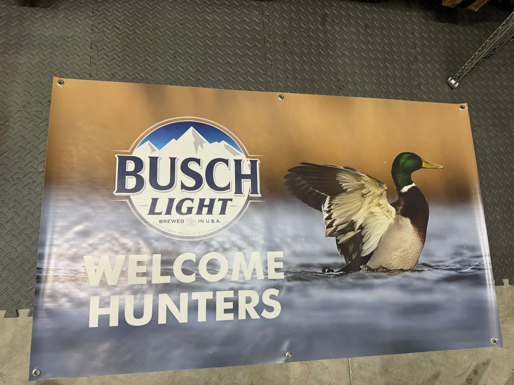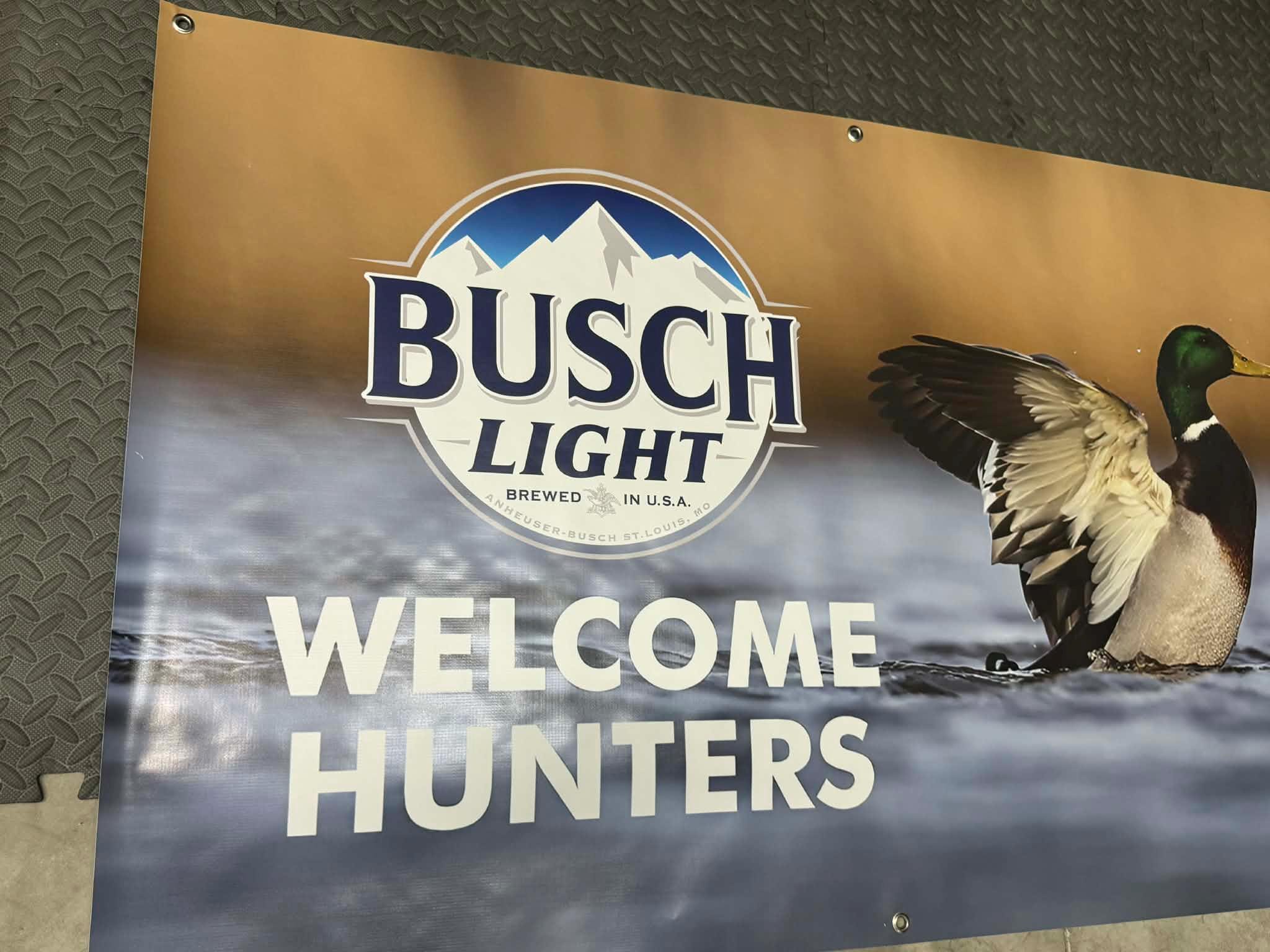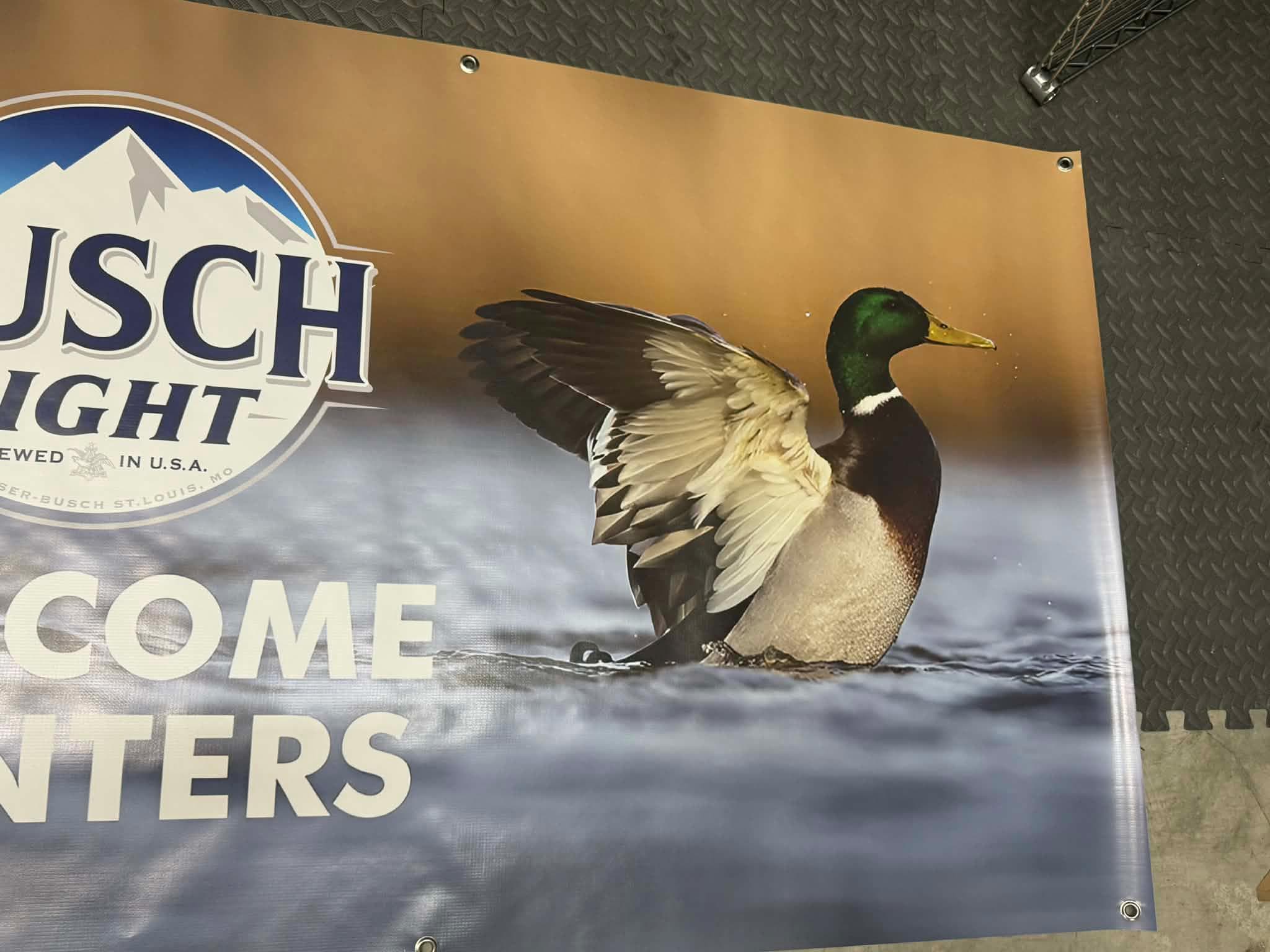 ring the outdoors inside with this Busch Light Welcome Hunters 3x5 ft banner, featuring a flying mallard duck and the classic Busch Light mountain logo.