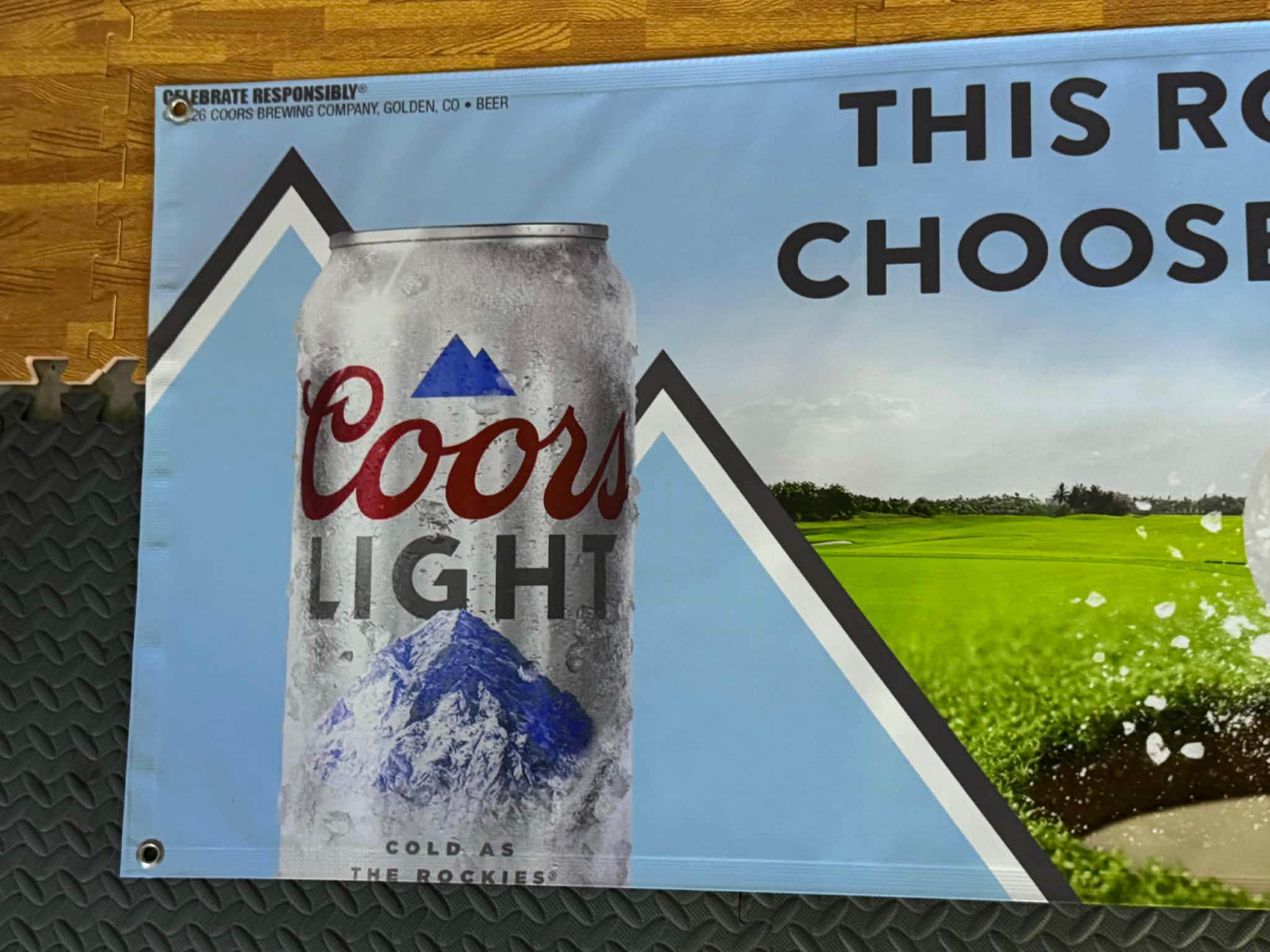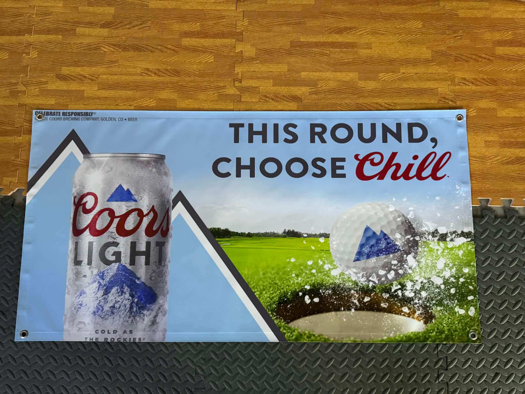 Eye-catching Coors Light golf-themed vinyl banner featuring the iconic frosted can design, golf course imagery, and the “This Round, Choose Chill” slogan.