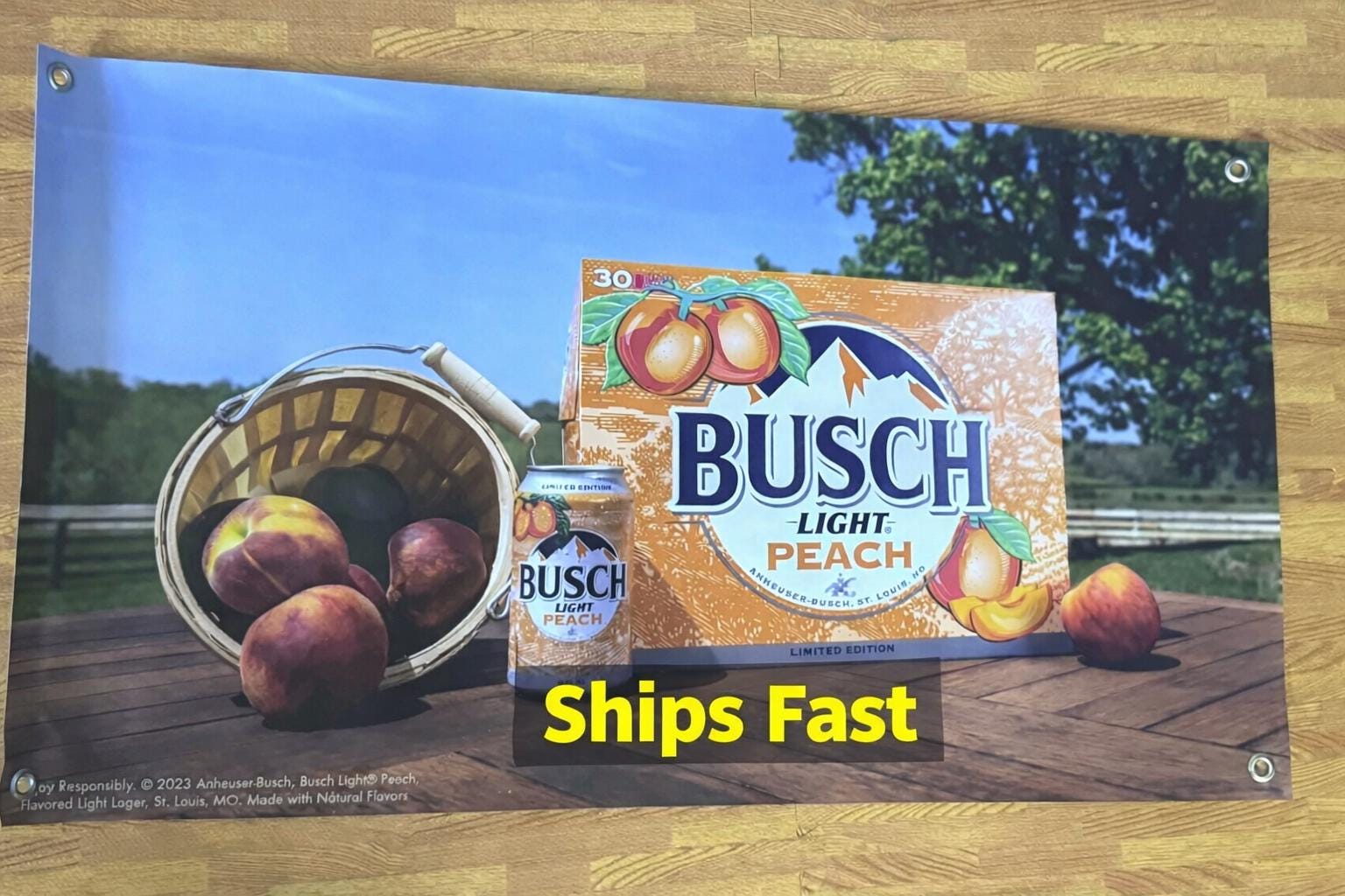 Bright and eye-catching Busch Light Peach Limited Edition vinyl banner featuring fresh peach imagery, rustic outdoor scenery, and classic Busch Light Peach can and packaging artwork.