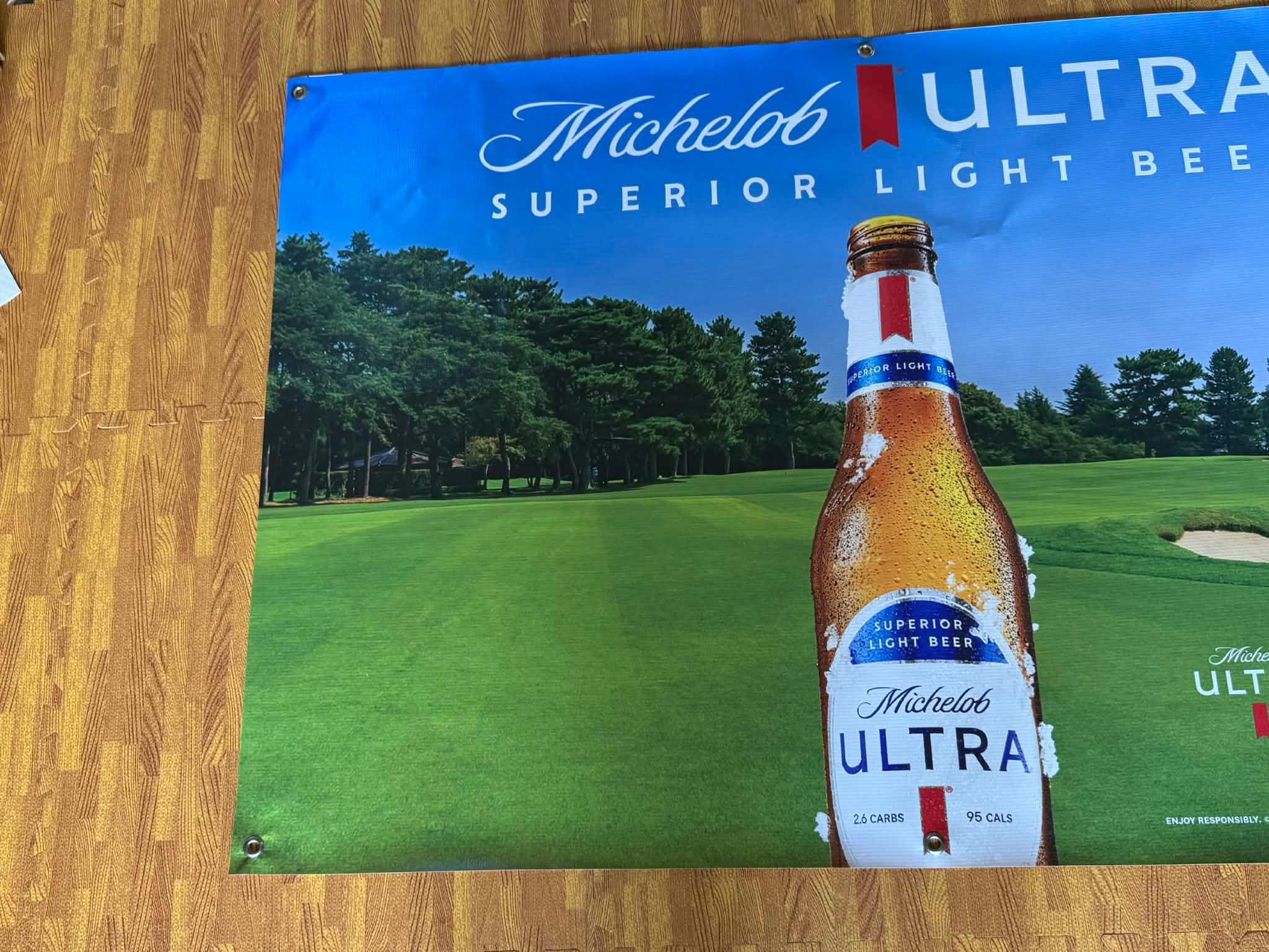 Large-format Michelob Ultra Superior Light Beer golf banner featuring a full golf course fairway scene, frosted Michelob Ultra bottle artwork, and official golf sponsorship branding.