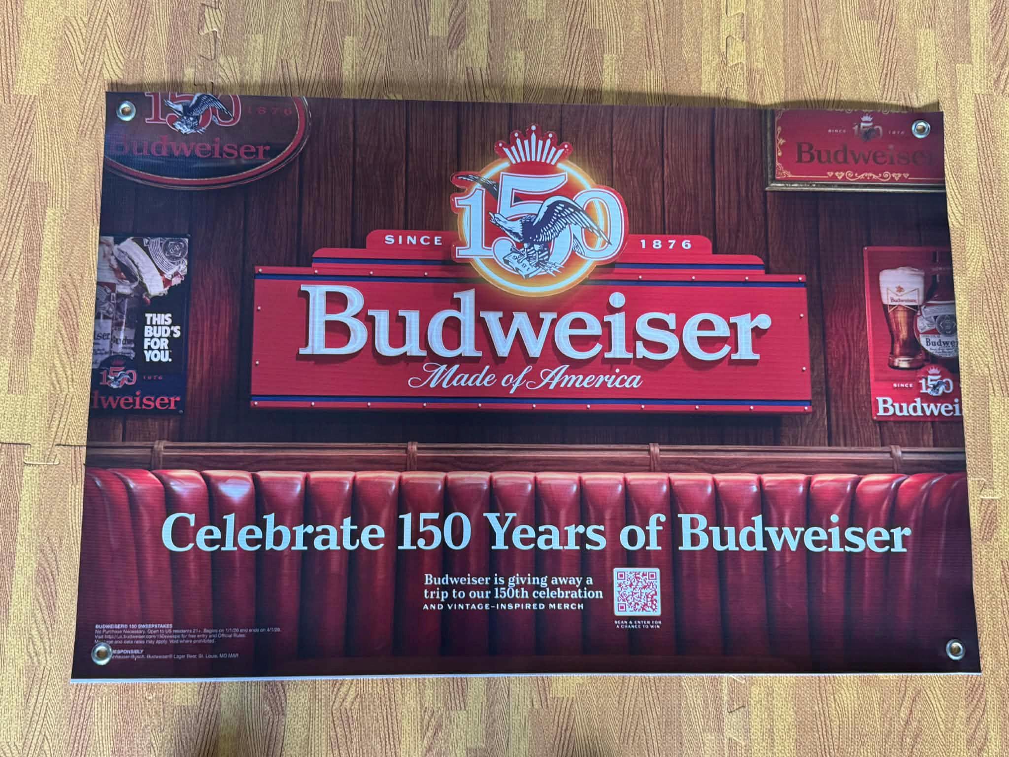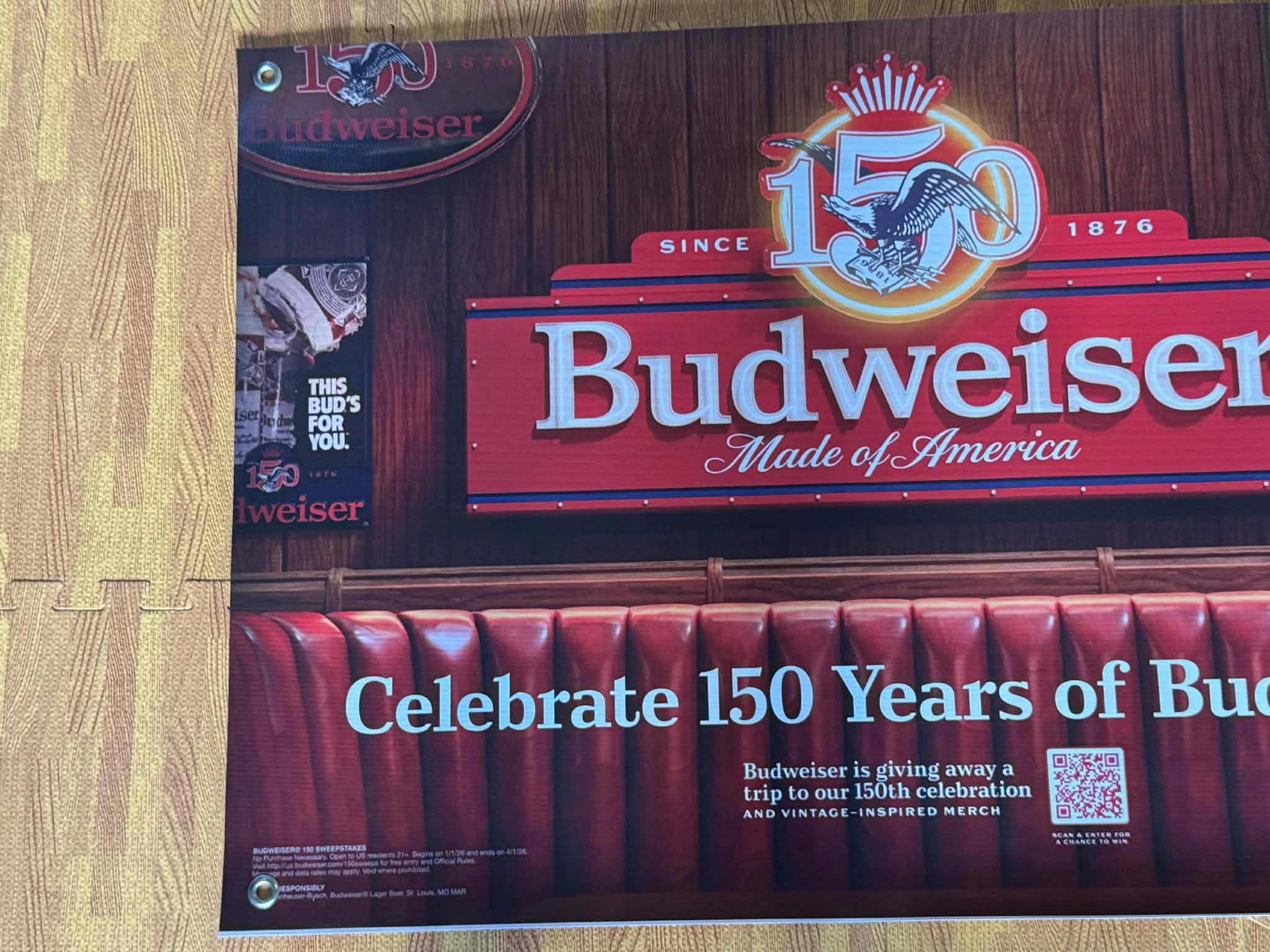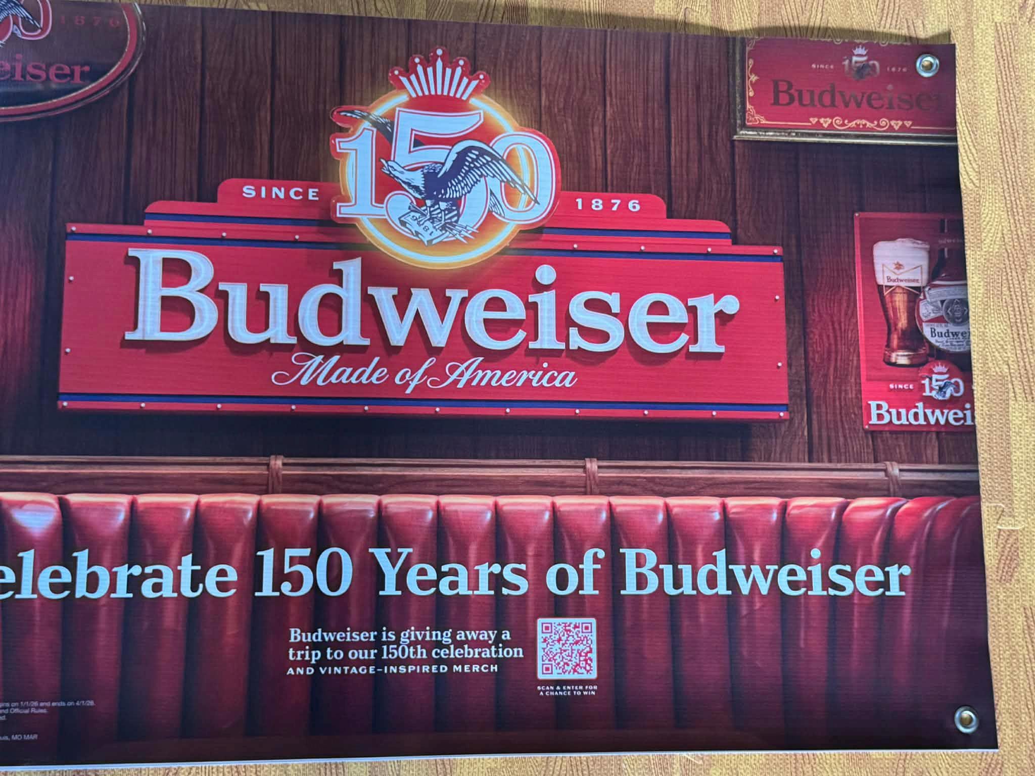 Commemorative Budweiser 150th Anniversary vinyl banner celebrating 150 years of Budweiser, featuring classic Budweiser branding, vintage wood-grain artwork, and historic beer imagery inspired by Budweiser’s American heritage.