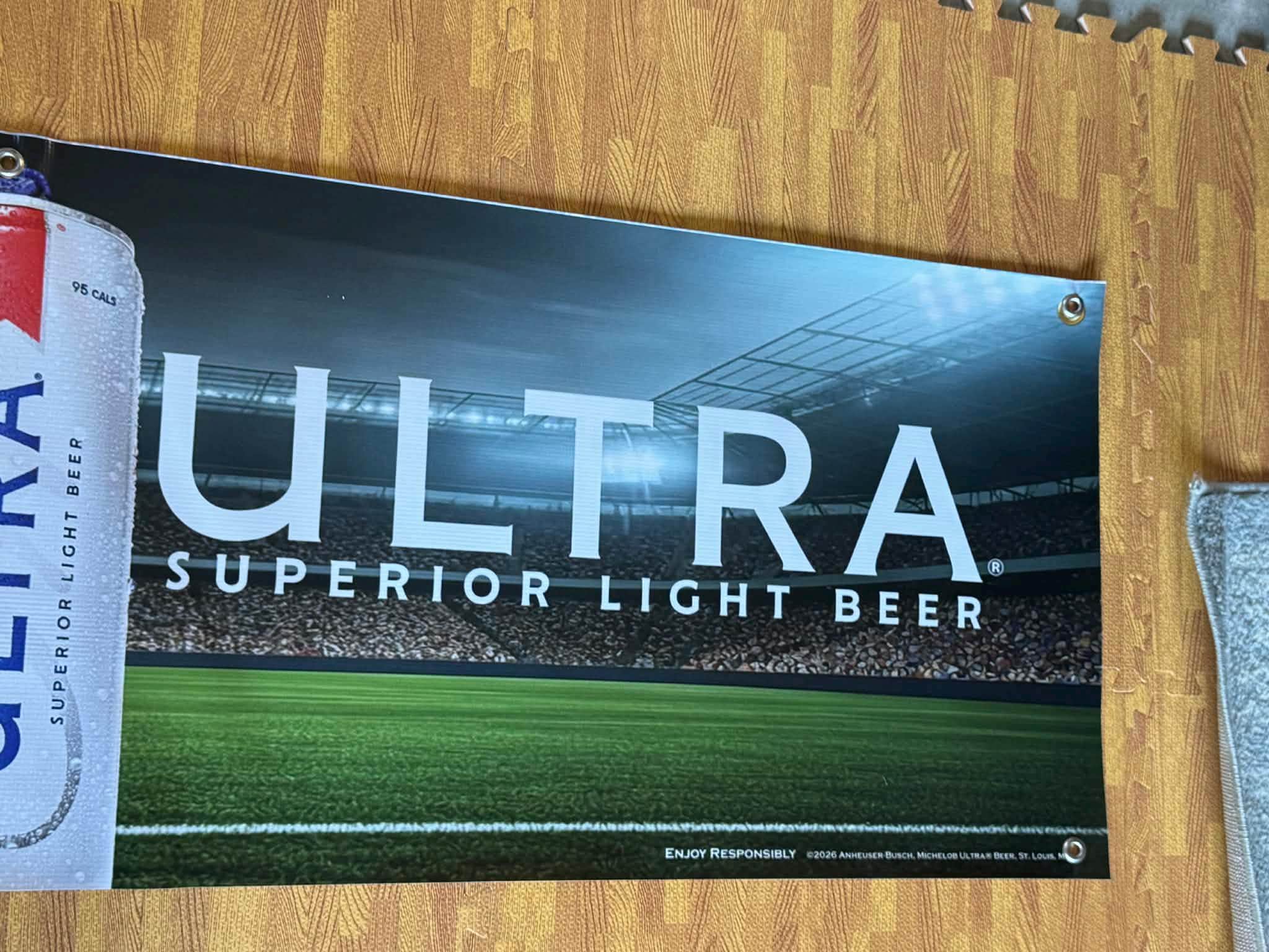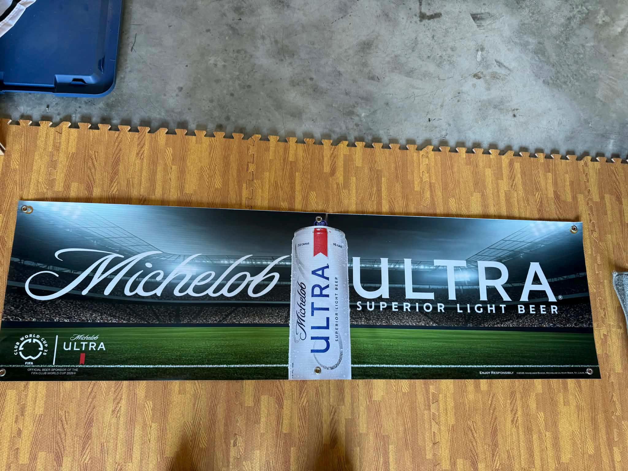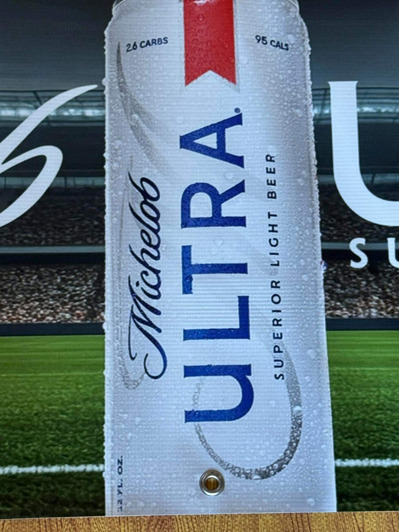 Oversized Michelob Ultra promotional vinyl banner featuring bold stadium artwork and full-width branding. This long-format banner is designed for high visibility and makes an excellent statement piece for bars, mancaves, garages, gyms, golf simulators, and event displays.