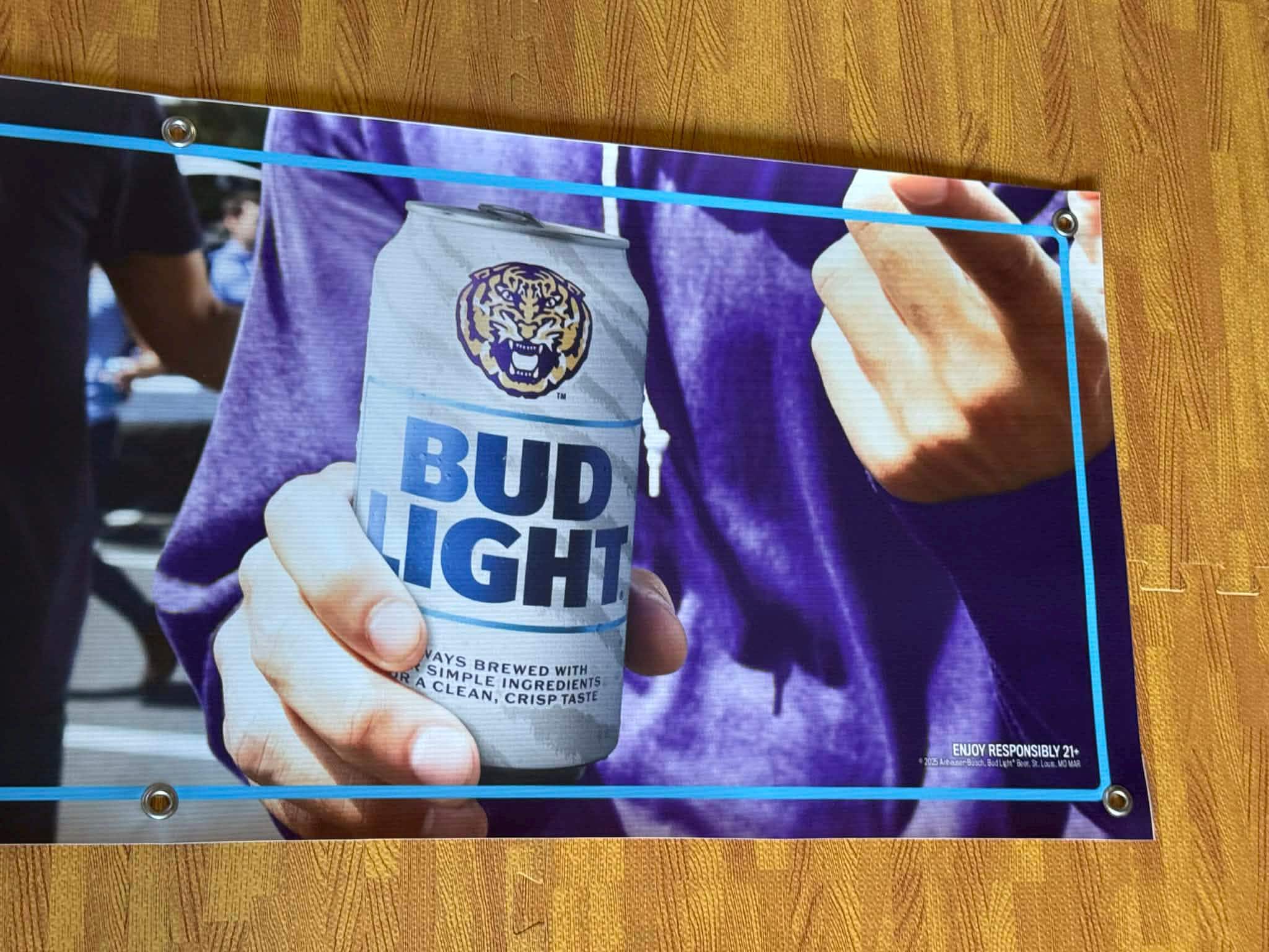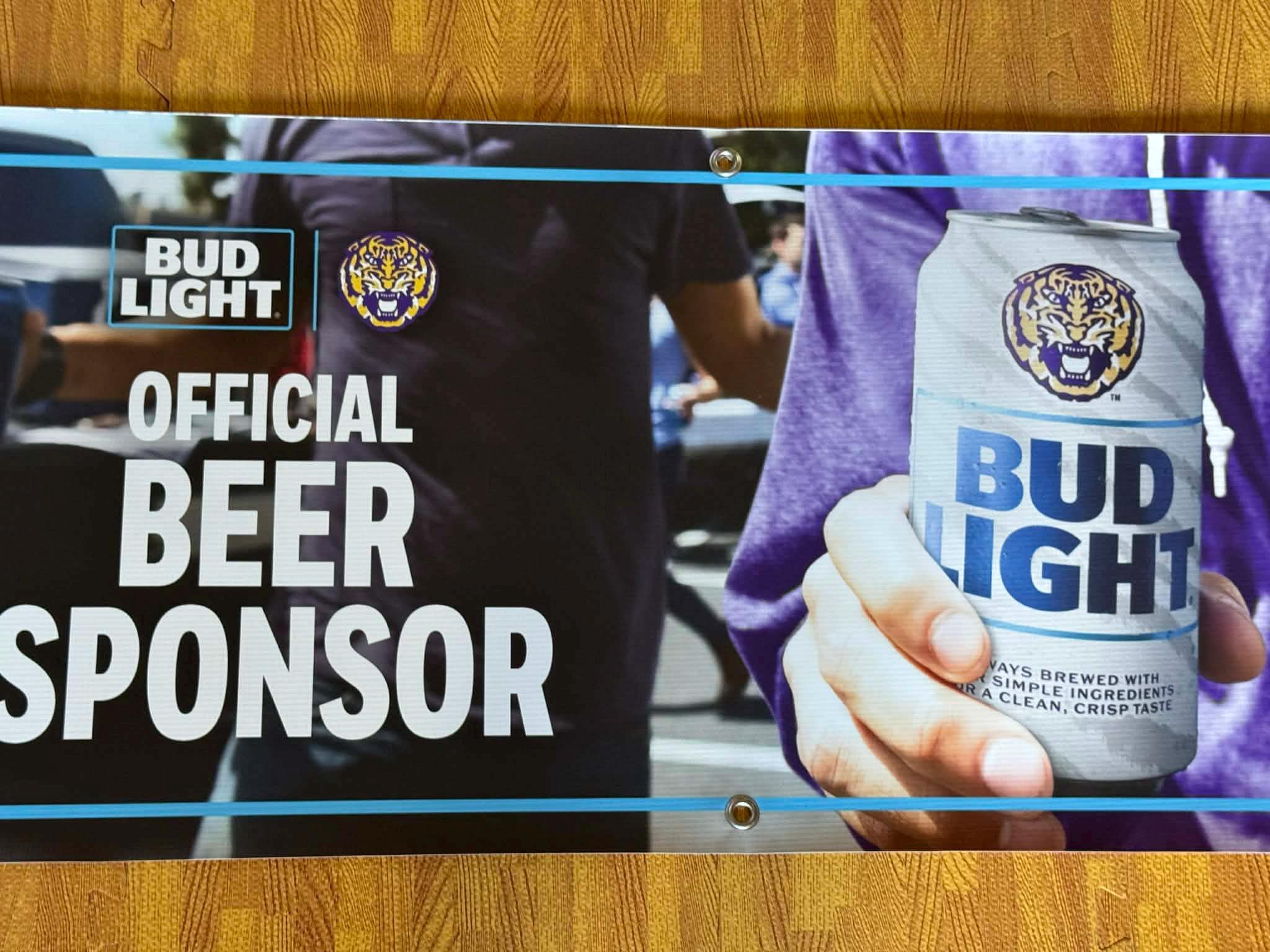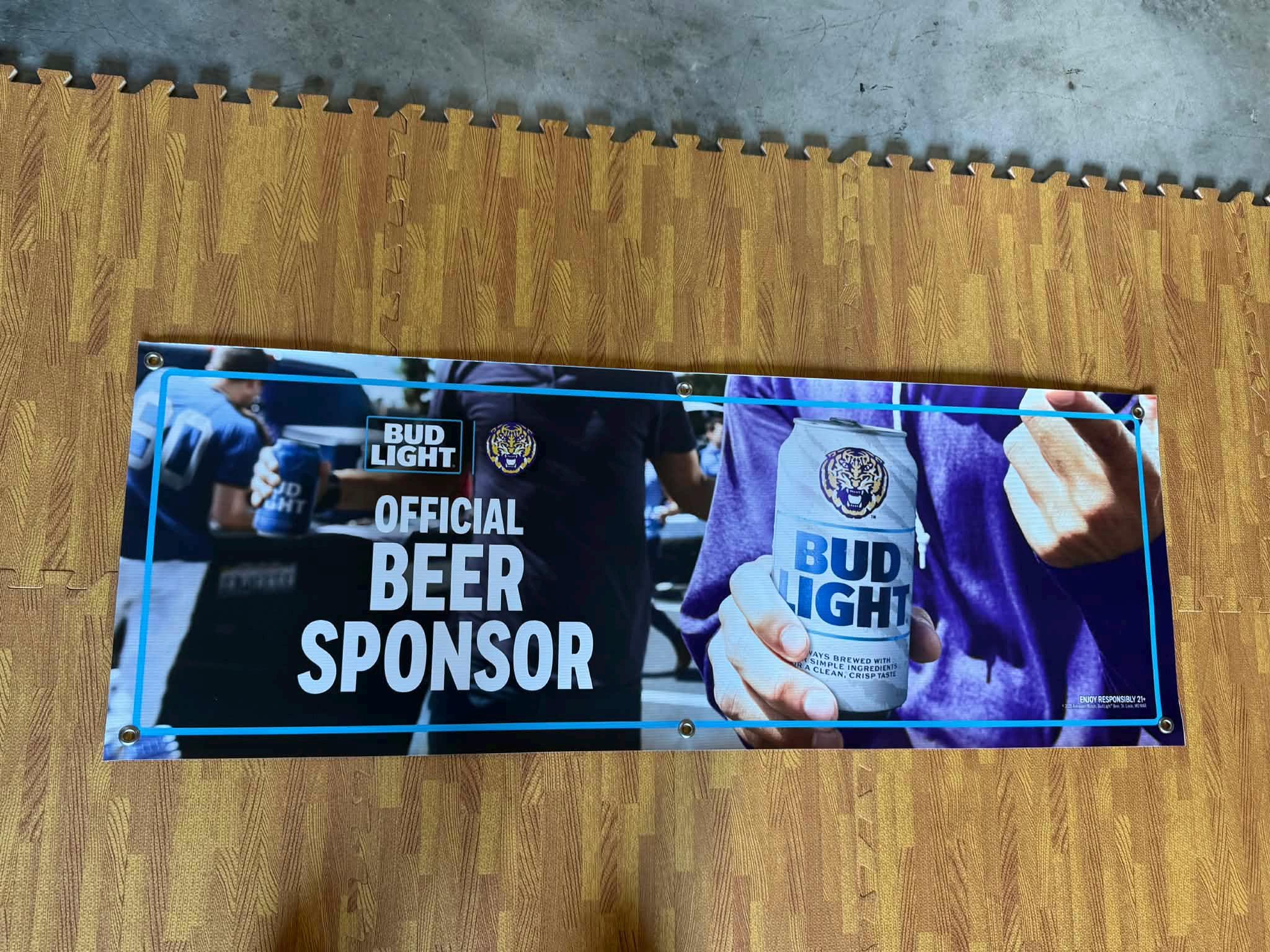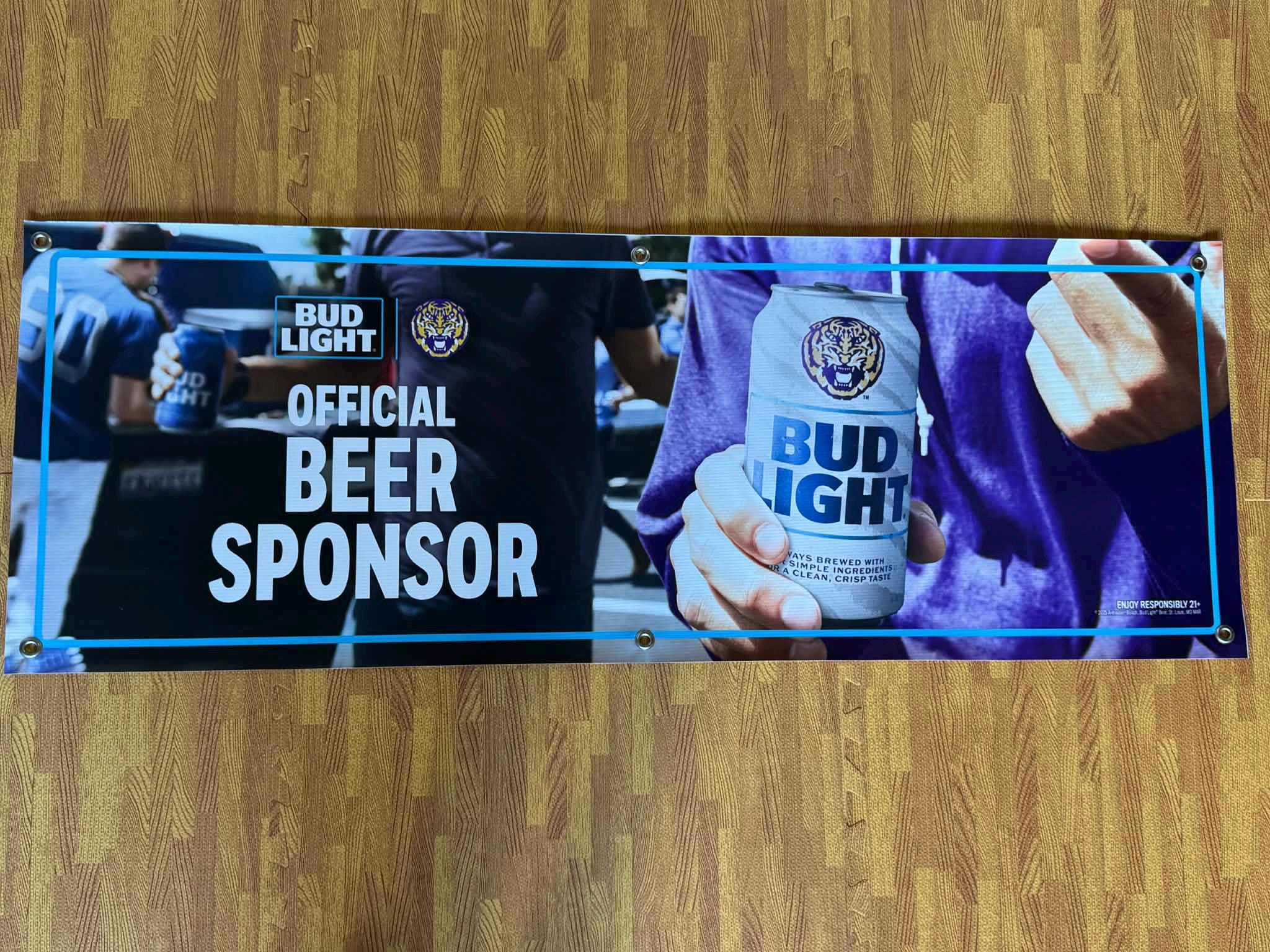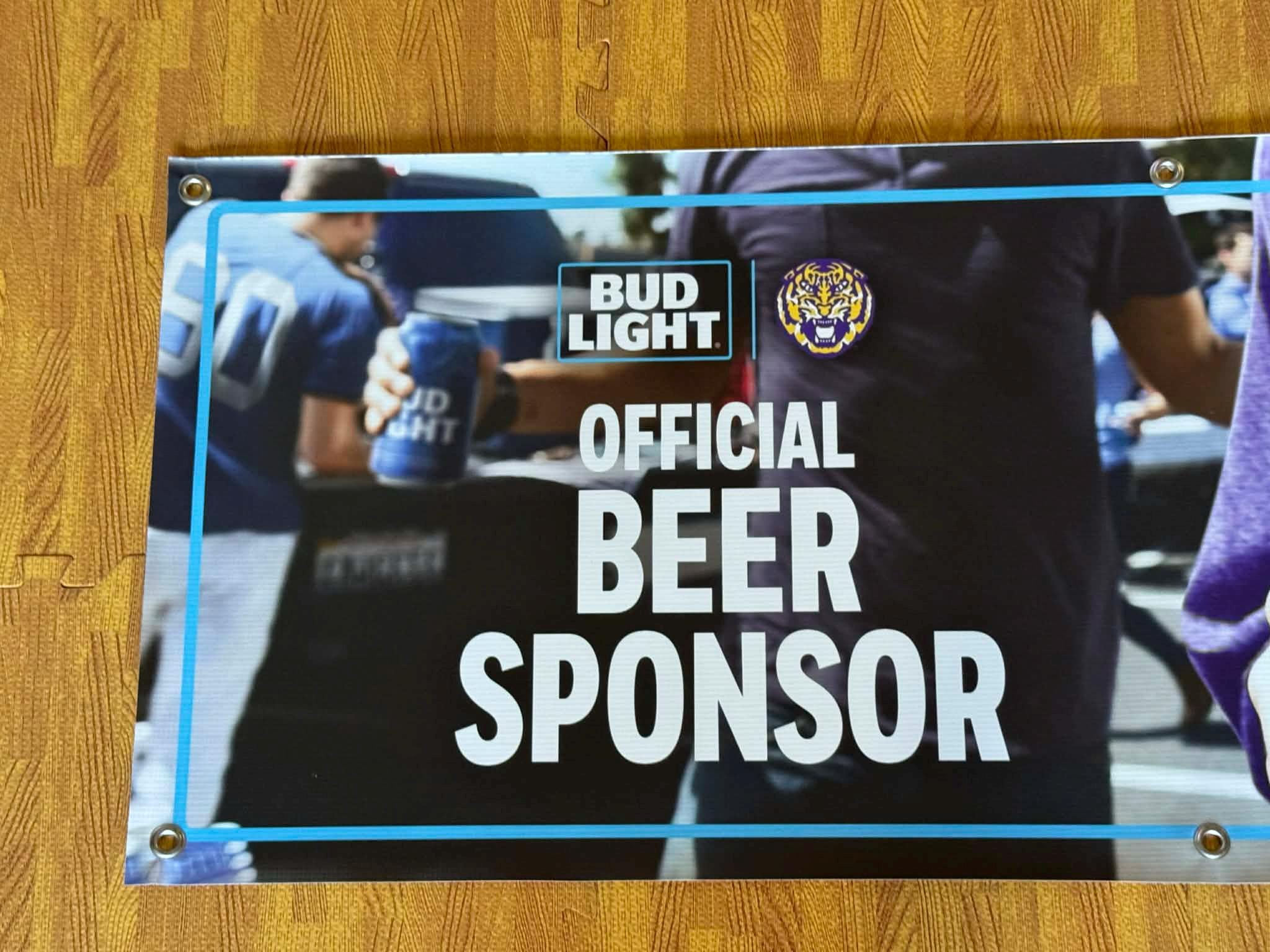 l Bud Light promotional vinyl banner featuring “Official Beer Sponsor” branding and collegiate sports imagery. This long-format banner showcases Bud Light cans in-hand at a live sporting environment, making it a perfect fit for sports bars, mancaves, garages, tailgate setups, and fan rooms.