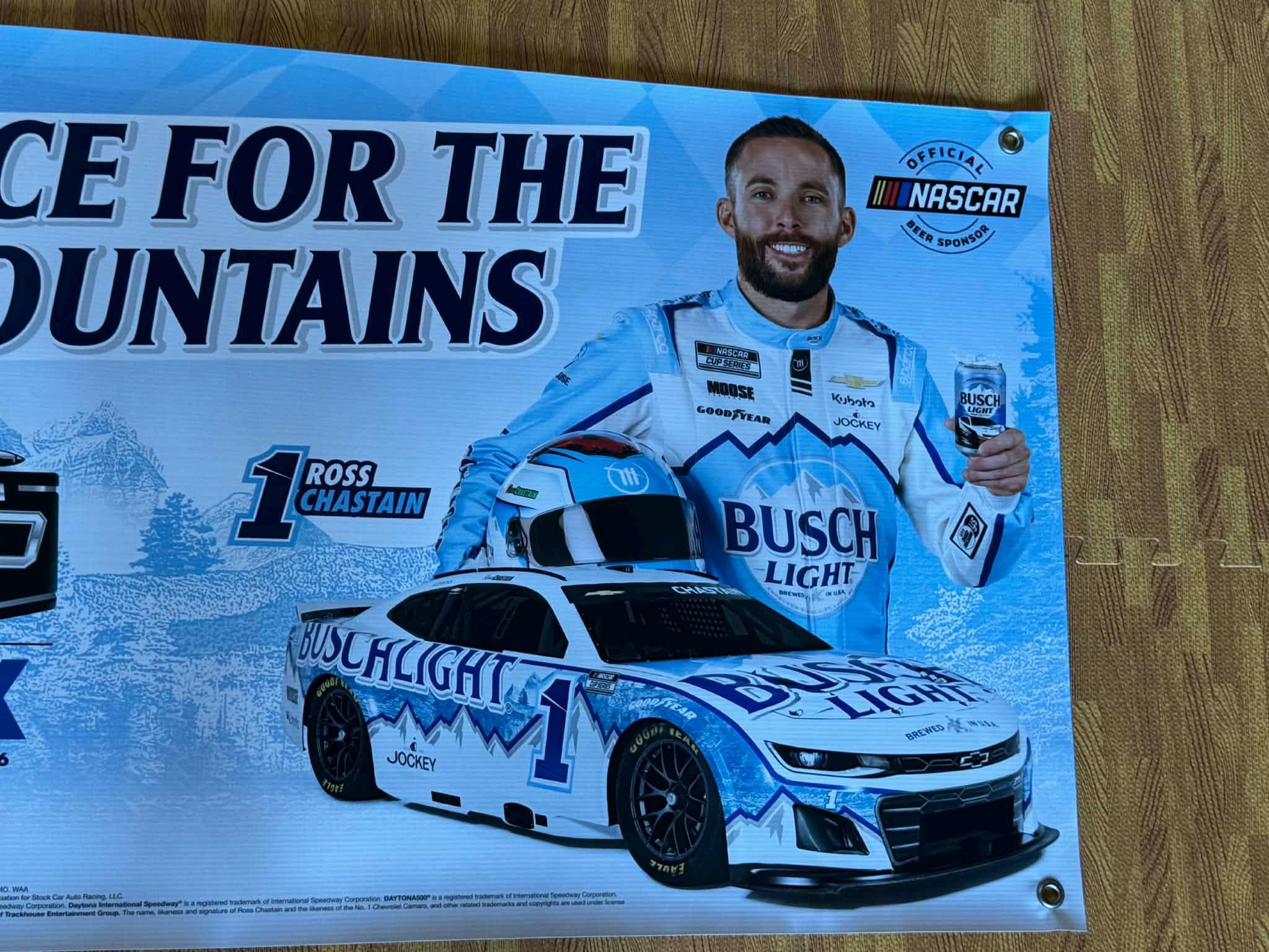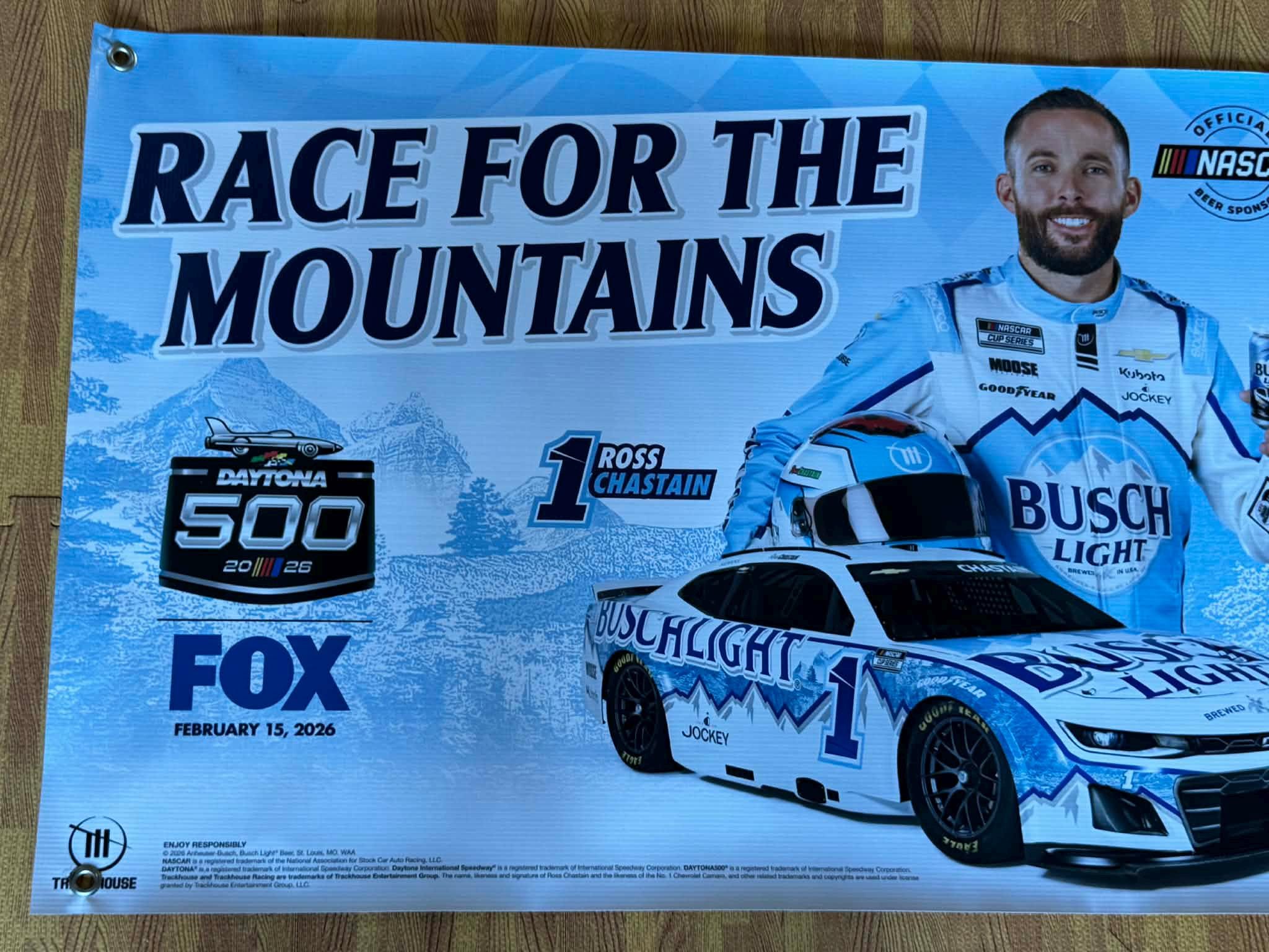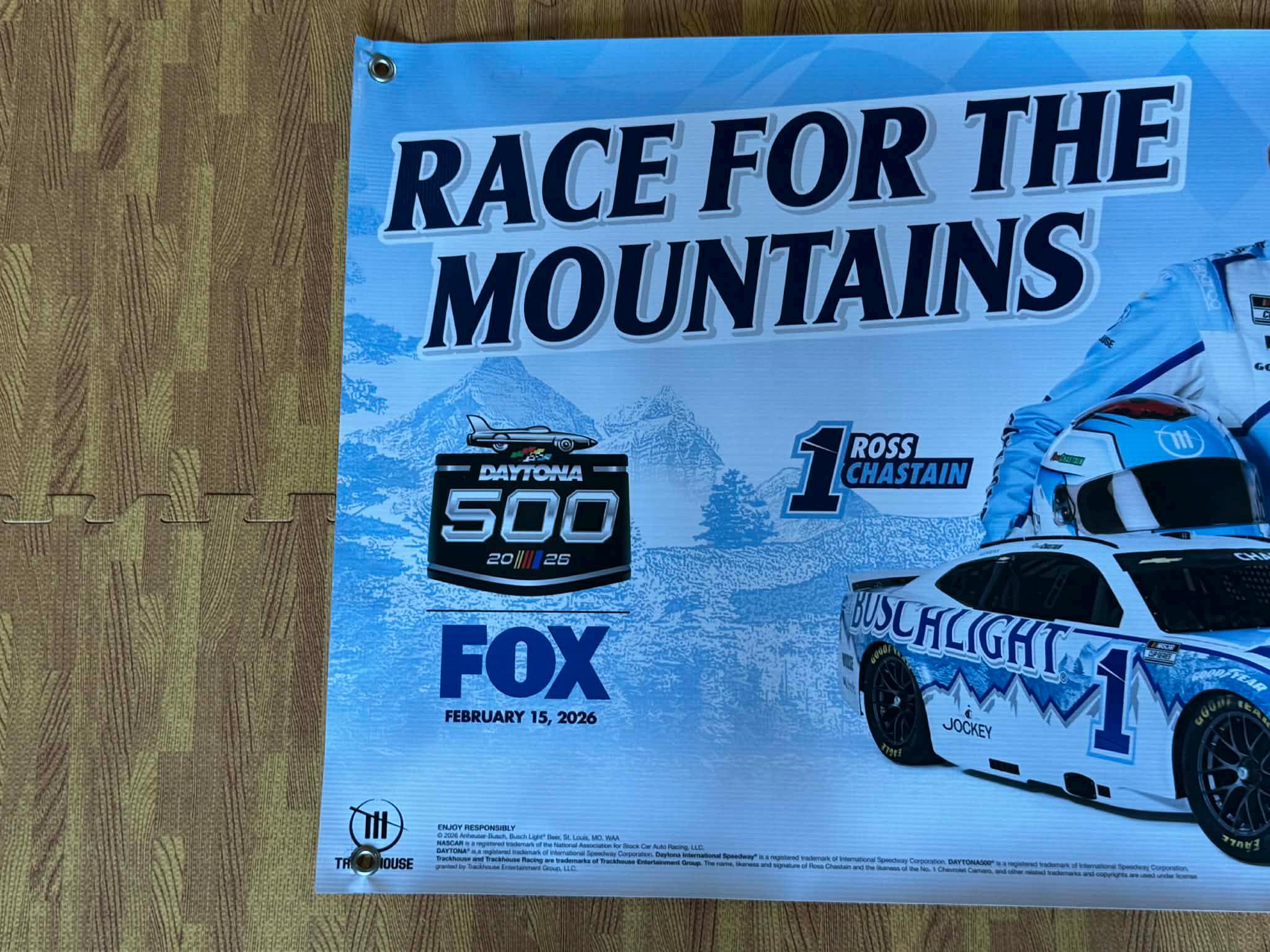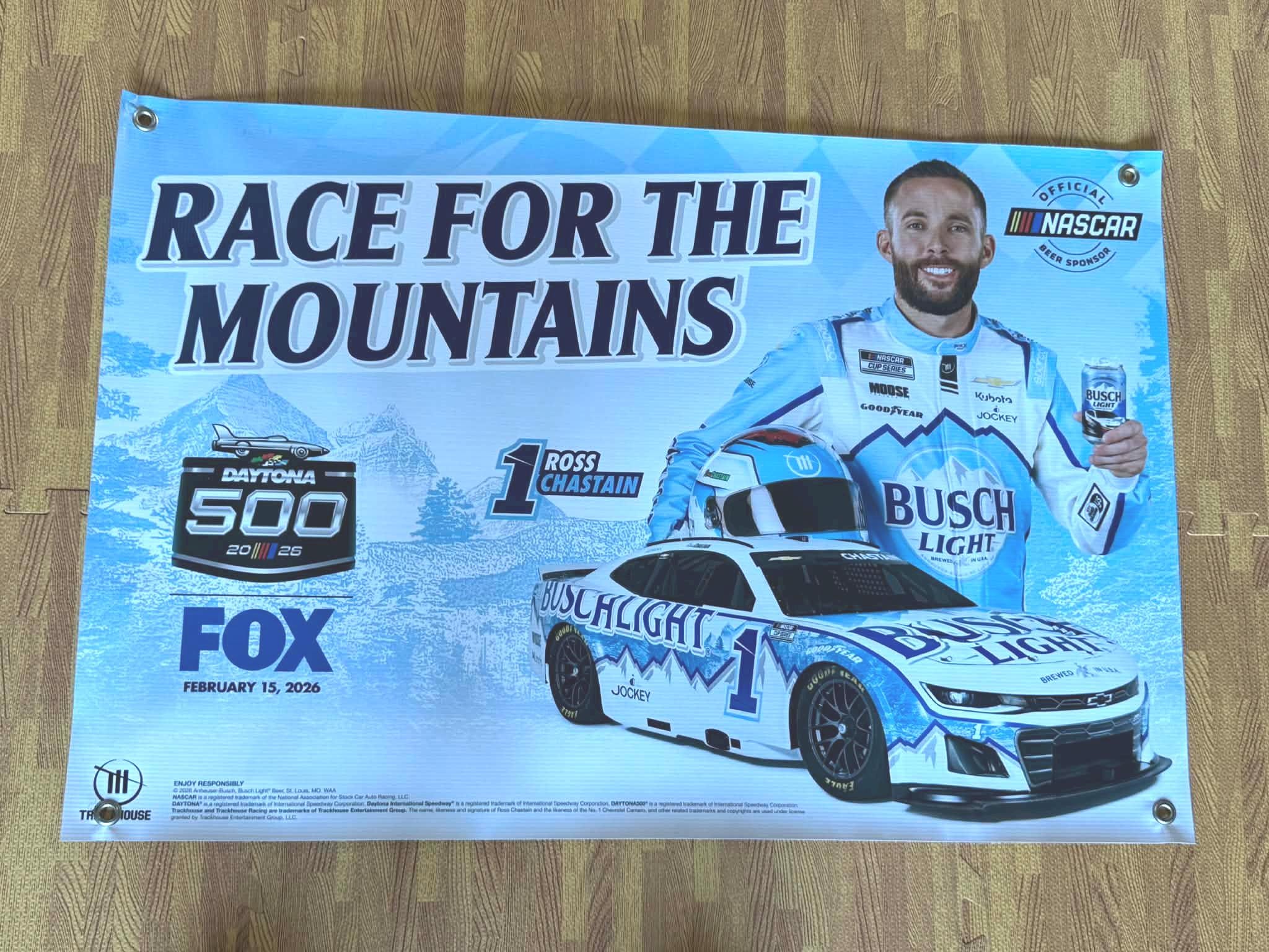 Bold racing-themed vinyl banner featuring “Race For The Mountains” artwork with stock car racing imagery and mountain-inspired design elements. This banner delivers high-energy motorsports style and beer-themed decor that looks great in garages, mancaves, race rooms, and bar spaces.
