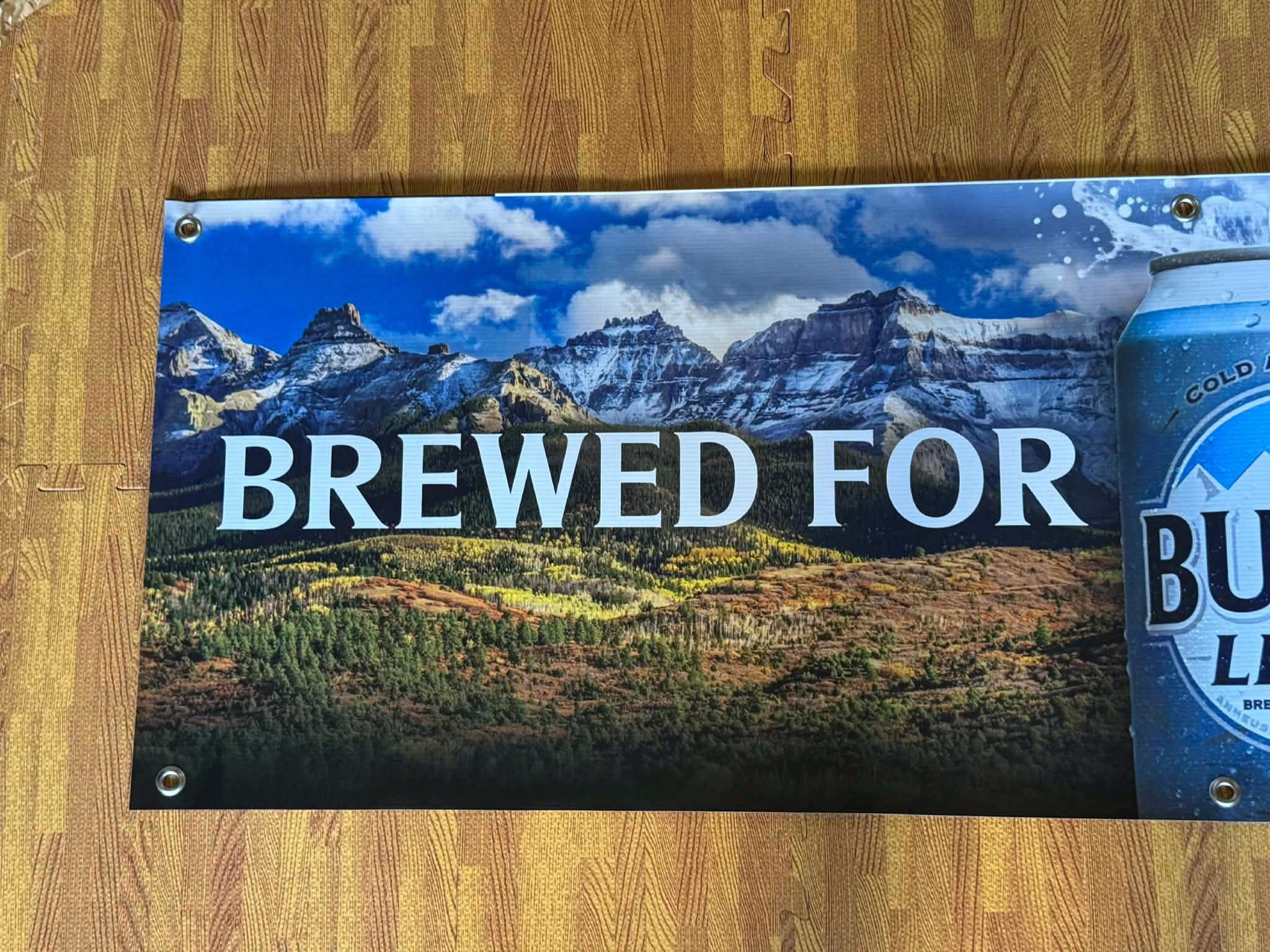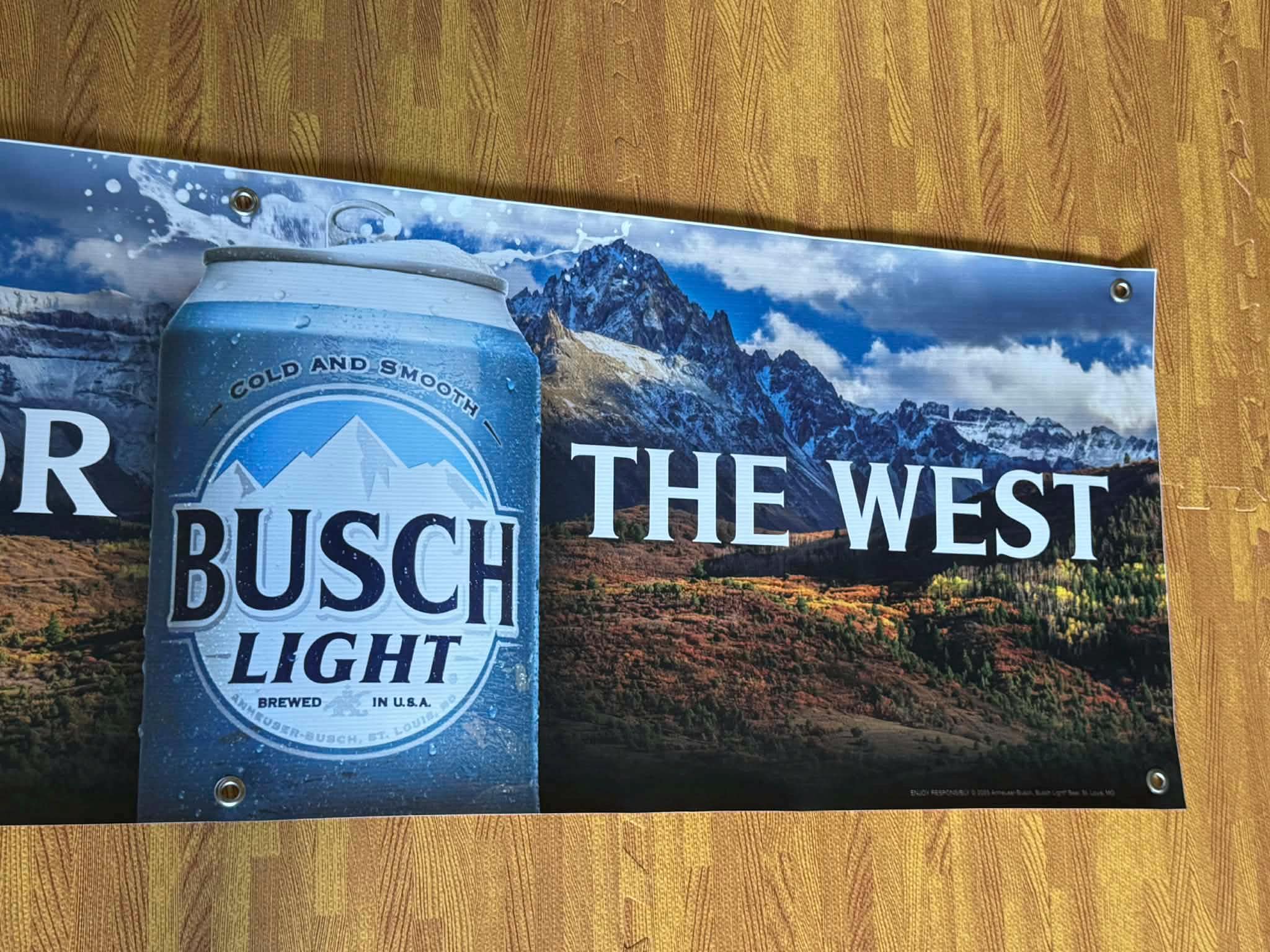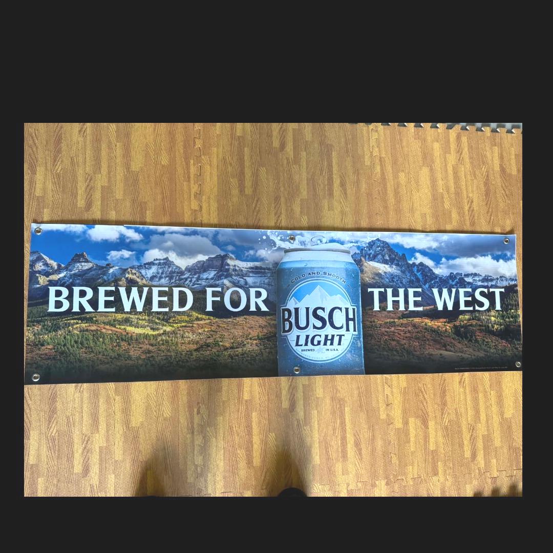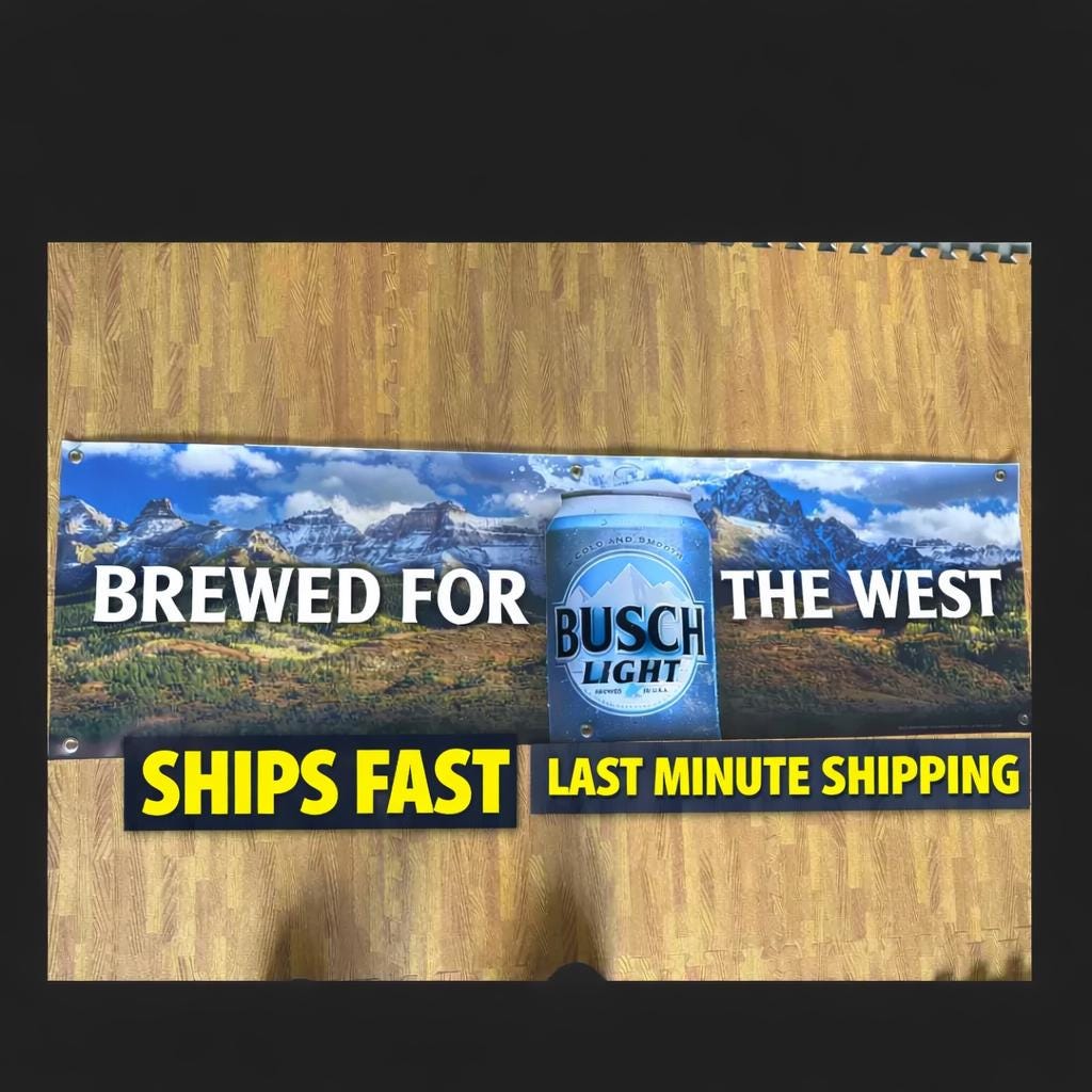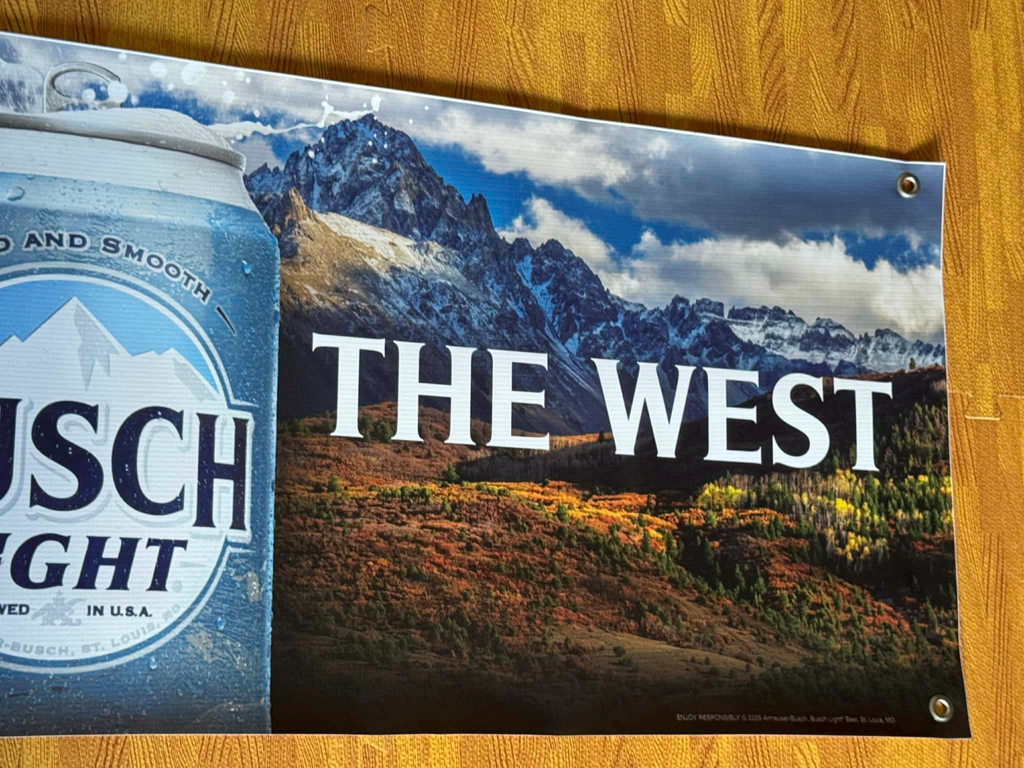 Large Busch Light themed vinyl banner featuring the bold “Brewed For The West” slogan with mountain scenery and beer can artwork. This wide-format banner delivers strong outdoor, western, and beer-inspired style—perfect for adding character to bars, garages, and mancaves.
