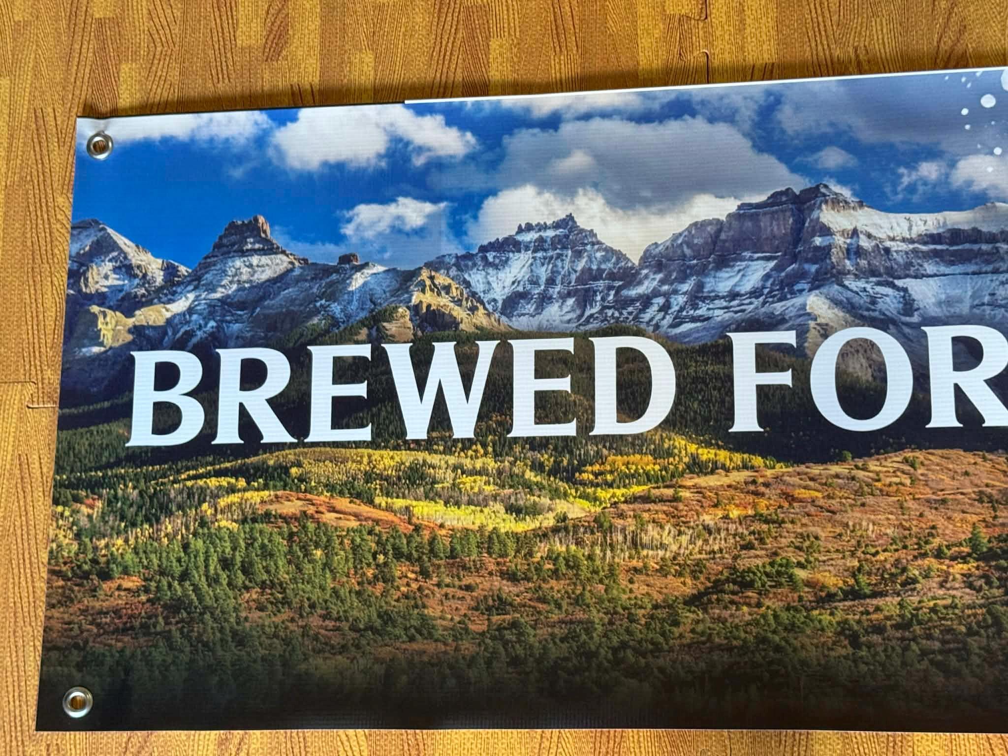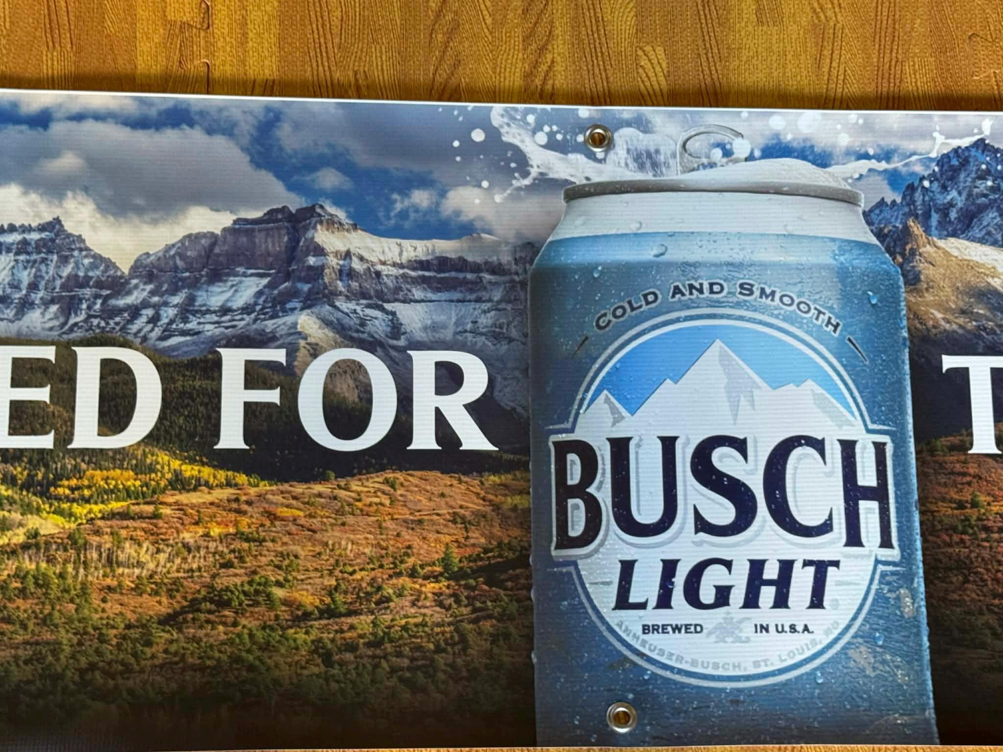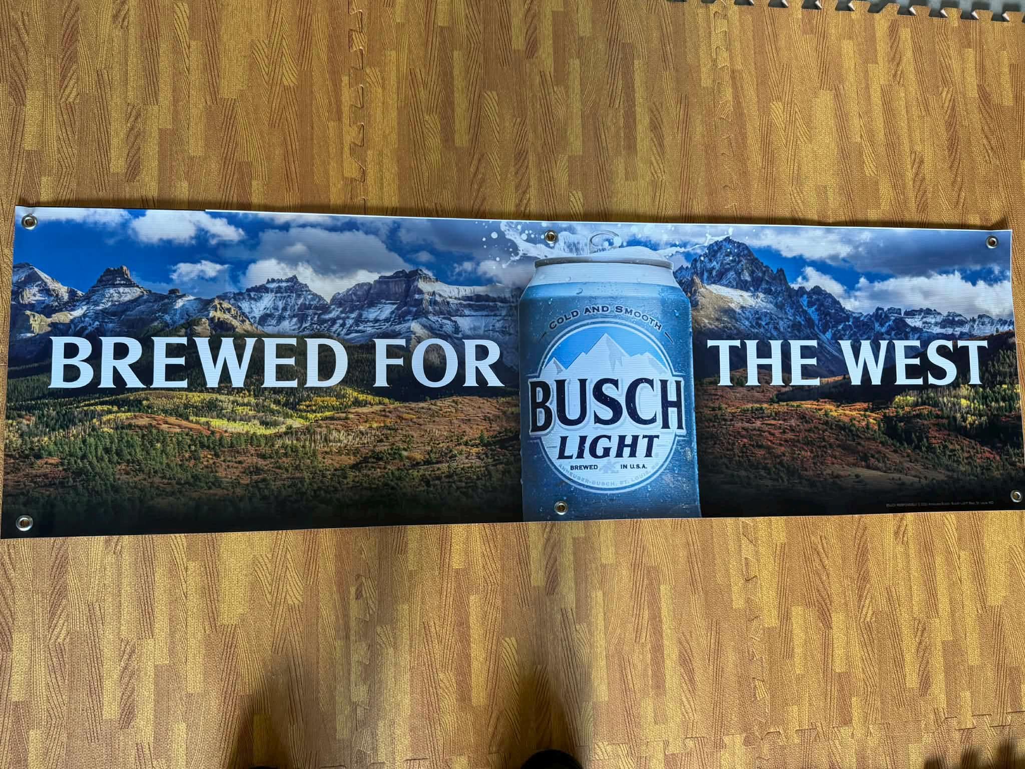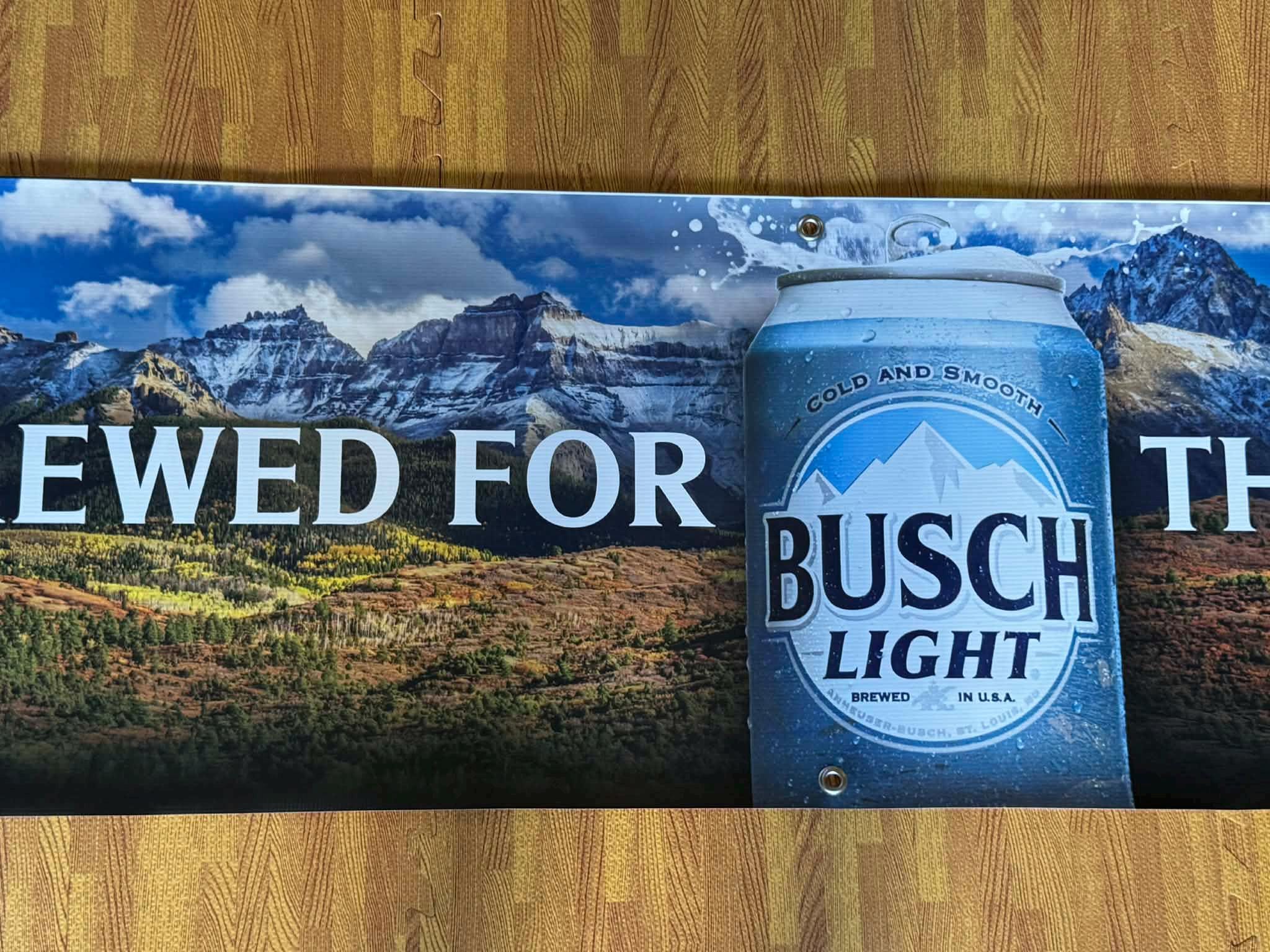 Large Busch Light themed vinyl banner featuring the bold “Brewed For The West” slogan with mountain scenery and beer can artwork. This wide-format banner delivers strong outdoor, western, and beer-inspired style—perfect for adding character to bars, garages, and mancaves.