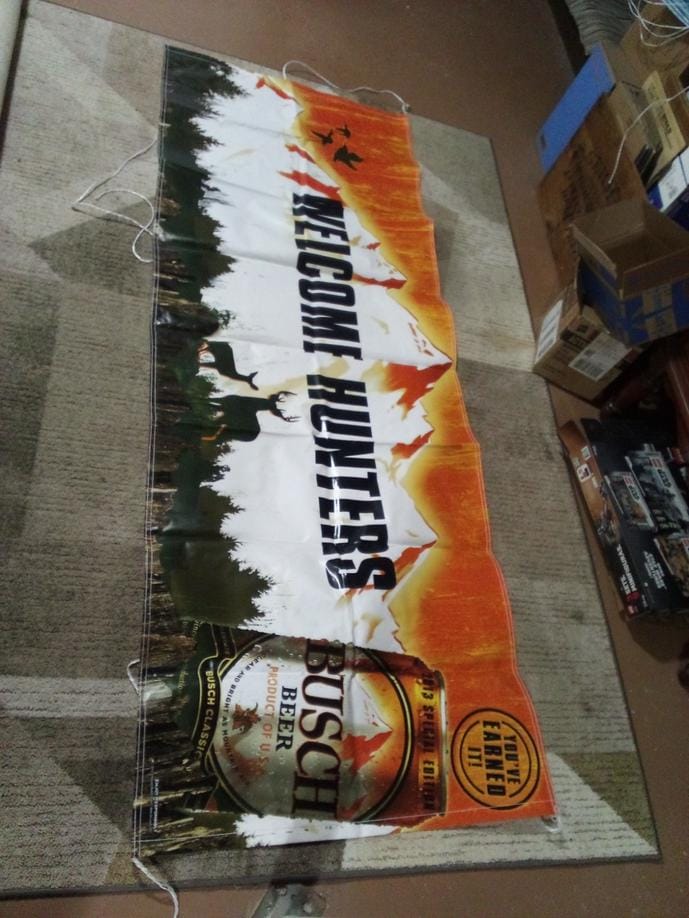 This is NOS (New Old Stock) promotional-style decor made from durable PVC plastic, designed for repeated seasonal use. The banner includes pre-installed hanging strings, making setup quick and easy on fences, cabins, sheds, or walls.