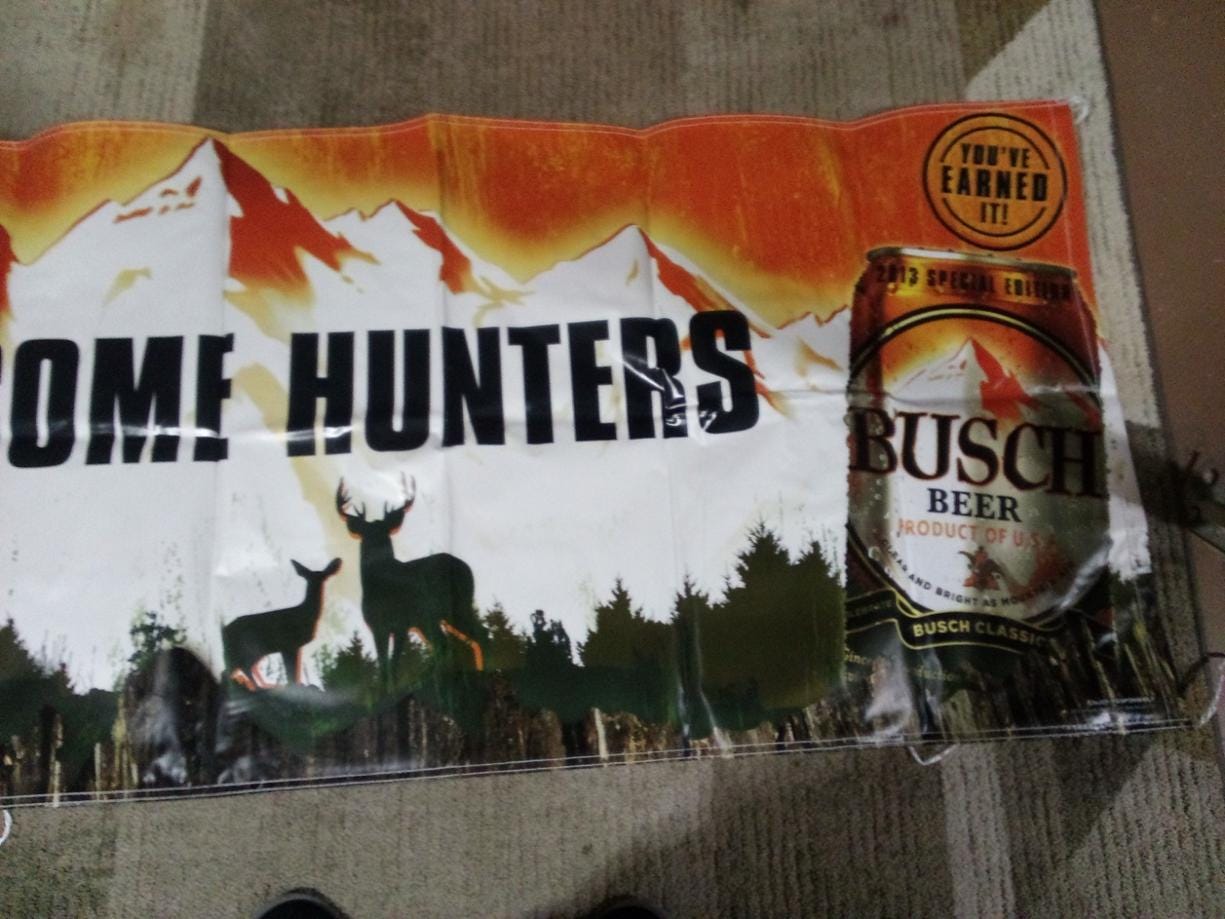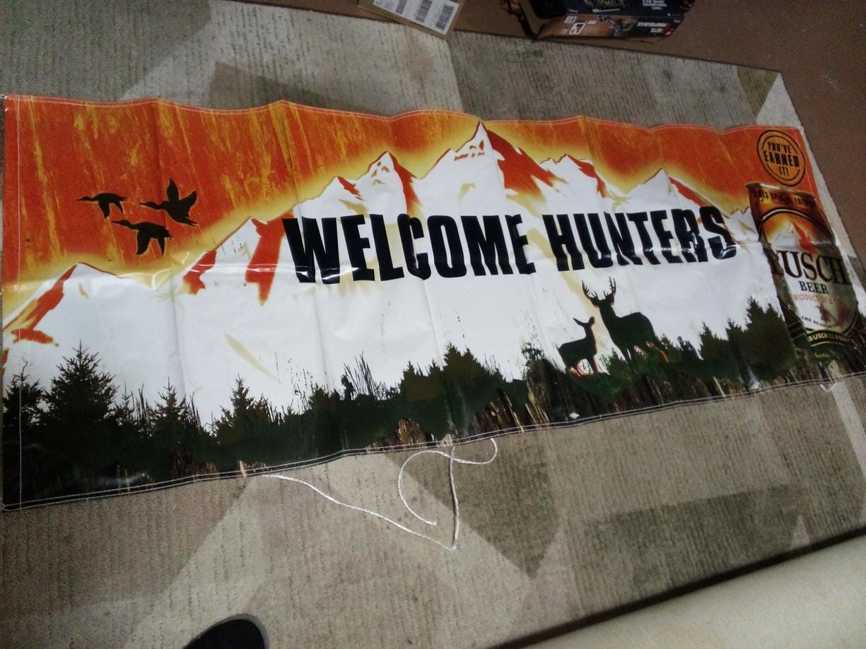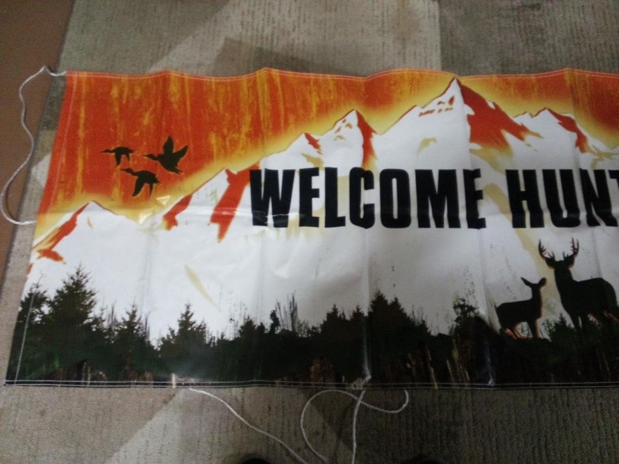 Large “Welcome Hunters” outdoor banner featuring a rugged mountain landscape, deer silhouettes, and flying ducks — perfect for hunting camps, cabins, lodges, garages, and seasonal outdoor displays.
