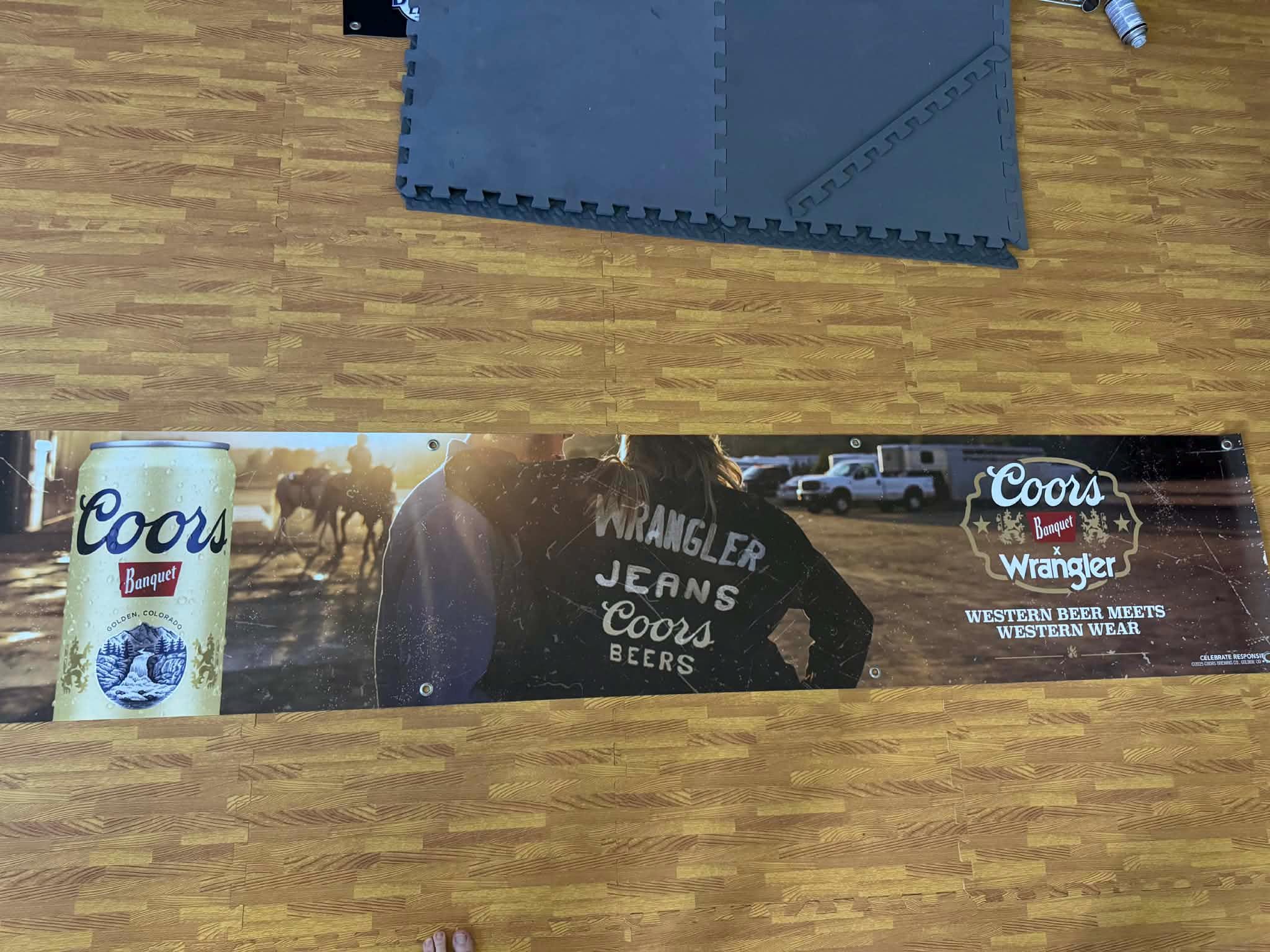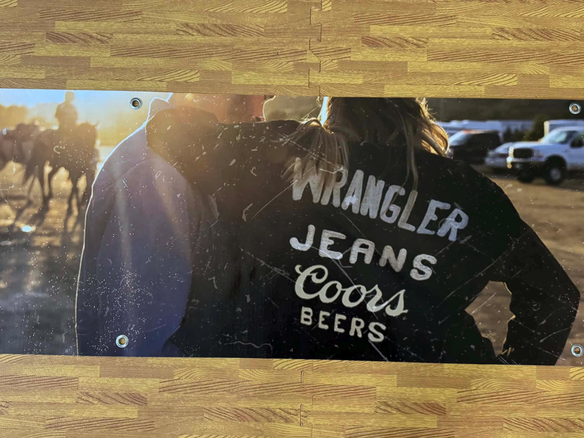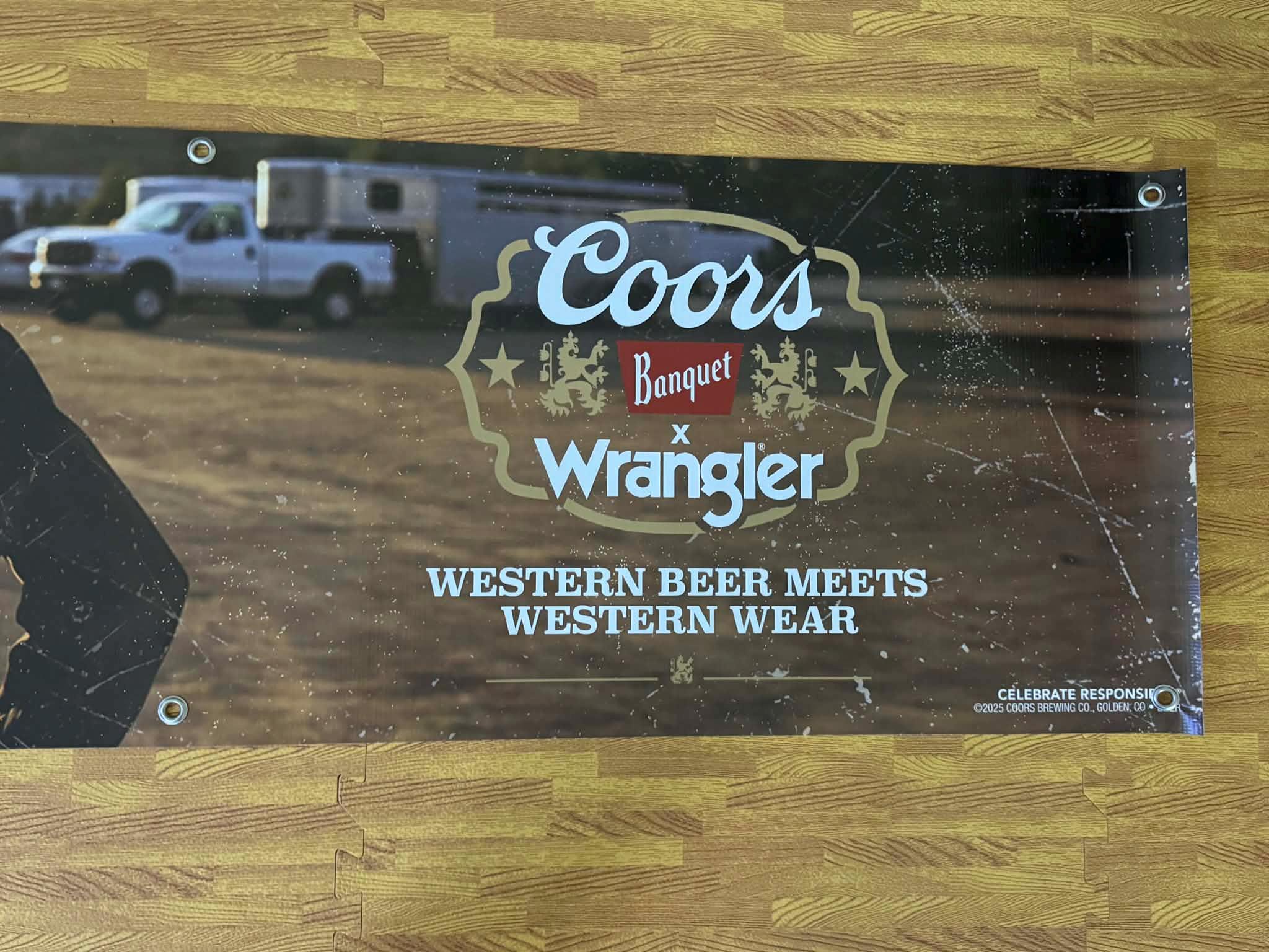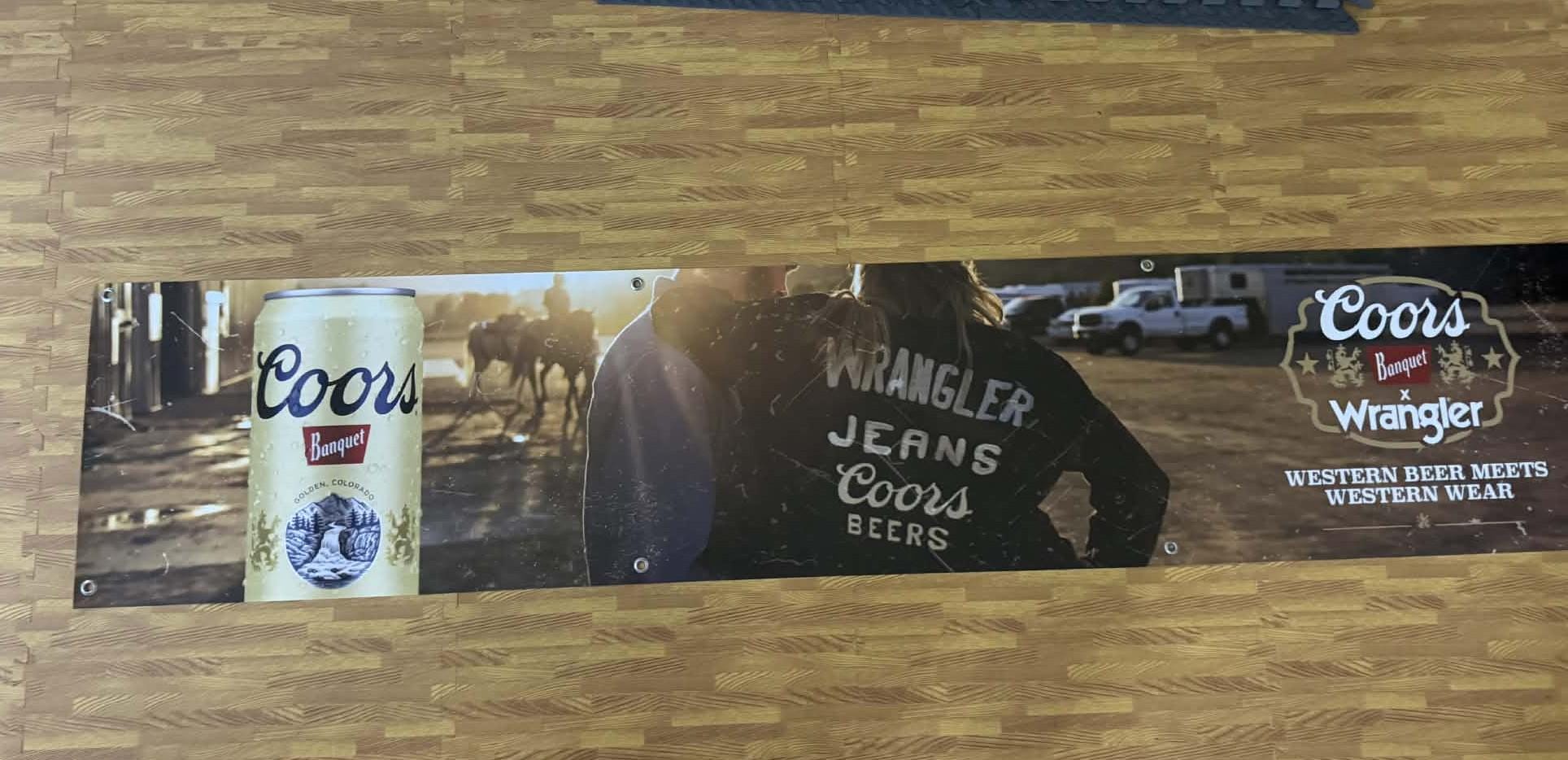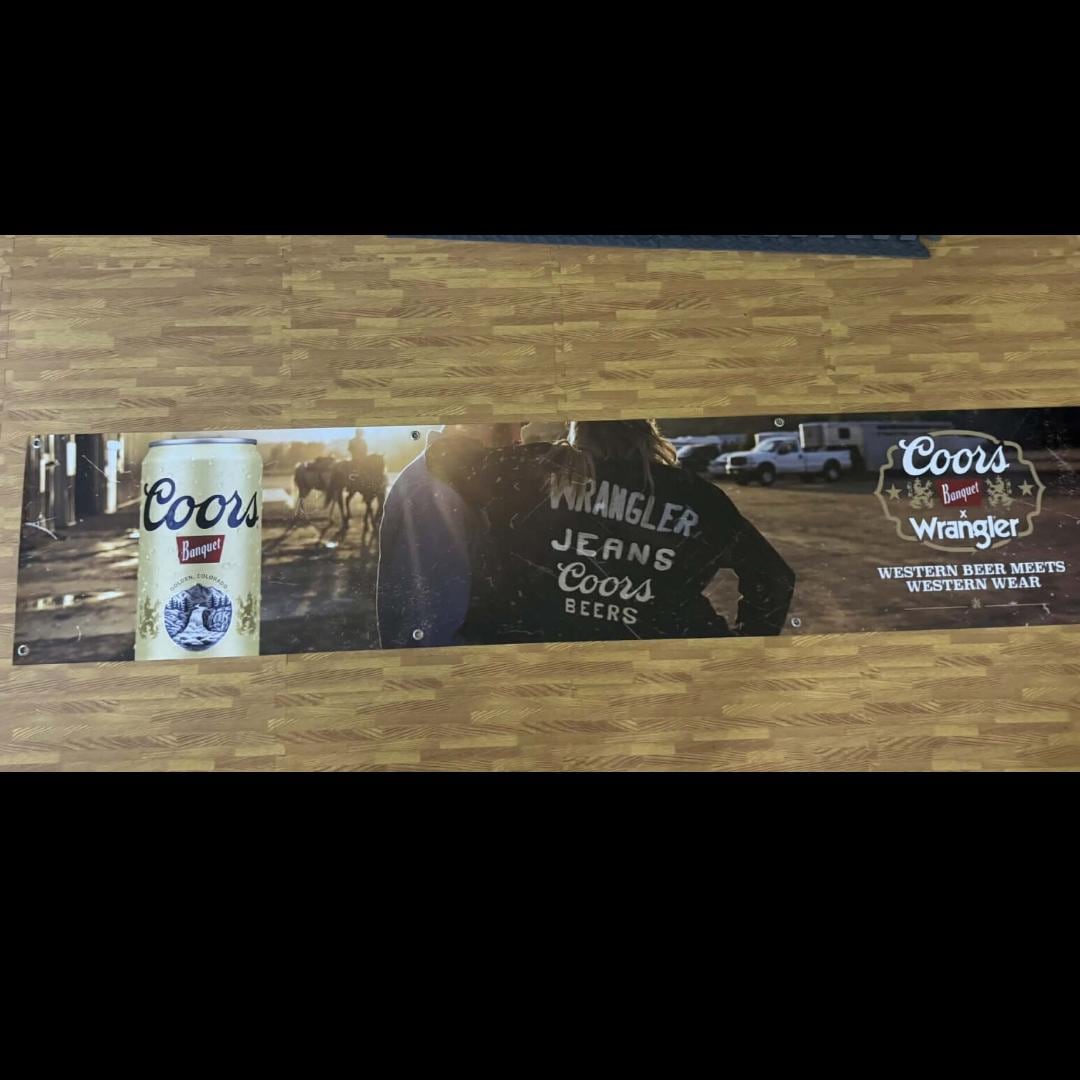 Add bold western character to your space with this NEW Coors Banquet x Wrangler wall banner. Featuring classic Coors Banquet beer imagery paired with rugged Wrangler western styling, this long-format banner is perfect for wide wall spaces in a mancave, garage bar, shop, barn, or home bar.