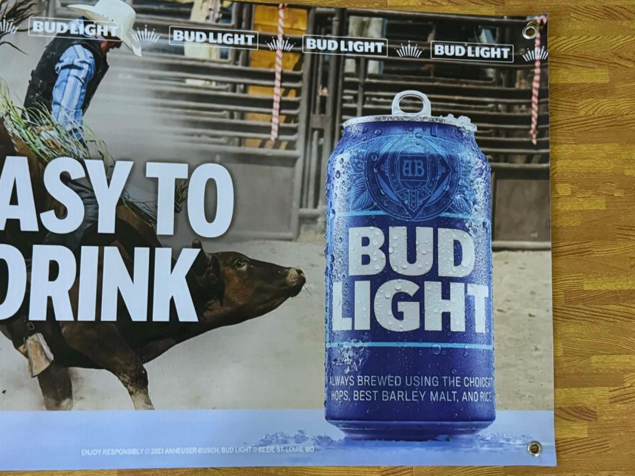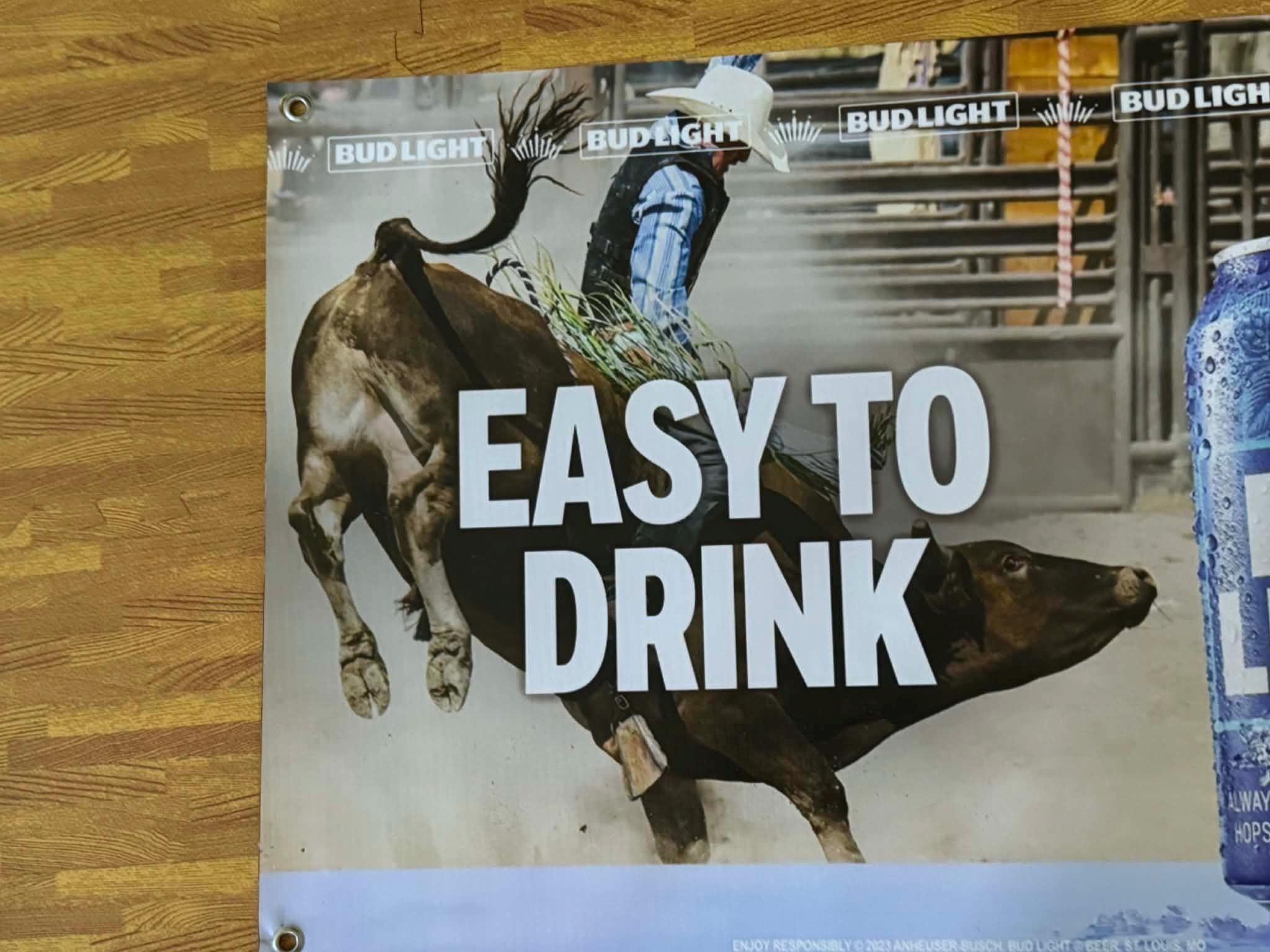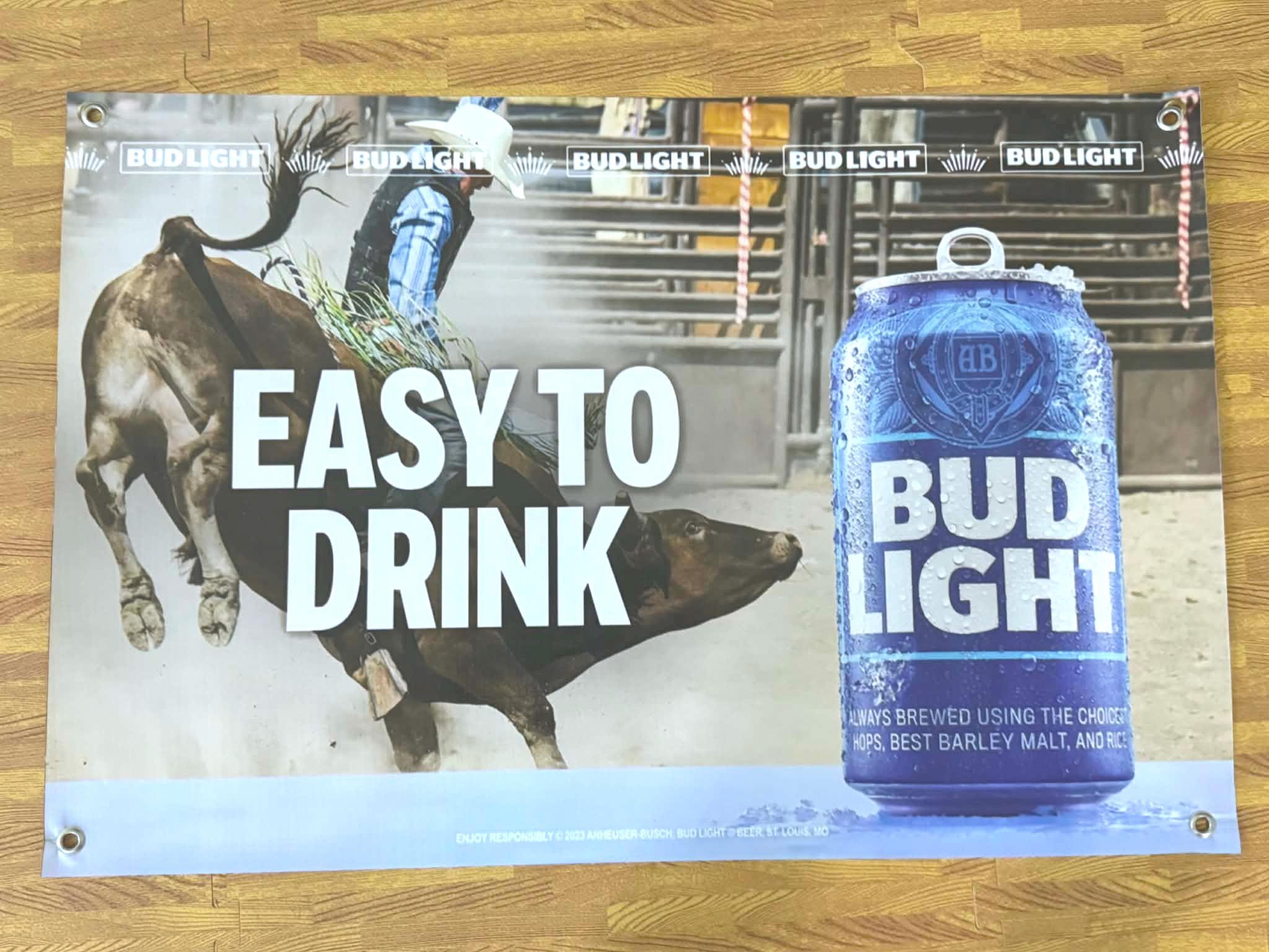 Bring western rodeo energy to your space with this NEW Bud Light “Easy To Drink” vinyl banner. Featuring a dramatic bull riding scene paired with an oversized Bud Light can graphic, this banner delivers bold cowboy, rodeo, and beer-themed style that stands out on any wall.