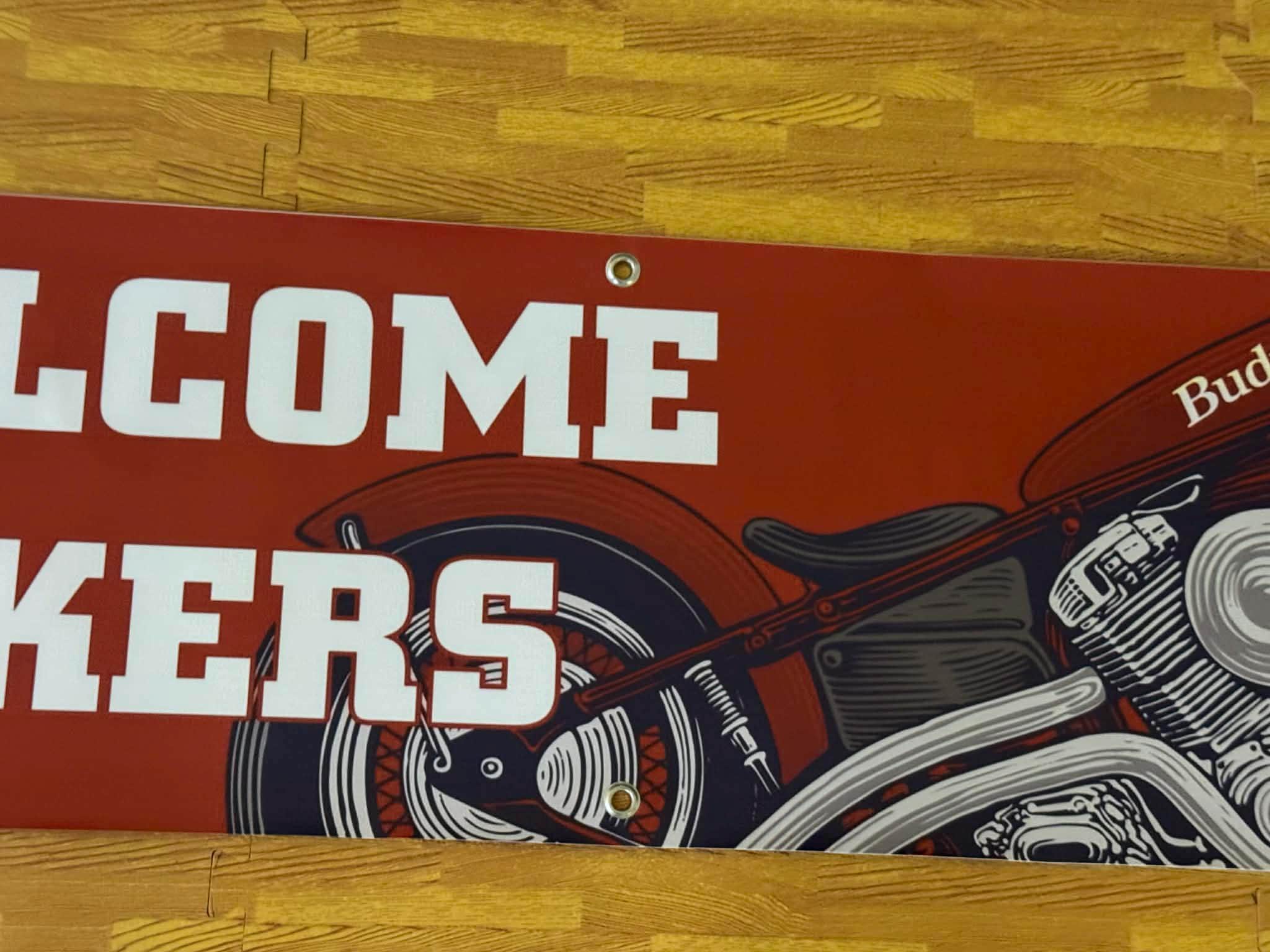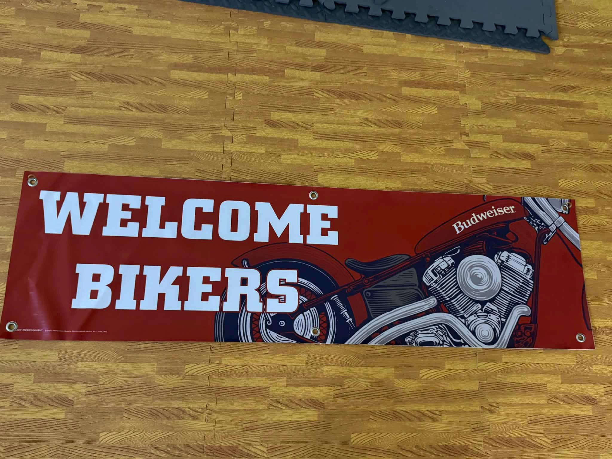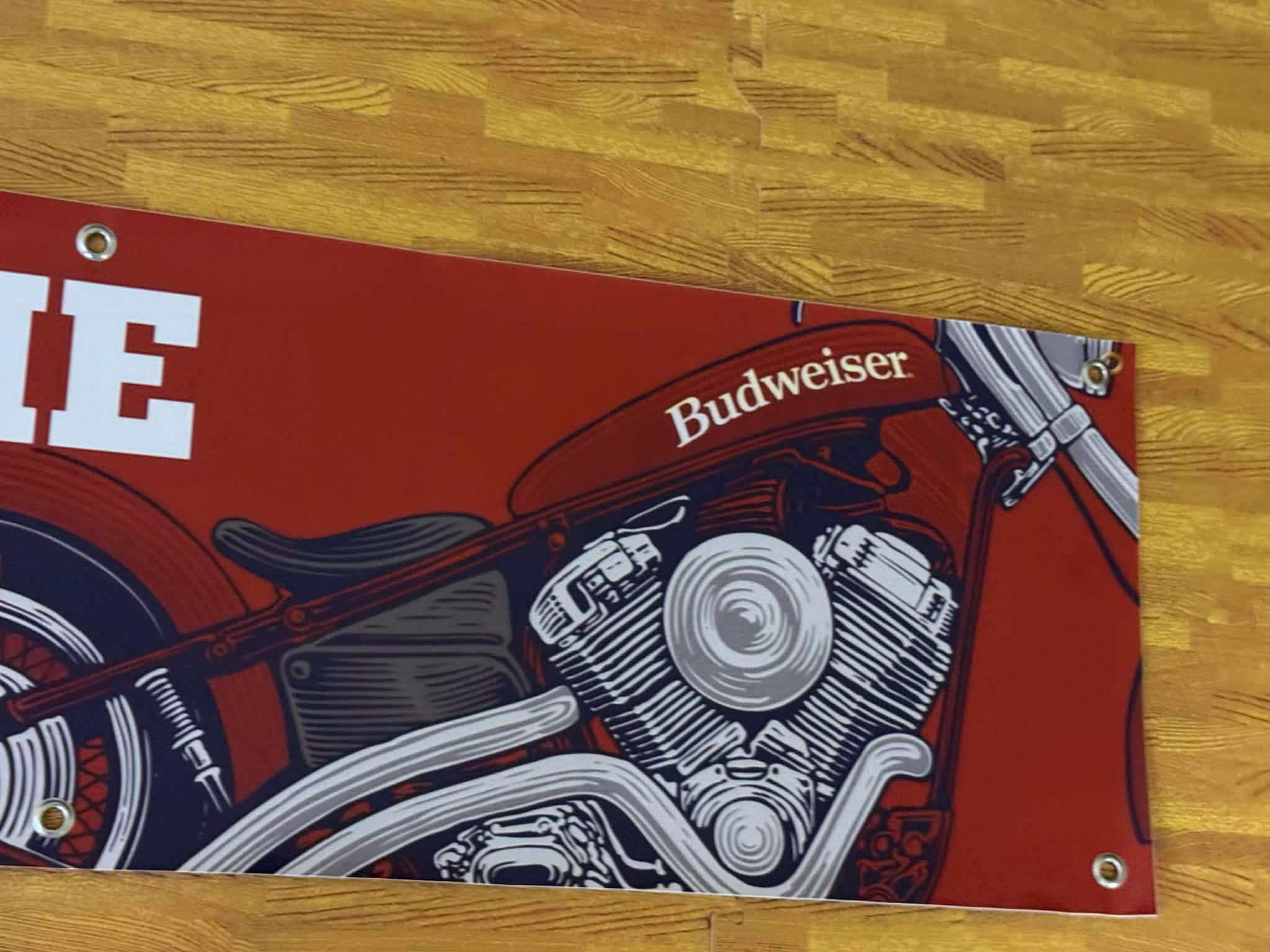 dd bold motorcycle attitude to your space with this NEW Budweiser “Welcome Bikers” vinyl banner. Featuring a classic red background with a detailed motorcycle engine graphic, this banner is perfect for biker garages, motorcycle shops, mancaves, bars, and man cave walls.