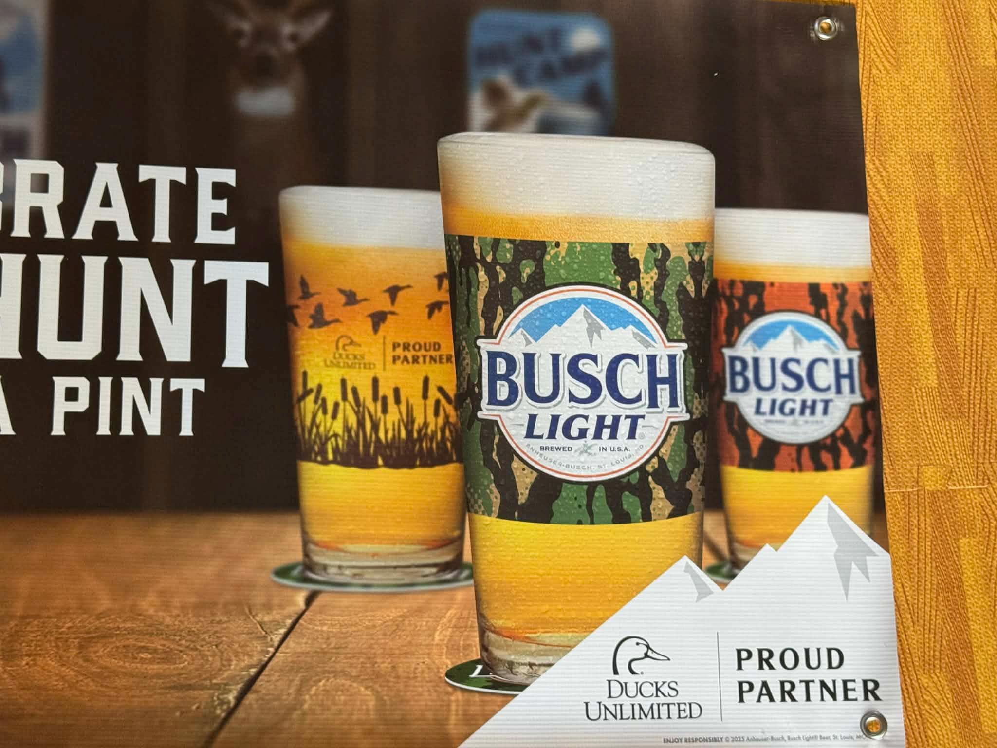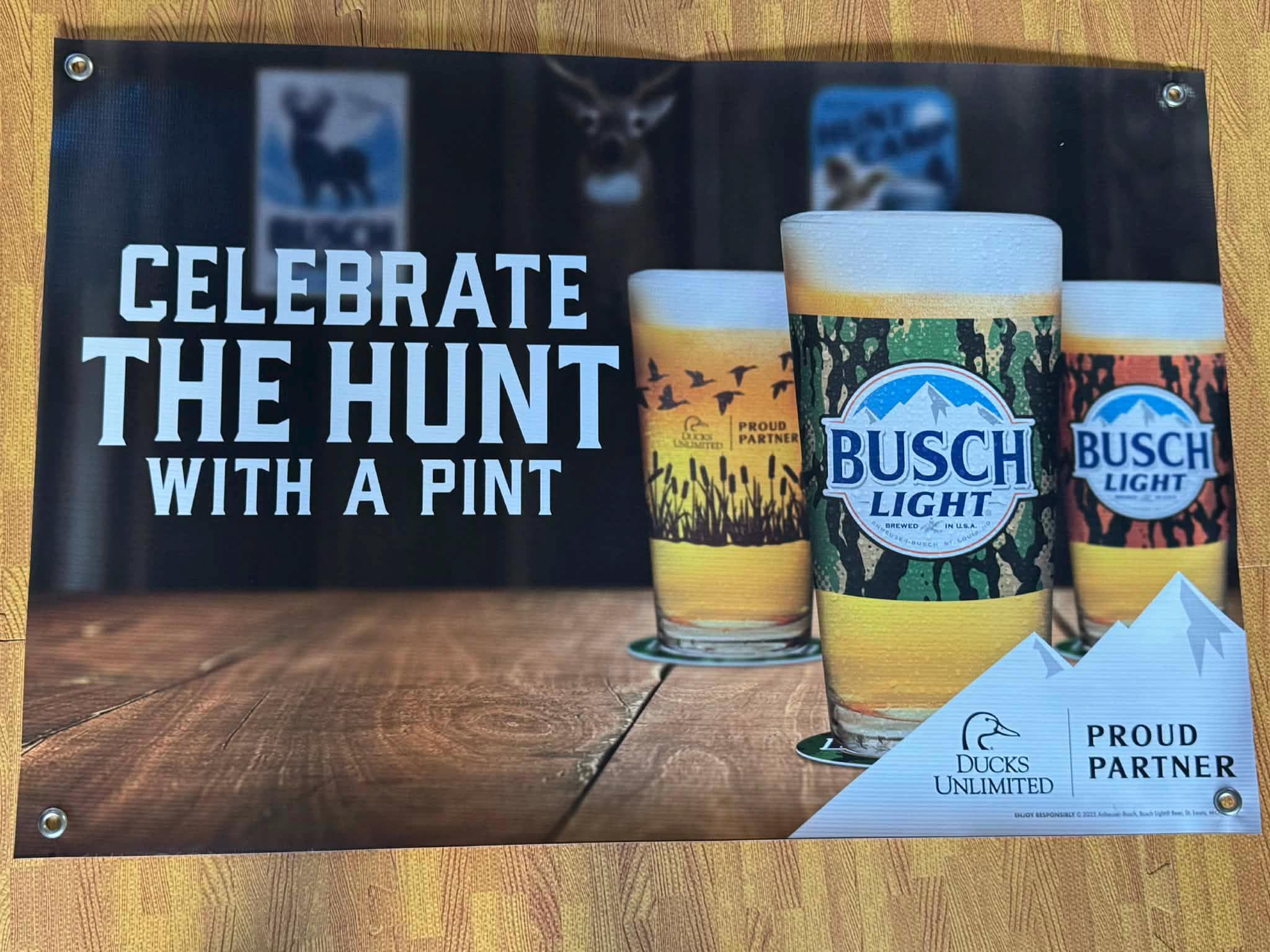 Add a bold hunting vibe to your space with this Busch Light “Celebrate the Hunt” vinyl banner. Featuring a camo-style Busch Light can set in a classic outdoor camp scene, this banner is perfect for hunters, outdoorsmen, and Busch Light fans.