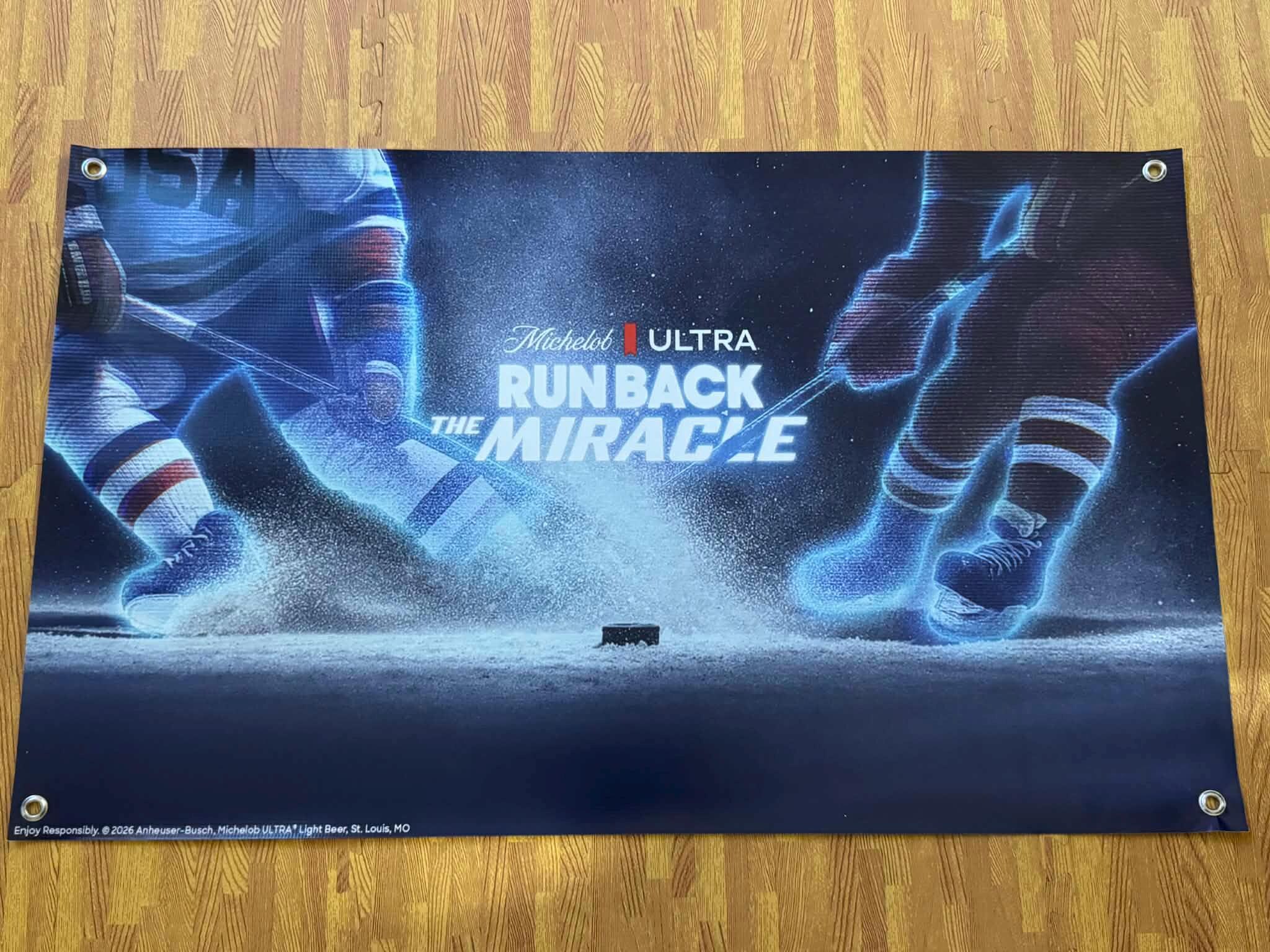 Add high-energy sports atmosphere to your space with this Michelob Ultra hockey-themed banner, featuring dramatic action imagery and bold “Run Back The Miracle” graphics. Designed with a modern, icy blue aesthetic, this piece delivers a powerful statement for sports fans and beer decor collectors alike.