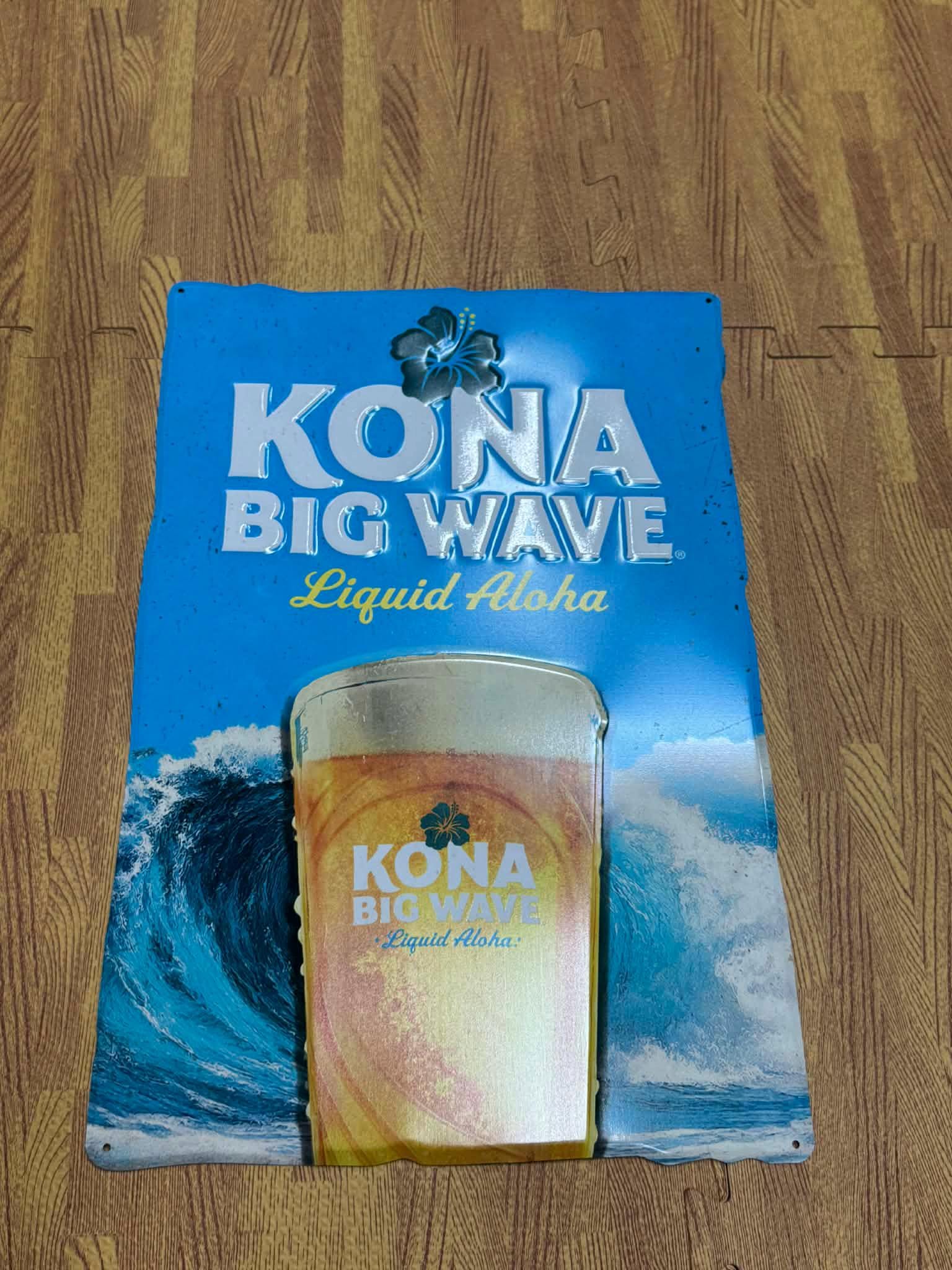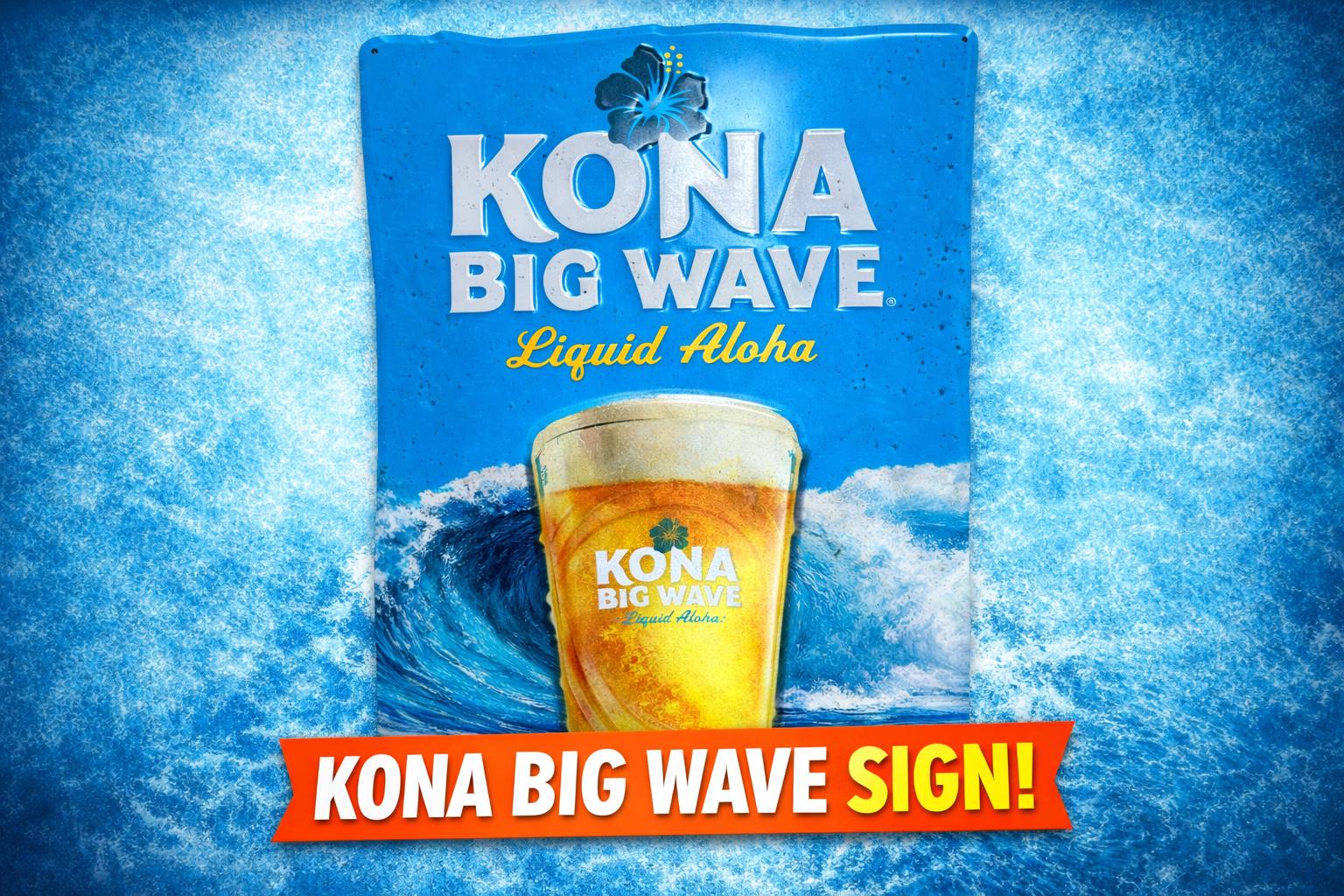 Bring island vibes to your space with this Kona Big Wave “Liquid Aloha” tin sign, featuring bold tropical colors, crashing ocean waves, and a classic Big Wave beer graphic.
