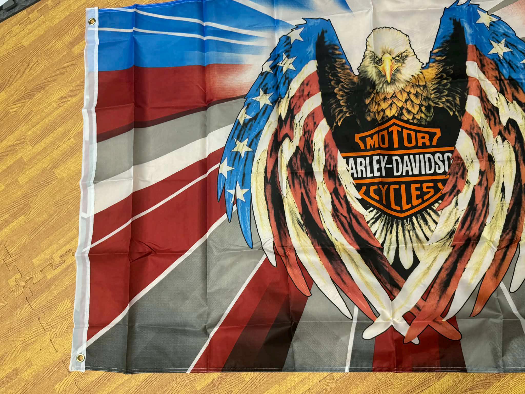 Show off true American biker pride with this 3x5 ft flag, featuring the iconic Davidson bar & shield paired with a bold American eagle and patriotic design.
