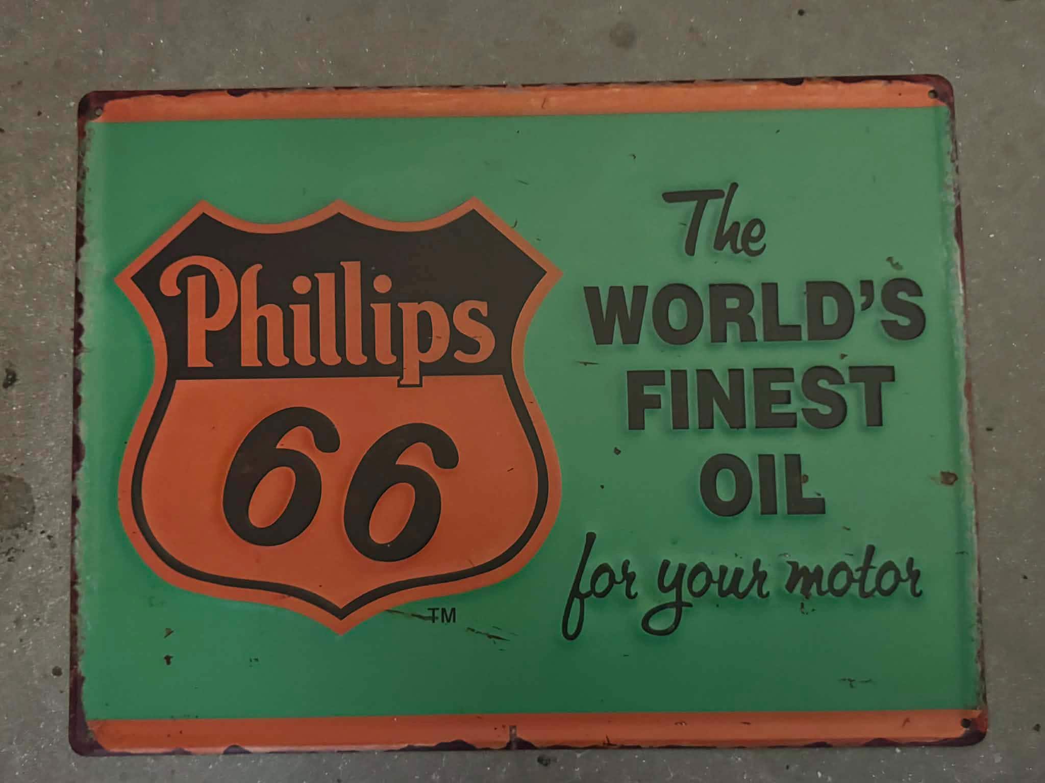 Add classic gas station style to your space with this Phillips 66 World’s Finest Oil tin sign. Featuring the iconic shield logo and bold green background, this piece delivers timeless oil & gas appeal with a distressed, retro look.