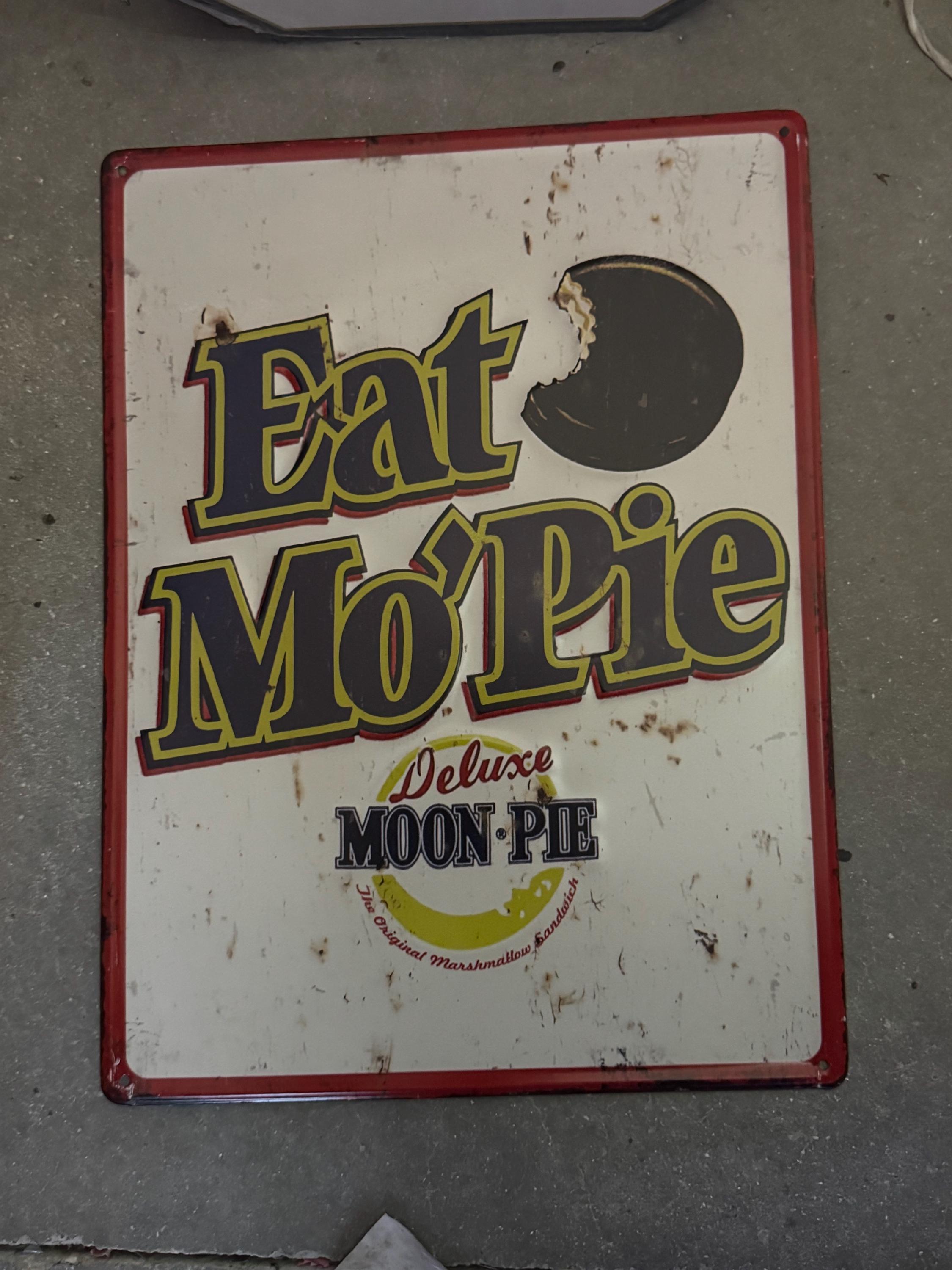 Add classic Americana charm to your space with this Moon Pie metal tin sign, featuring the iconic “Eat mo pie” design and vintage-style graphics.