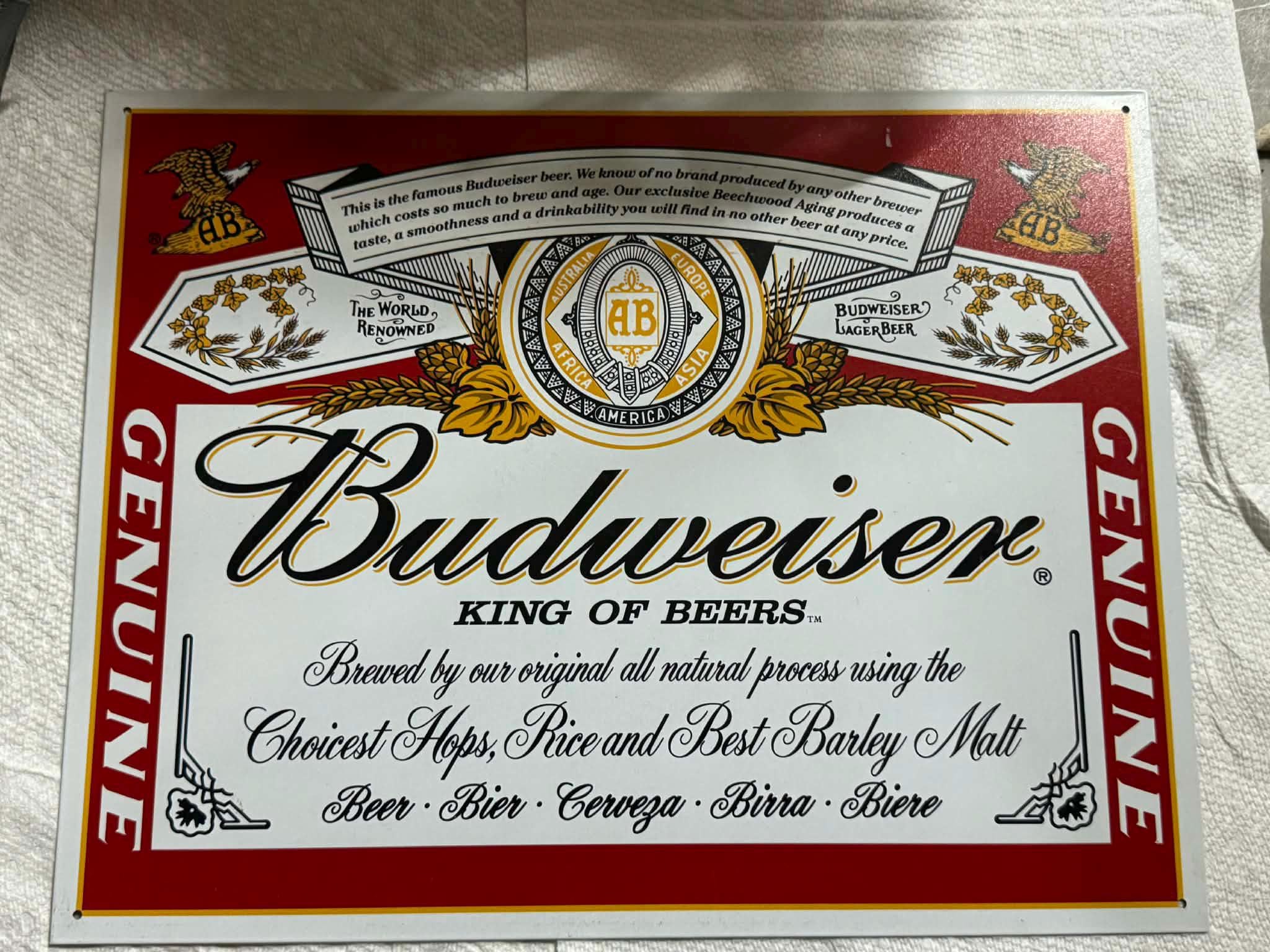 This Budweiser “Genuine” tin sign dates to 2001 and features the iconic red, white, and gold Budweiser label artwork with the classic “King of Beers” branding. Inspired by early Budweiser packaging, this sign delivers a timeless look while being an original licensed piece from the early 2000s.