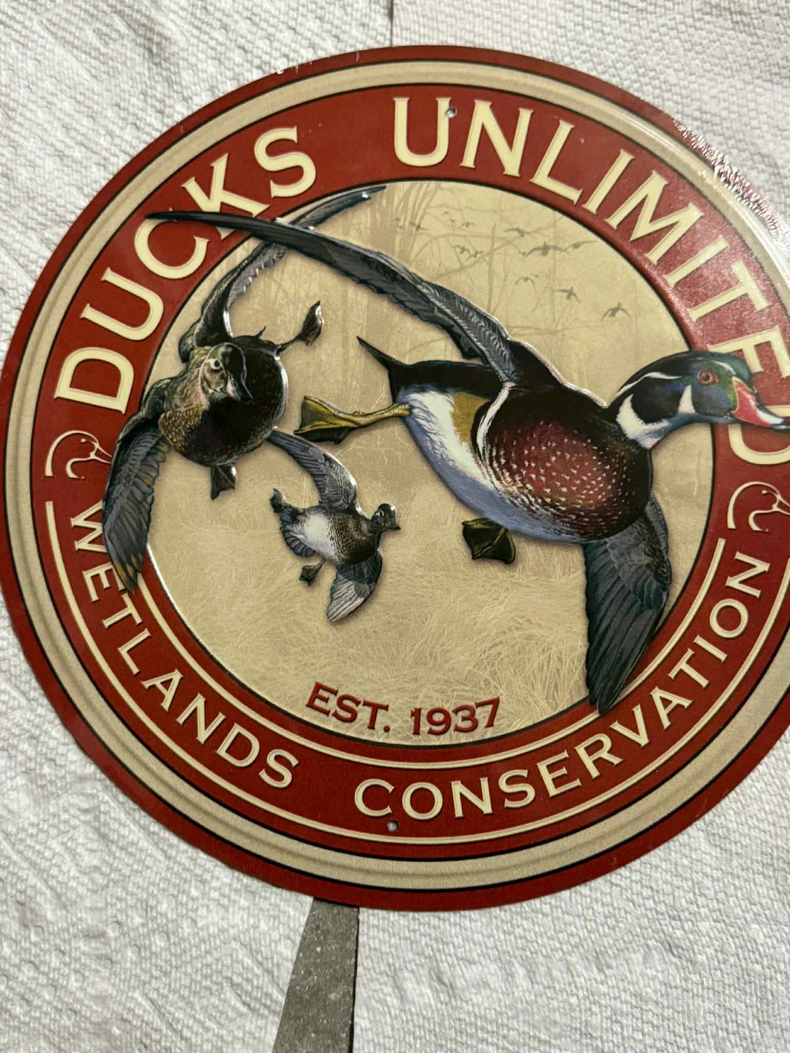 Official Ducks Unlimited wildlife art tin featuring three wood ducks in flight, one of the most iconic and collectible waterfowl designs ever released.
